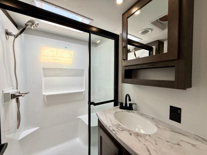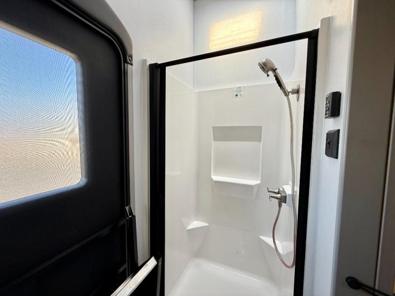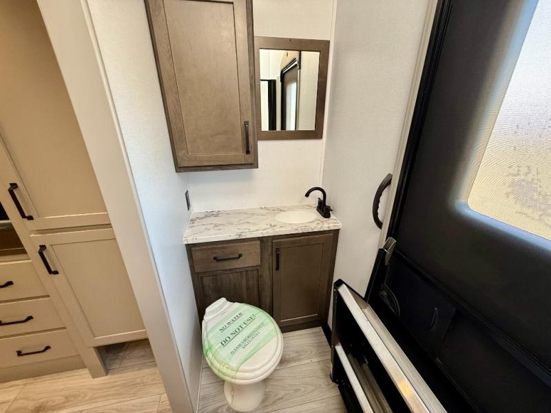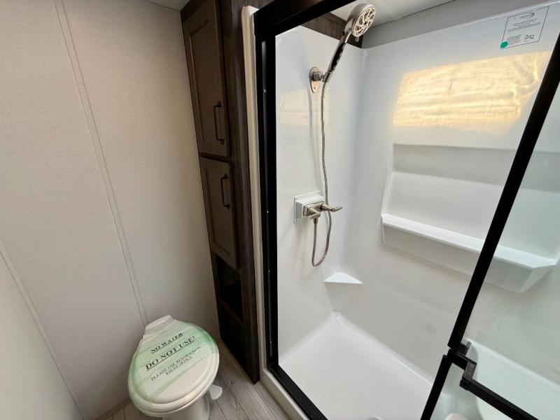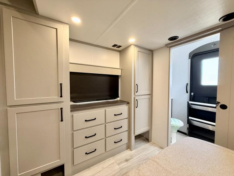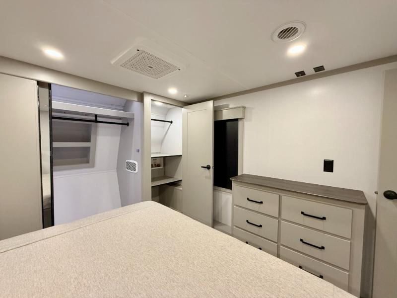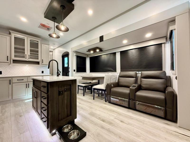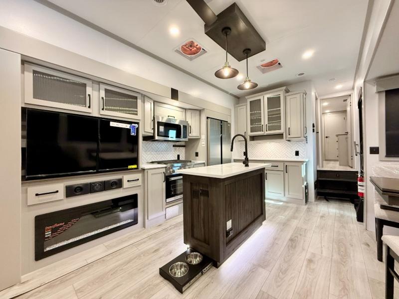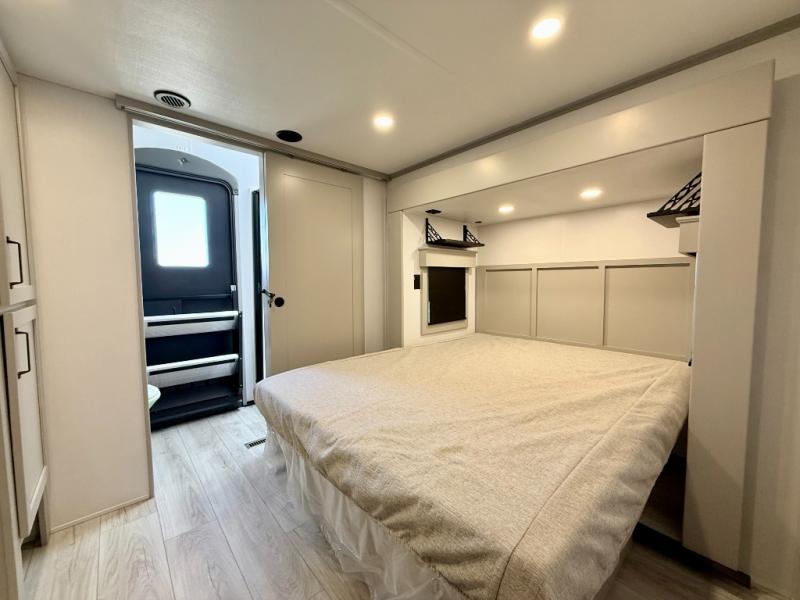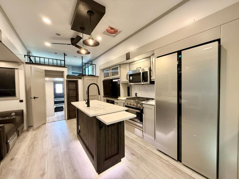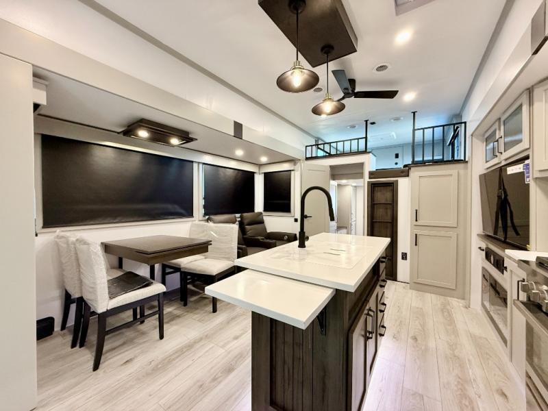 Two full bathrooms and two private bedrooms make this fifth wheel perfect for camping with friends and family. The front bedroom includes a king bed with a queen bed option, a large front wardrobe, plus stackable washer and dryer prep. The rear master bedroom has two closets plus a dresser and underbed storage, plus its own full bath with an exterior entry door for convenience. There is even a loft above the rear bedroom for even more sleeping space! Everyone can meet in the main living area/kitchen to relax on the power theater seat as the chef cooks dinner, and you can watch a show on the Smart HDTV to pass the time. The kitchen island will provide more counter space, along with the hutch that includes overhead cabinets as well. Don't let this luxury fifth wheel slip away!