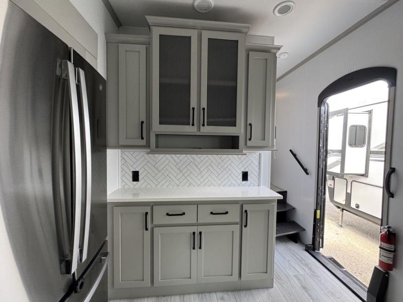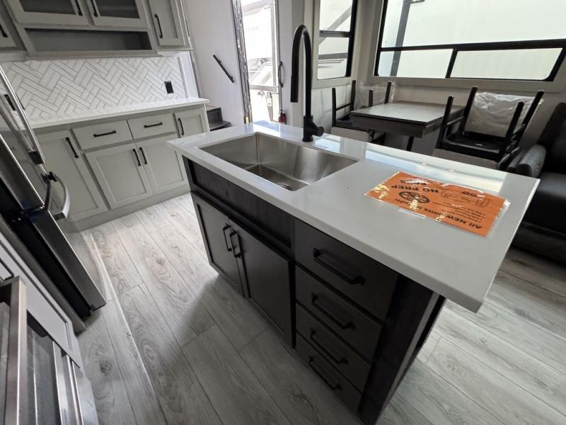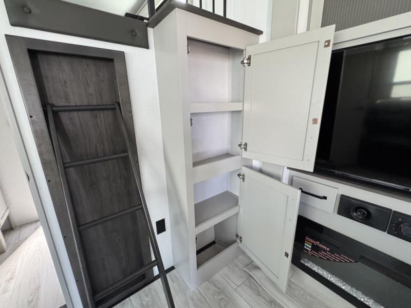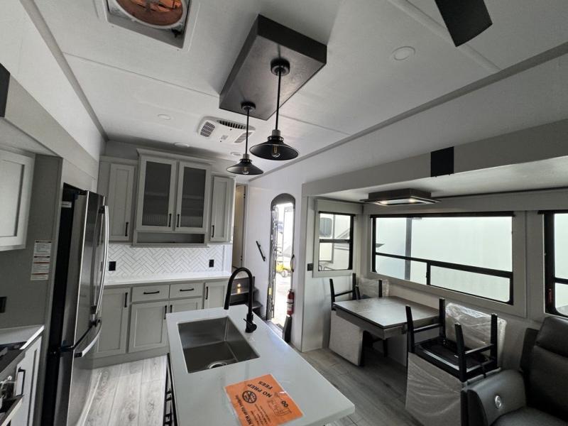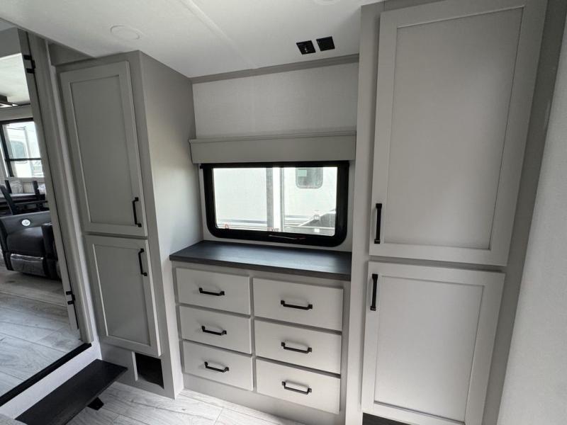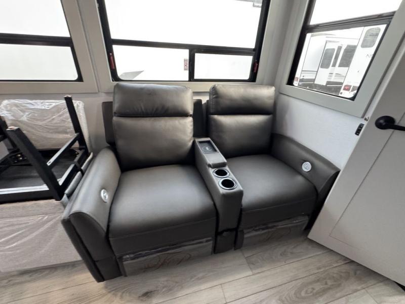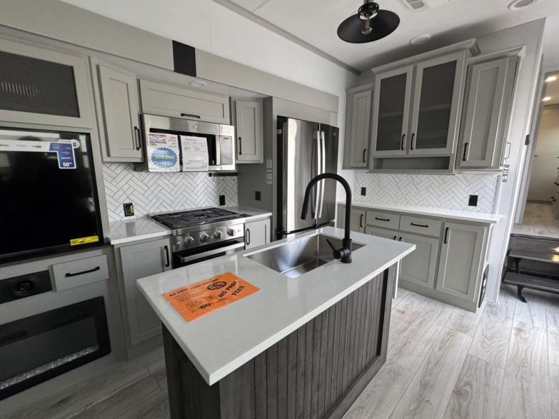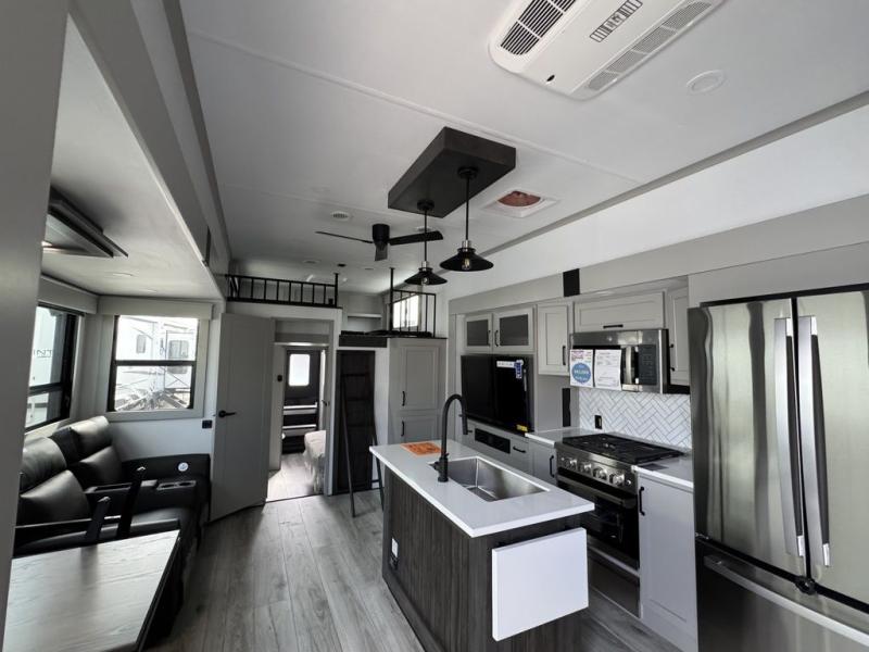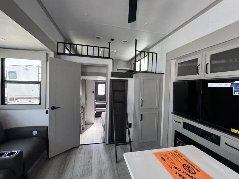 Two full bathrooms and two private bedrooms make this fifth wheel perfect for camping with friends and family. The front bedroom includes a king bed with a queen bed option, a large front wardrobe, plus stackable washer and dryer prep. The rear master bedroom has two closets plus a dresser and underbed storage, plus its own full bath with an exterior entry door for convenience. There is even a loft above the rear bedroom for even more sleeping space! Everyone can meet in the main living area/kitchen to relax on the power theater seat as the chef cooks dinner, and you can watch a show on the Smart HDTV to pass the time. The kitchen island will provide more counter space, along with the hutch that includes overhead cabinets as well. Don't let this luxury fifth wheel slip away!