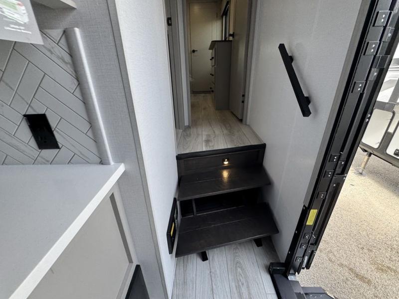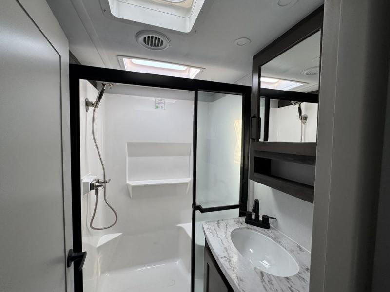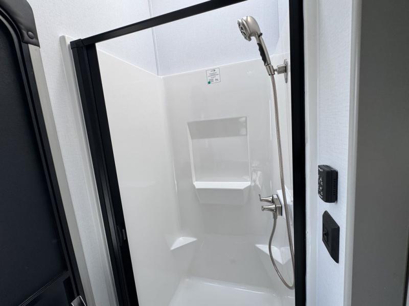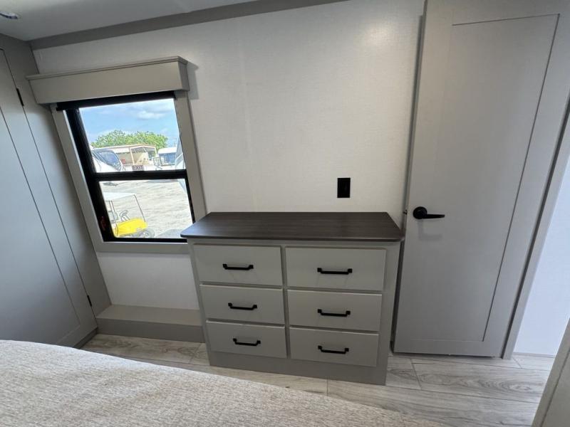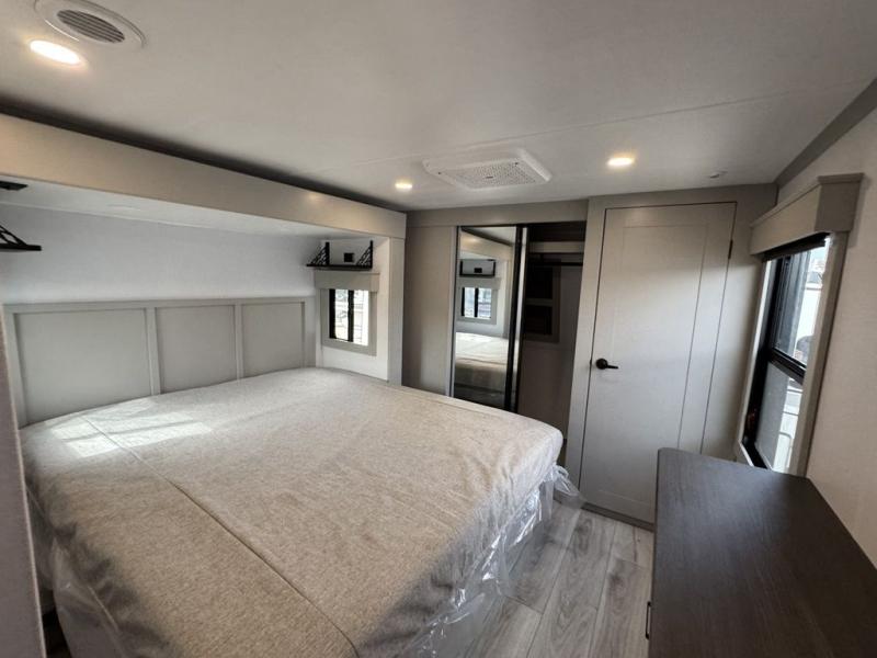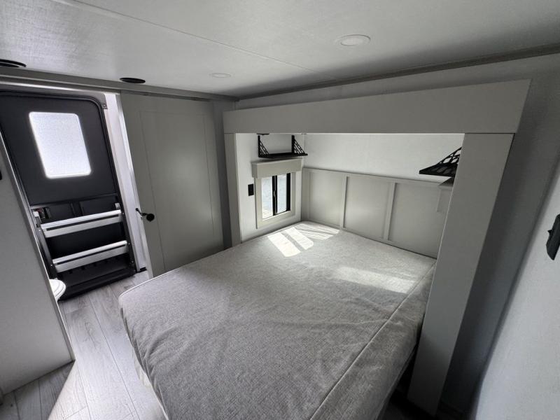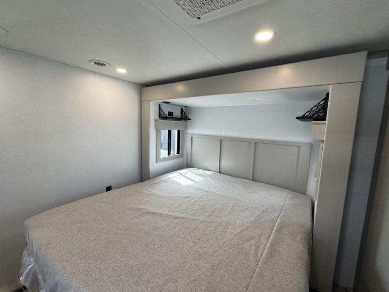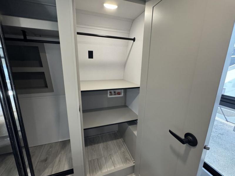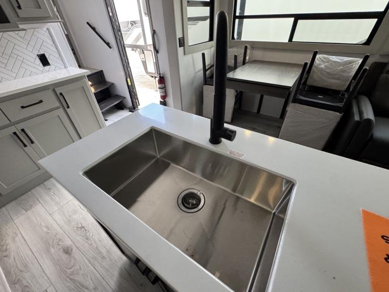 Two full bathrooms and two private bedrooms make this fifth wheel perfect for camping with friends and family. The front bedroom includes a king bed with a queen bed option, a large front wardrobe, plus stackable washer and dryer prep. The rear master bedroom has two closets plus a dresser and underbed storage, plus its own full bath with an exterior entry door for convenience. There is even a loft above the rear bedroom for even more sleeping space! Everyone can meet in the main living area/kitchen to relax on the power theater seat as the chef cooks dinner, and you can watch a show on the Smart HDTV to pass the time. The kitchen island will provide more counter space, along with the hutch that includes overhead cabinets as well. Don't let this luxury fifth wheel slip away!
