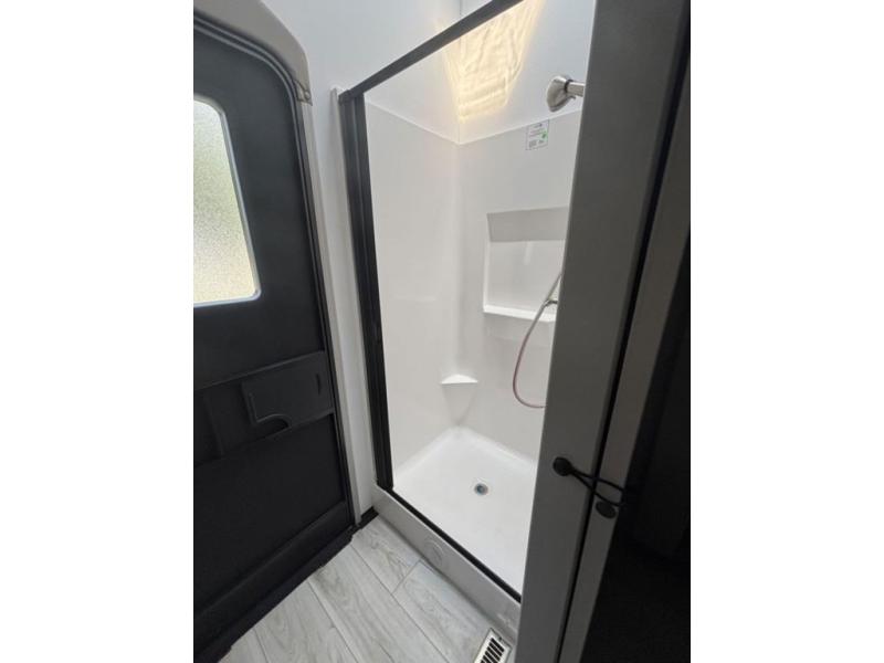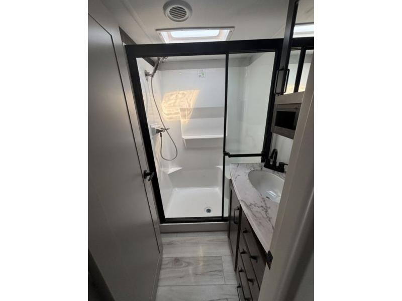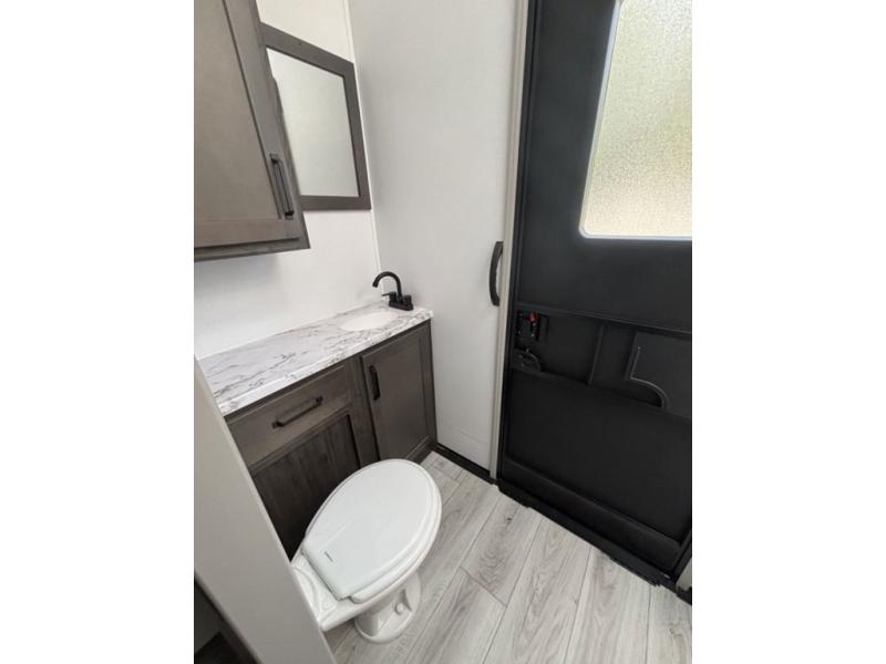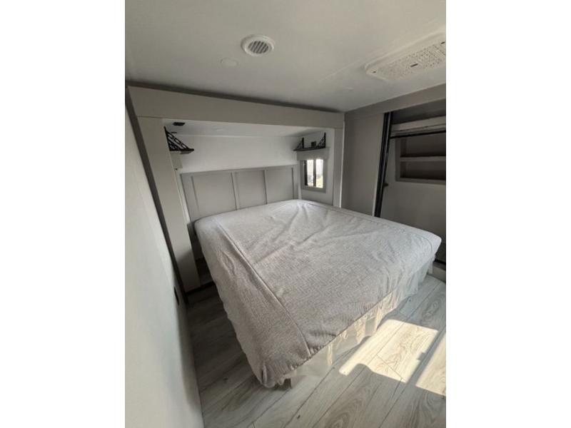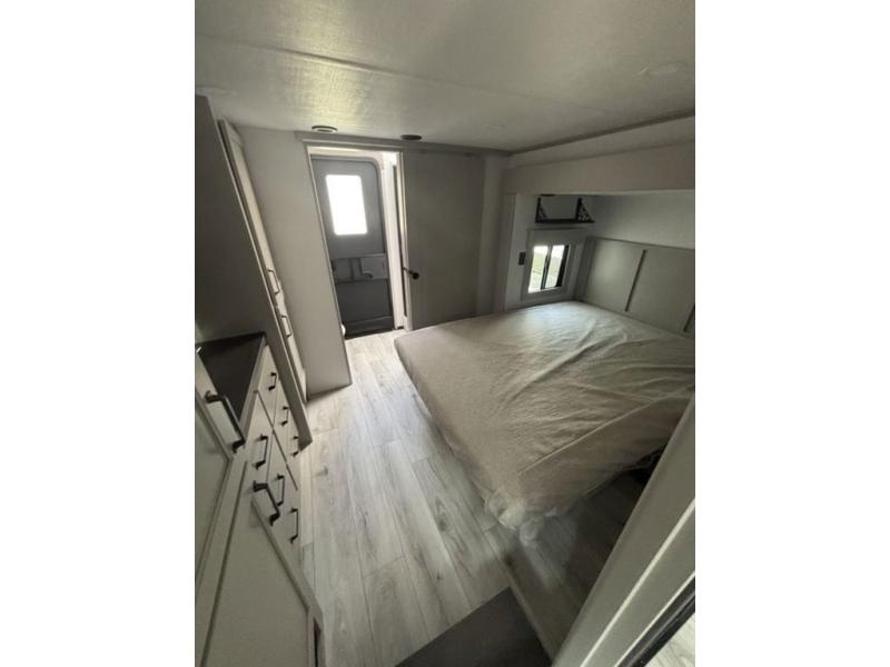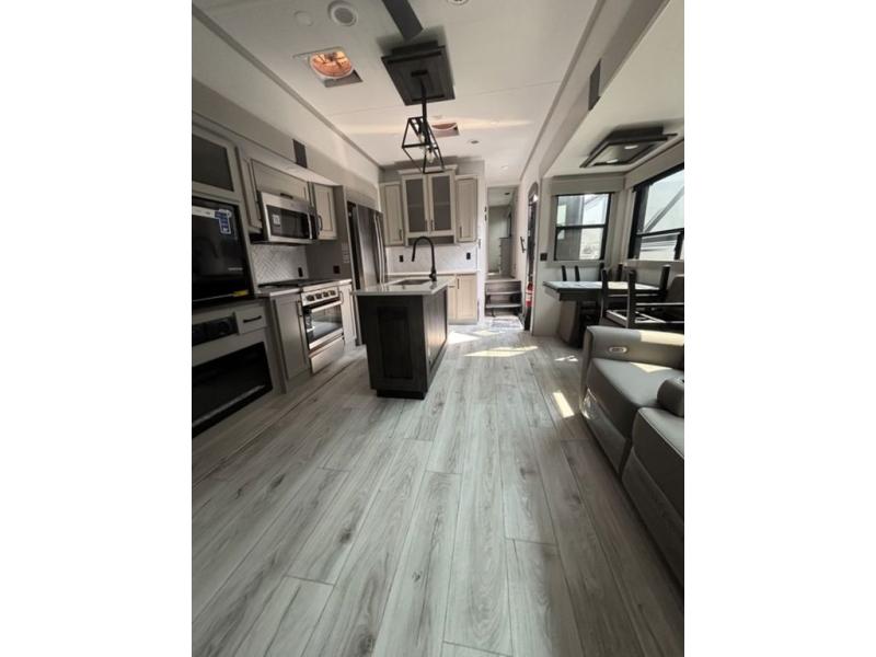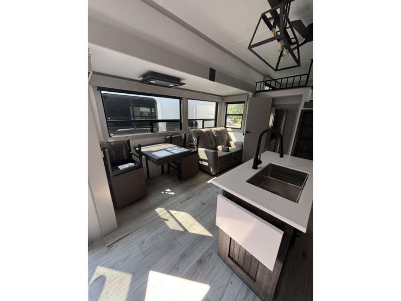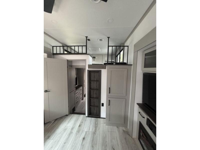 Two full bathrooms and two private bedrooms make this fifth wheel perfect for camping with friends and family. The front bedroom includes a king bed with a queen bed option, a large front wardrobe, plus stackable washer and dryer prep. The rear master bedroom has two closets plus a dresser and underbed storage, plus its own full bath with an exterior entry door for convenience. There is even a loft above the rear bedroom for even more sleeping space! Everyone can meet in the main living area/kitchen to relax on the power theater seat as the chef cooks dinner, and you can watch a show on the Smart HDTV to pass the time. The kitchen island will provide more counter space, along with the hutch that includes overhead cabinets as well. Don't let this luxury fifth wheel slip away!