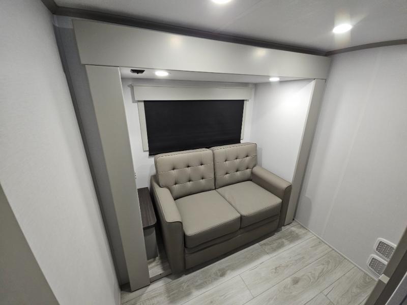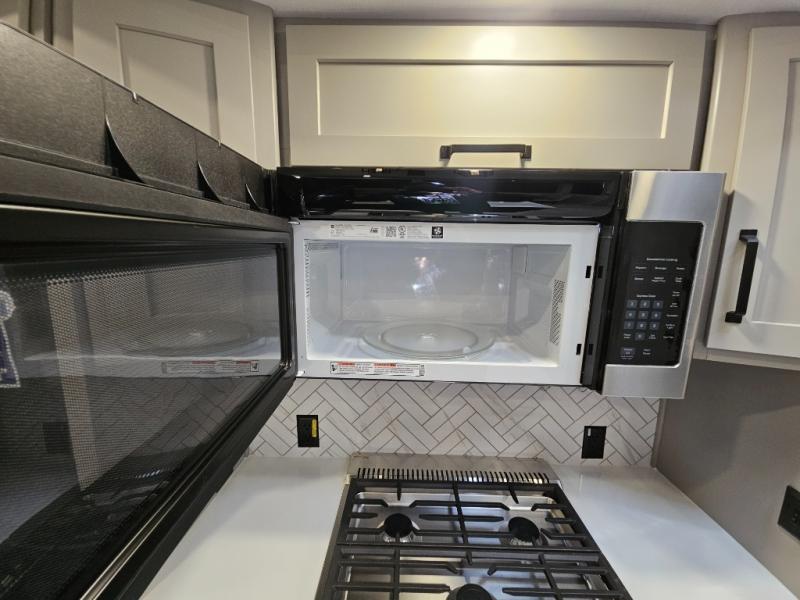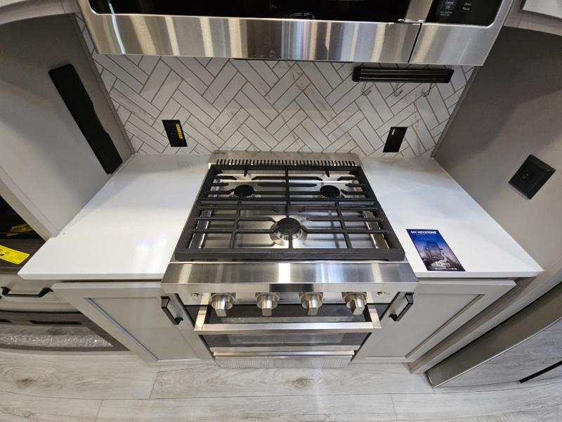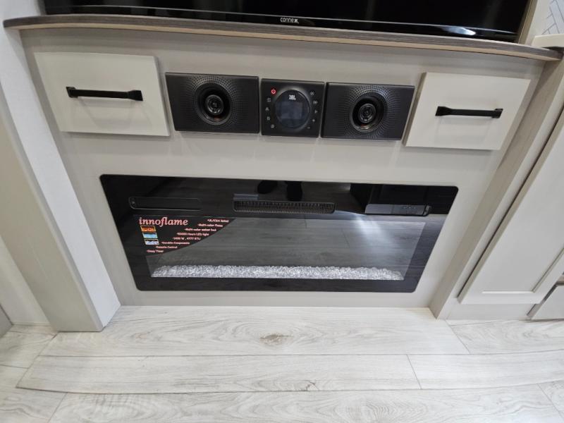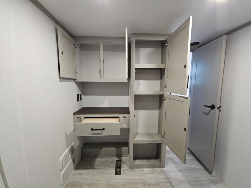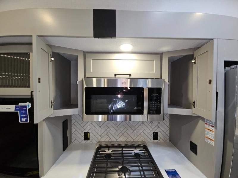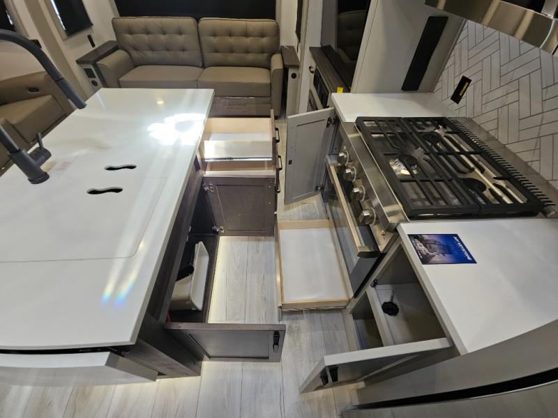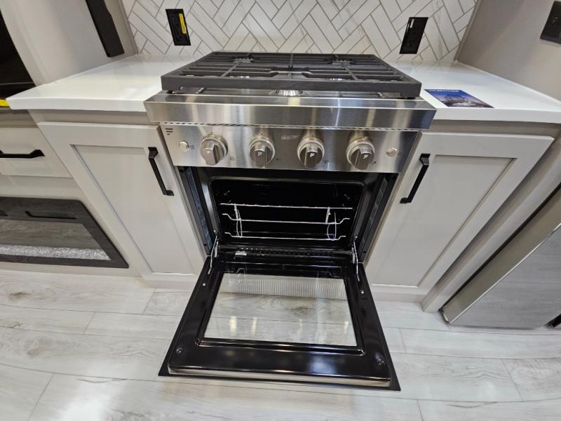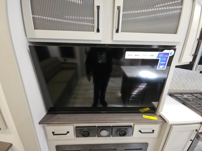 Just one look at this Montana High Country fifth wheel will impress you! There is an extra middle room that can be used for many different purposes, like an office, a guest bedroom, a craft room, or a hangout room. The hide-a-bed sofa sits on a slide for more space in this room, and there is a desk that can be used to get some work done. Above this room is a loft, so you have even more sleeping space. You also have a hide-a-bed sofa in the living area, and the king-size bed in the front private bedroom has storage underneath. The power theater seating sits across from the fireplace and 50" LCD TV for nighttime entertainment, and the kitchen island has a countertop extension for more prep space.