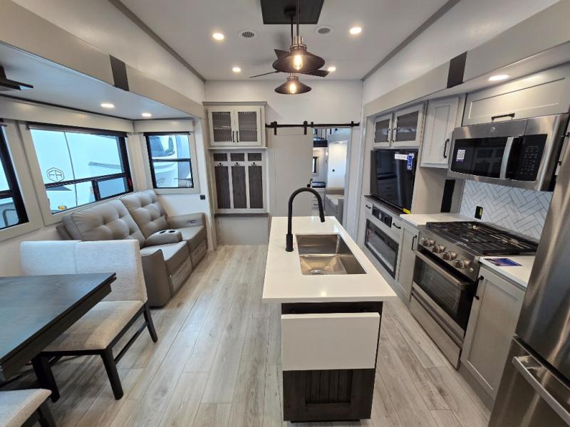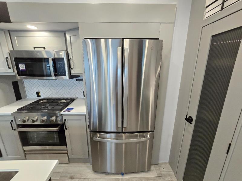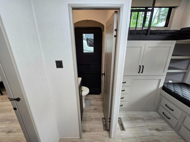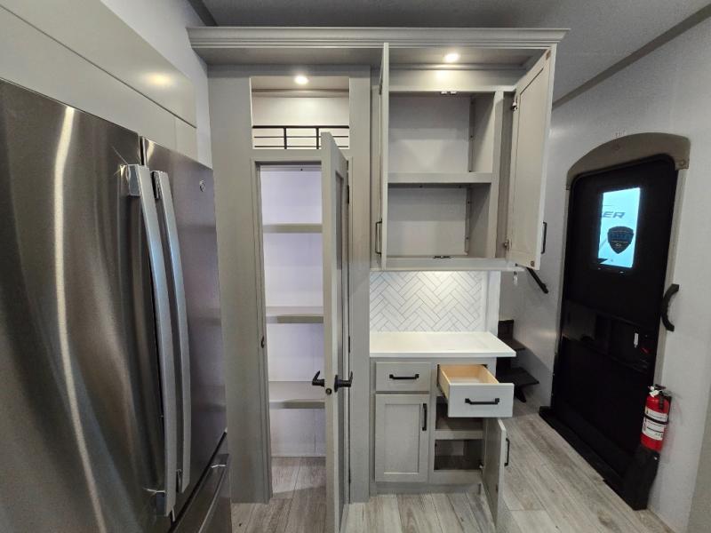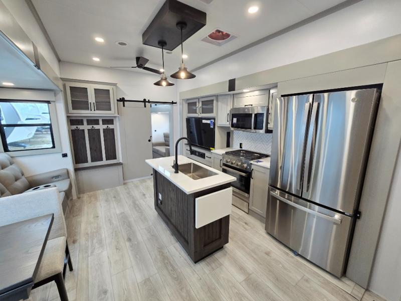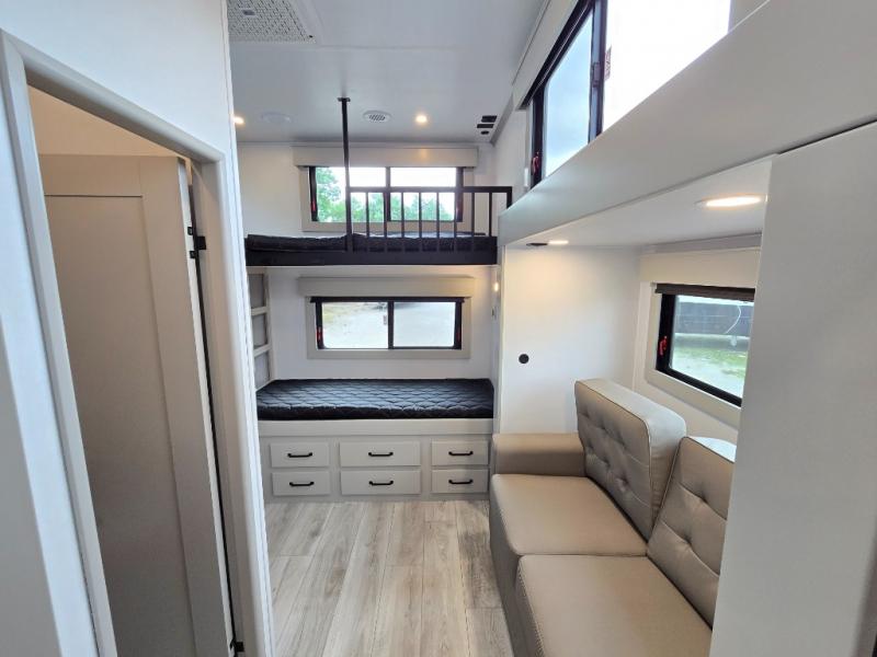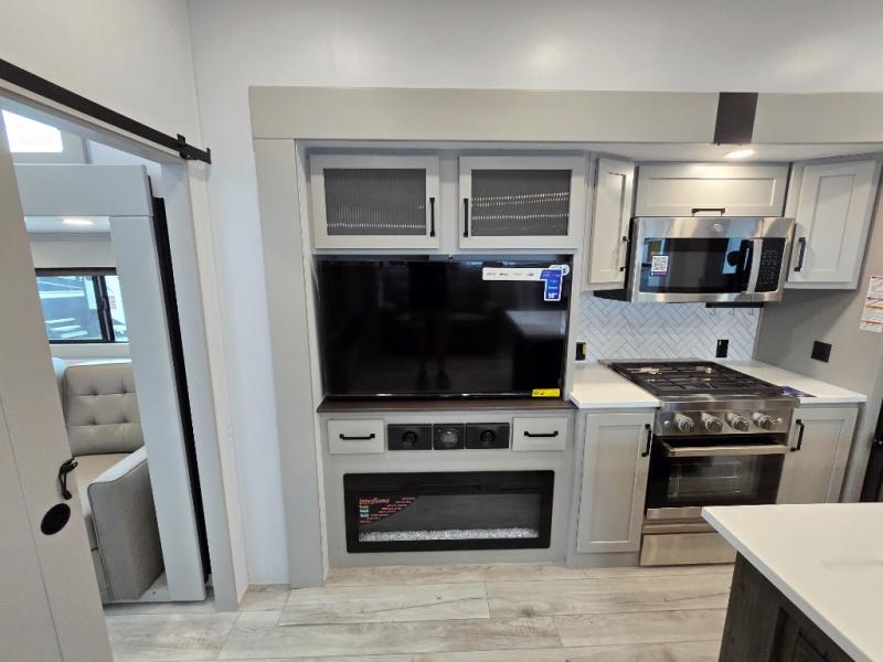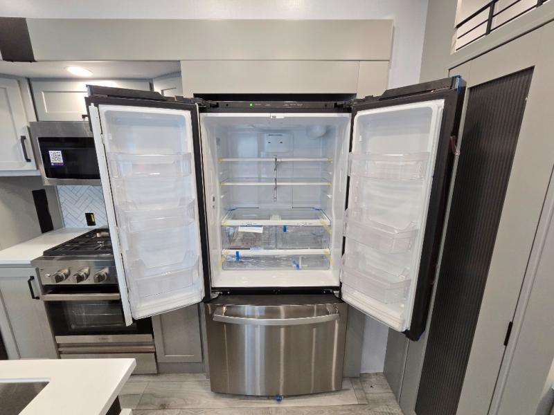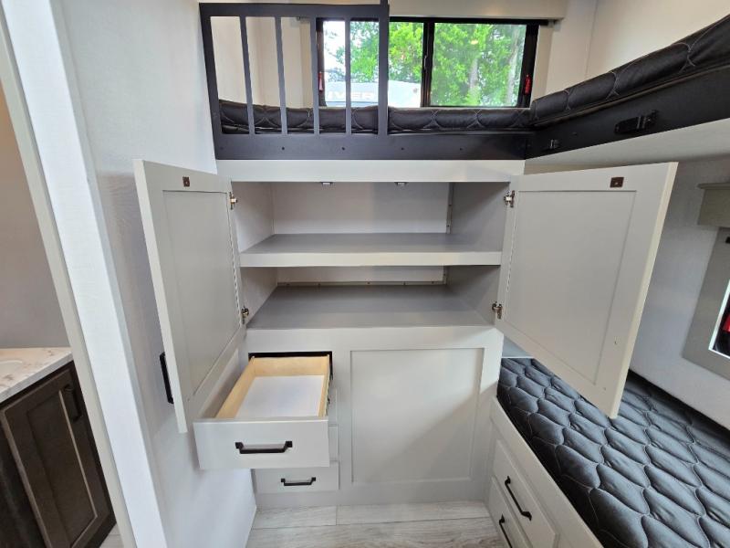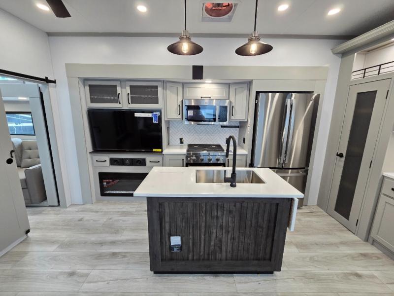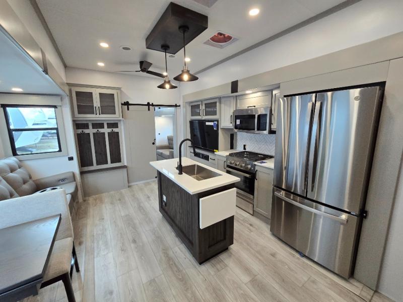 This fifth wheel is sure to check off all the boxes on your wish list for a new RV! There is a rear private bunkhouse suite with triple bunks and a hide-a-bed sofa, plus a half bath with its own exterior entry door! You'll have the front master bedroom all to yourselves with a king bed slide out, three wardrobes, two dressers, and even underbed storage! You could choose the optional queen bed in place of the king if you want more floor place, and there is washer/dryer prep if you want to add those appliances. The combined living area and kitchen is spacious with its dual opposing slides, and there is a kitchen island here for more counter space the chef if sure to love. Power theater seating is directly across from the Smart HDTV and fireplace, and the booth dinette provides a place to dine at. There is also a large residential refrigerator and a pantry for food storage, plus a coffee station where you can park your Keurig machine! Head outdoors to enjoy the two power awnings and outdoor kitchen!