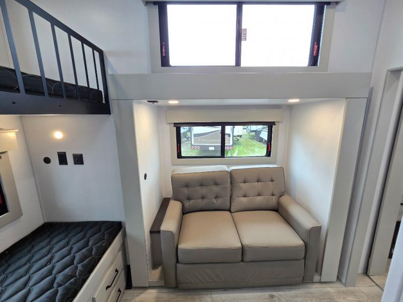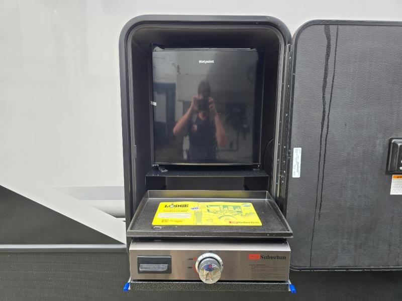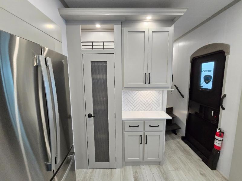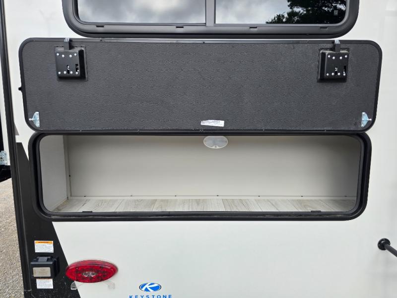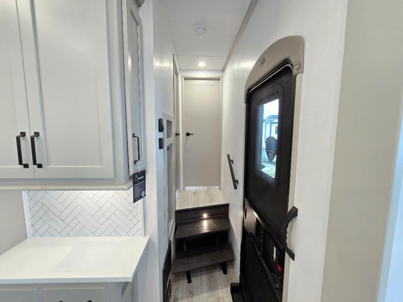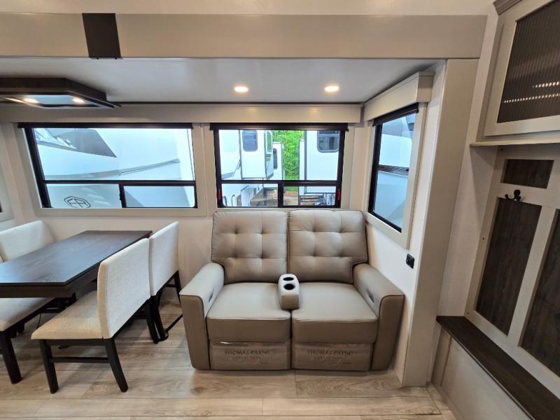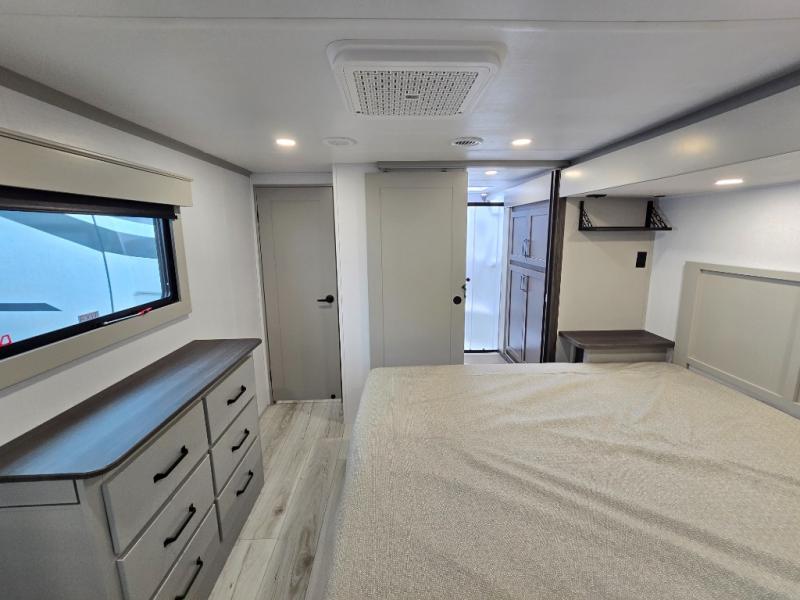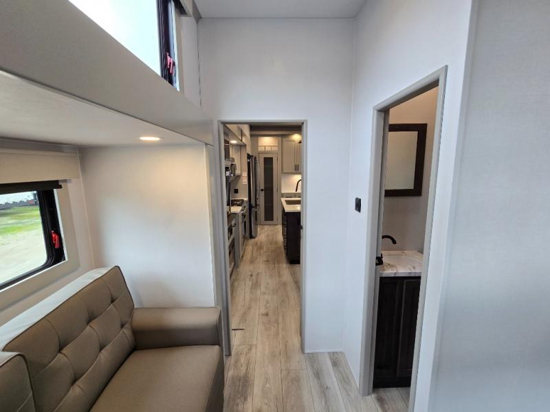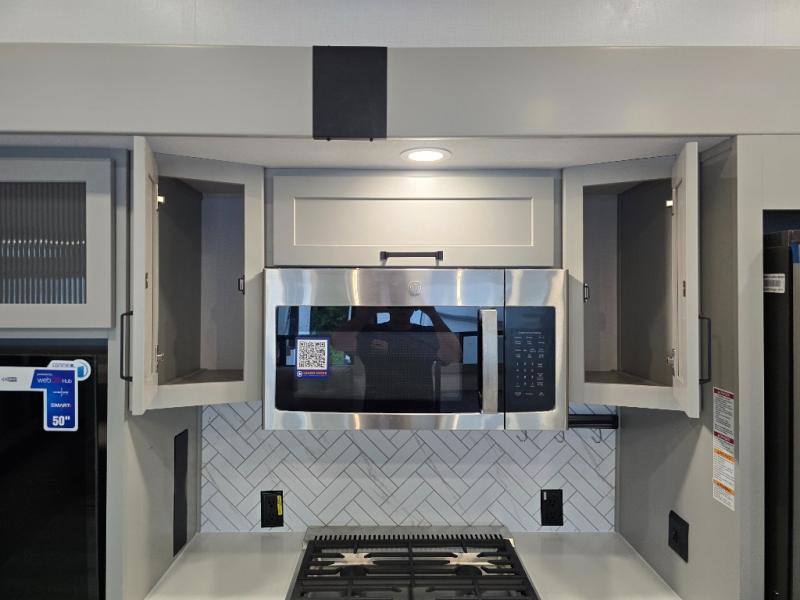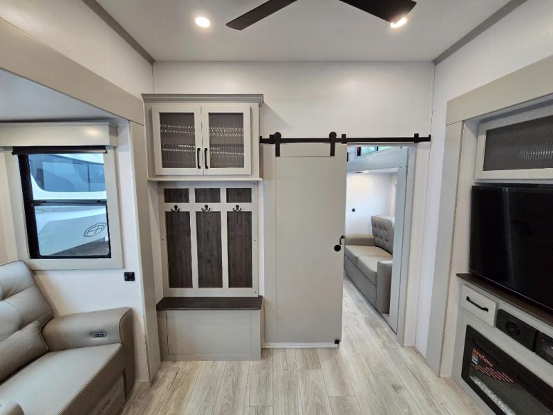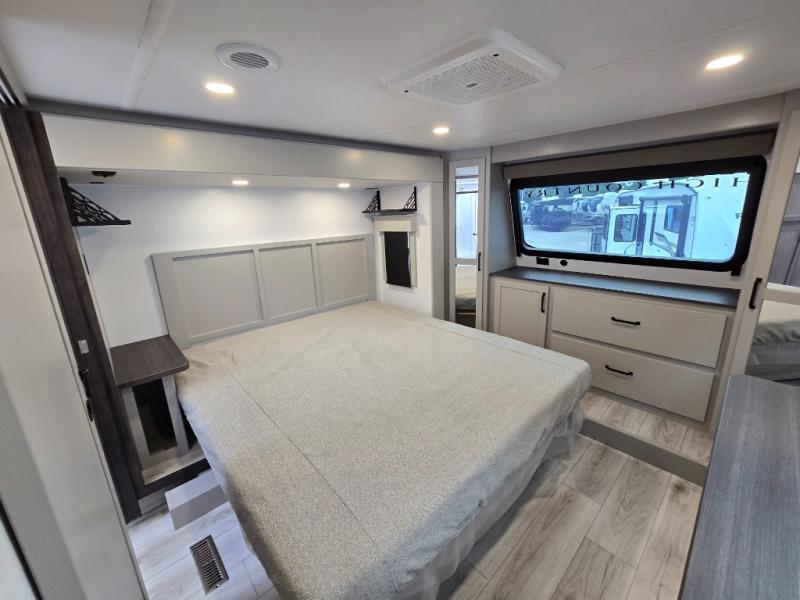 This fifth wheel is sure to check off all the boxes on your wish list for a new RV! There is a rear private bunkhouse suite with triple bunks and a hide-a-bed sofa, plus a half bath with its own exterior entry door! You'll have the front master bedroom all to yourselves with a king bed slide out, three wardrobes, two dressers, and even underbed storage! You could choose the optional queen bed in place of the king if you want more floor place, and there is washer/dryer prep if you want to add those appliances. The combined living area and kitchen is spacious with its dual opposing slides, and there is a kitchen island here for more counter space the chef if sure to love. Power theater seating is directly across from the Smart HDTV and fireplace, and the booth dinette provides a place to dine at. There is also a large residential refrigerator and a pantry for food storage, plus a coffee station where you can park your Keurig machine! Head outdoors to enjoy the two power awnings and outdoor kitchen!