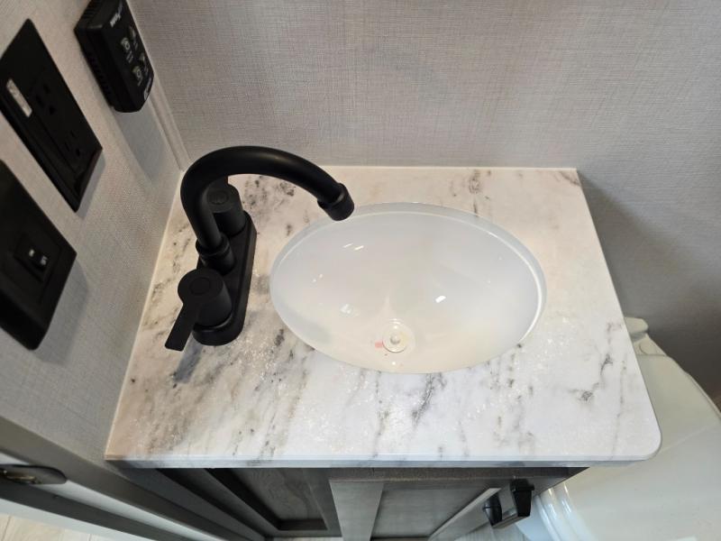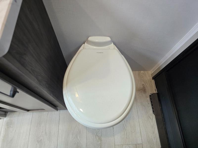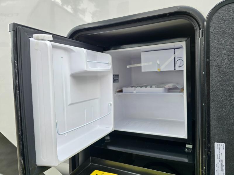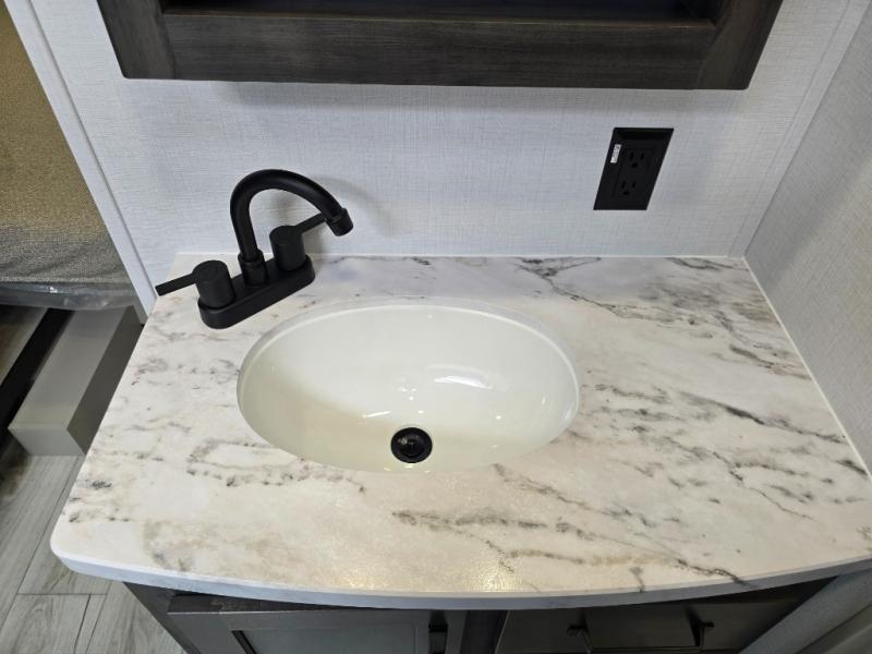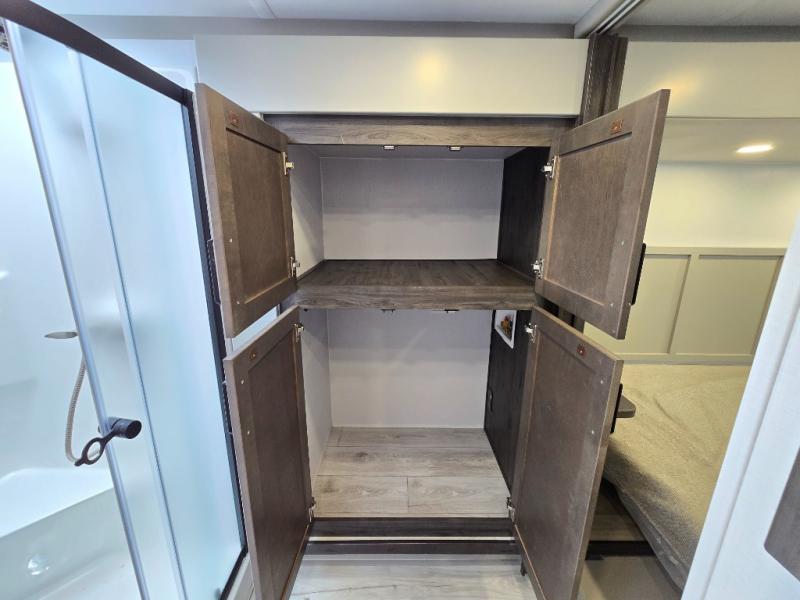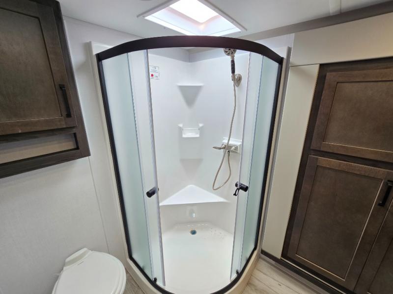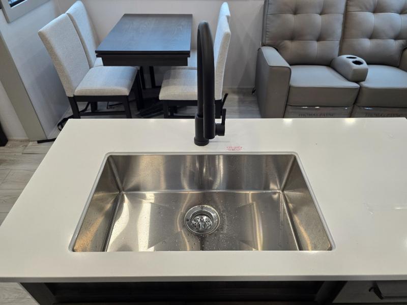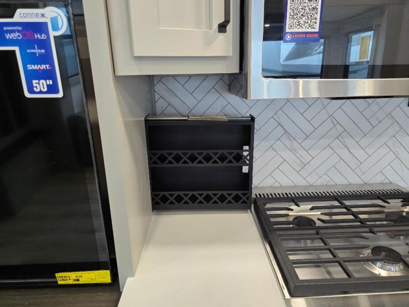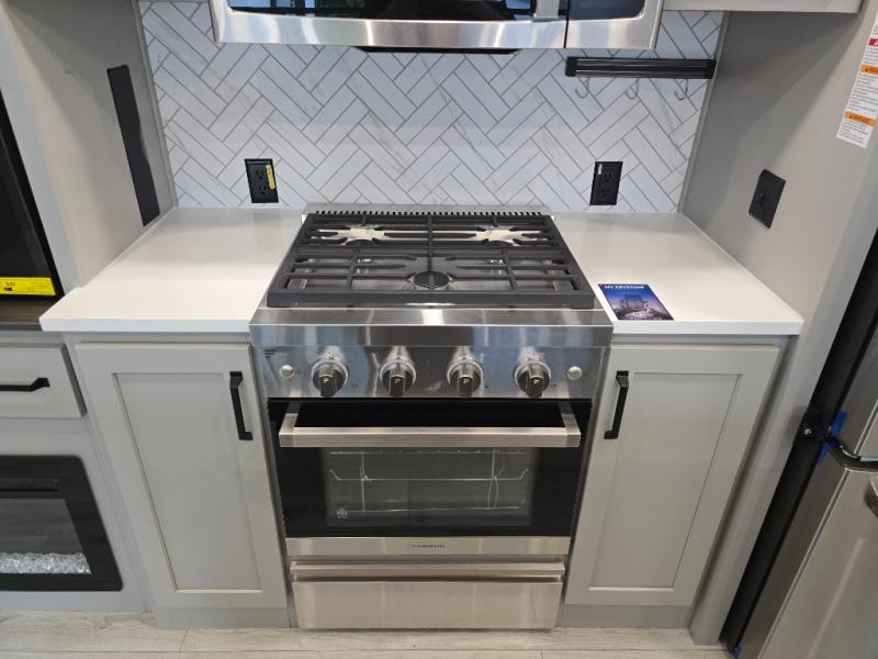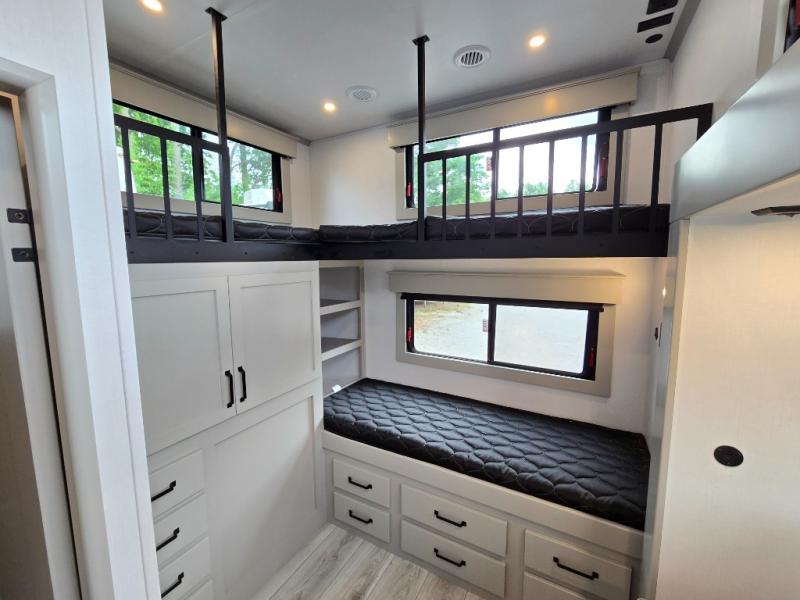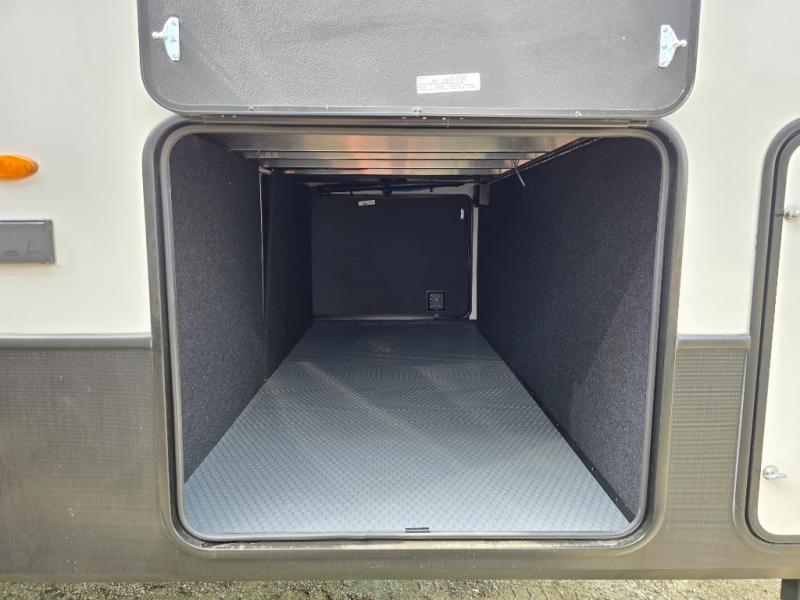 This fifth wheel is sure to check off all the boxes on your wish list for a new RV! There is a rear private bunkhouse suite with triple bunks and a hide-a-bed sofa, plus a half bath with its own exterior entry door! You'll have the front master bedroom all to yourselves with a king bed slide out, three wardrobes, two dressers, and even underbed storage! You could choose the optional queen bed in place of the king if you want more floor place, and there is washer/dryer prep if you want to add those appliances. The combined living area and kitchen is spacious with its dual opposing slides, and there is a kitchen island here for more counter space the chef if sure to love. Power theater seating is directly across from the Smart HDTV and fireplace, and the booth dinette provides a place to dine at. There is also a large residential refrigerator and a pantry for food storage, plus a coffee station where you can park your Keurig machine! Head outdoors to enjoy the two power awnings and outdoor kitchen!