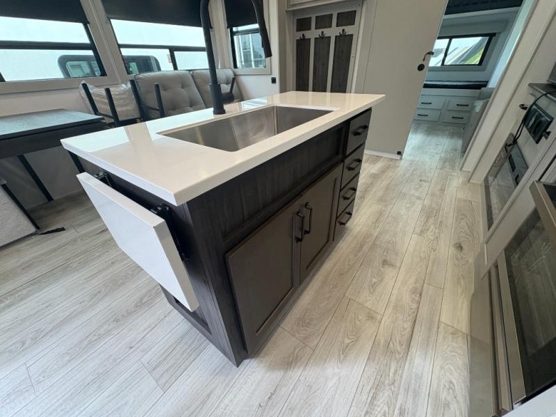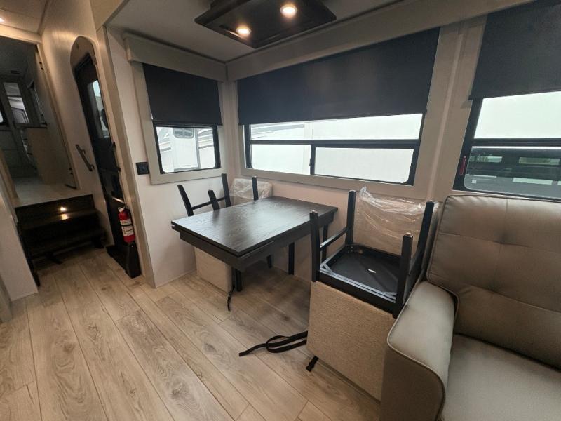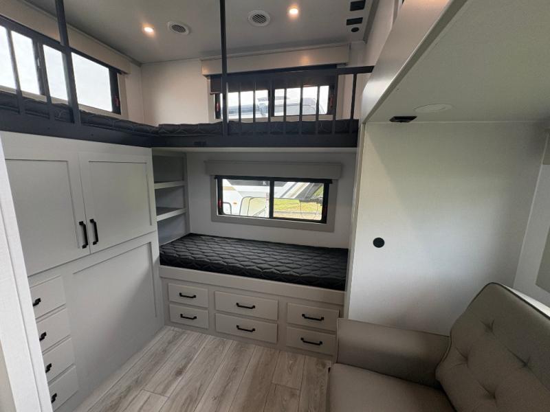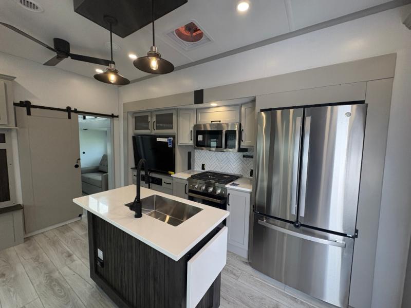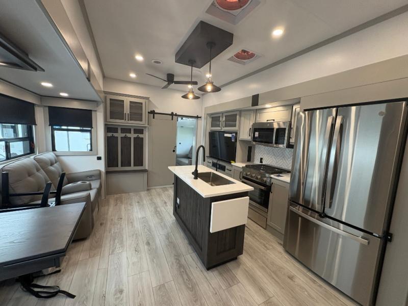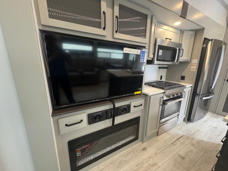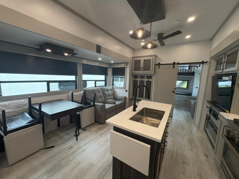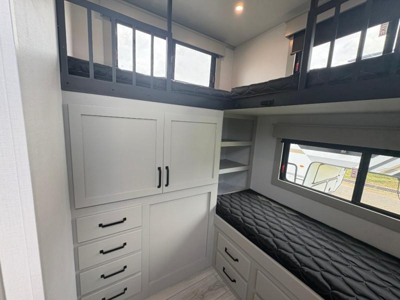 This fifth wheel is sure to check off all the boxes on your wish list for a new RV! There is a rear private bunkhouse suite with triple bunks and a hide-a-bed sofa, plus a half bath with its own exterior entry door! You'll have the front master bedroom all to yourselves with a king bed slide out, three wardrobes, two dressers, and even underbed storage! You could choose the optional queen bed in place of the king if you want more floor place, and there is washer/dryer prep if you want to add those appliances. The combined living area and kitchen is spacious with its dual opposing slides, and there is a kitchen island here for more counter space the chef if sure to love. Power theater seating is directly across from the Smart HDTV and fireplace, and the booth dinette provides a place to dine at. There is also a large residential refrigerator and a pantry for food storage, plus a coffee station where you can park your Keurig machine! Head outdoors to enjoy the two power awnings and outdoor kitchen!