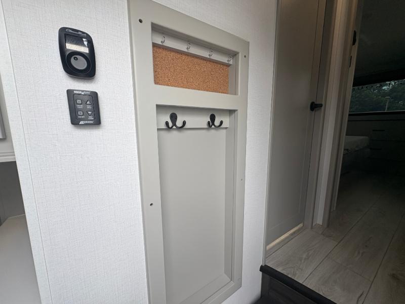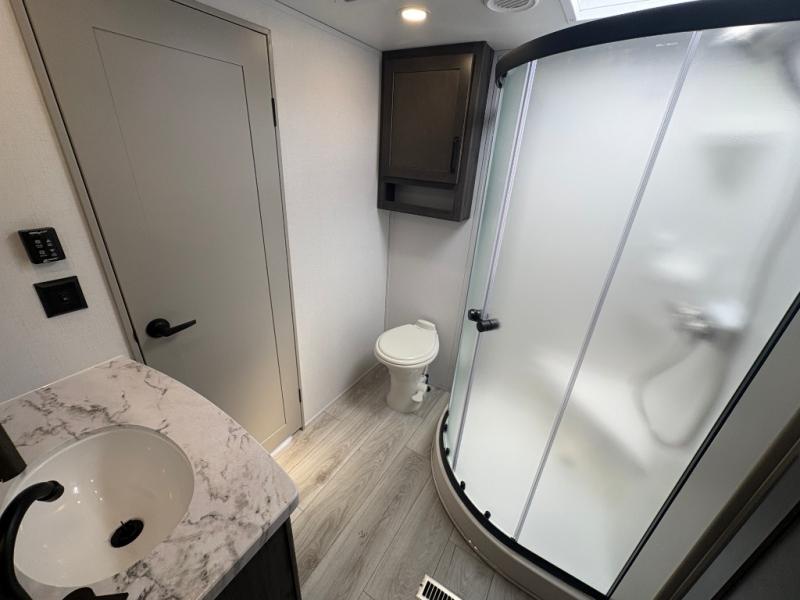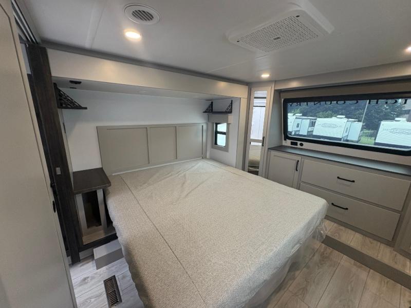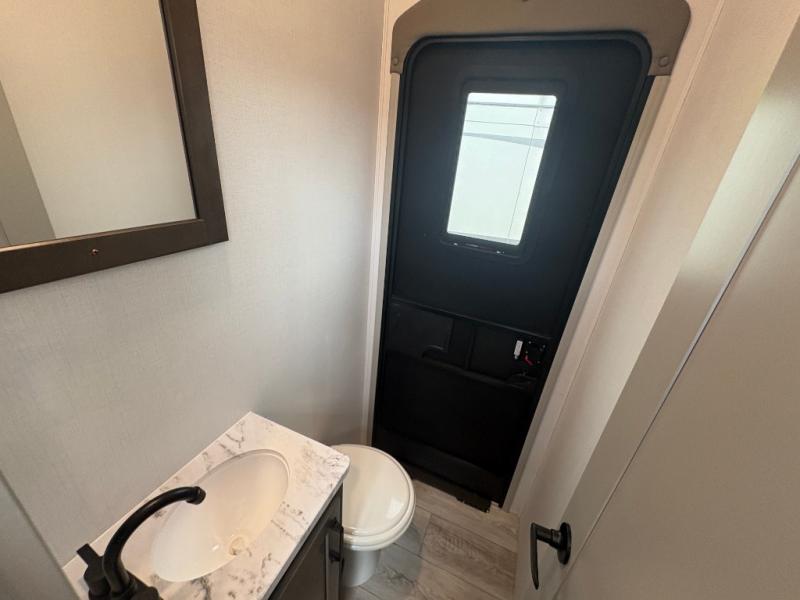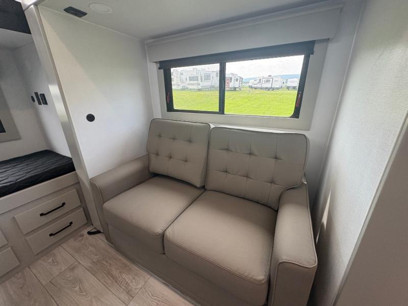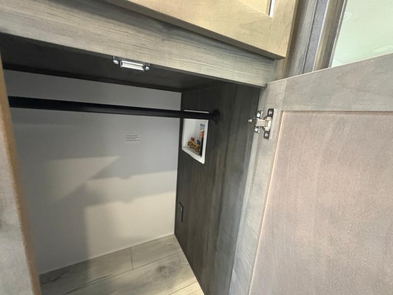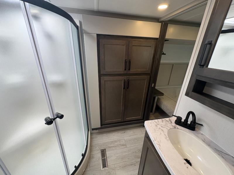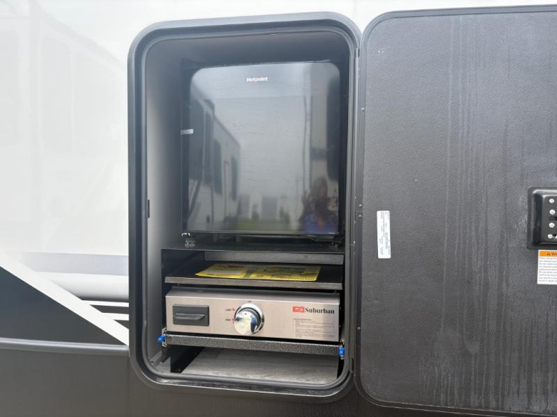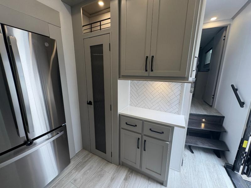 This fifth wheel is sure to check off all the boxes on your wish list for a new RV! There is a rear private bunkhouse suite with triple bunks and a hide-a-bed sofa, plus a half bath with its own exterior entry door! You'll have the front master bedroom all to yourselves with a king bed slide out, three wardrobes, two dressers, and even underbed storage! You could choose the optional queen bed in place of the king if you want more floor place, and there is washer/dryer prep if you want to add those appliances. The combined living area and kitchen is spacious with its dual opposing slides, and there is a kitchen island here for more counter space the chef if sure to love. Power theater seating is directly across from the Smart HDTV and fireplace, and the booth dinette provides a place to dine at. There is also a large residential refrigerator and a pantry for food storage, plus a coffee station where you can park your Keurig machine! Head outdoors to enjoy the two power awnings and outdoor kitchen!