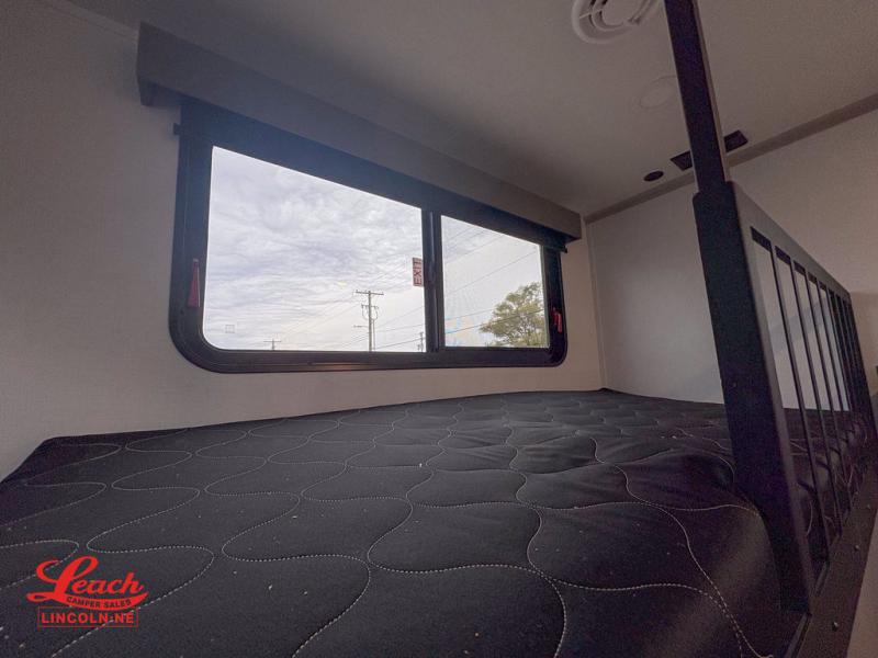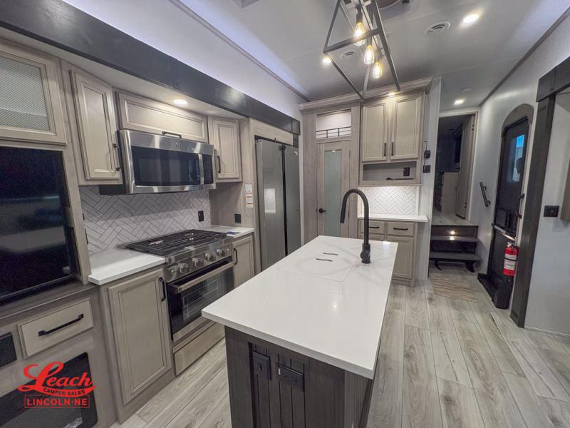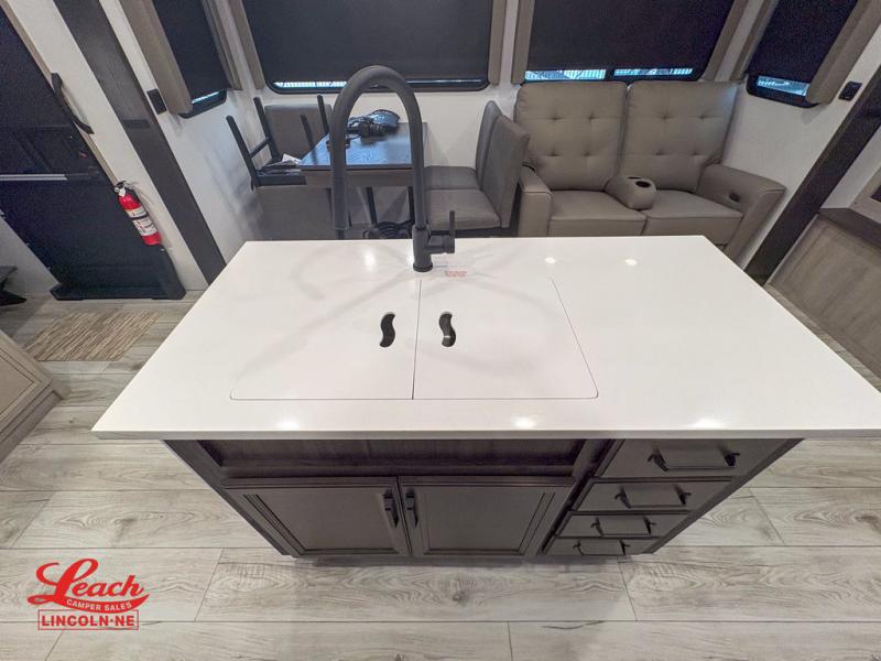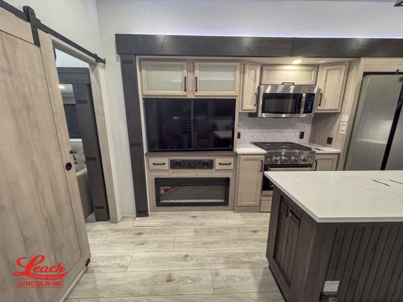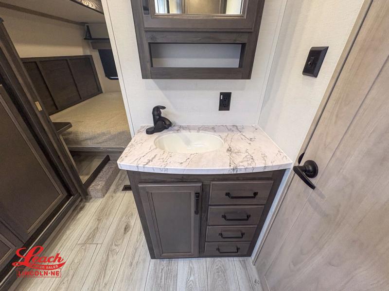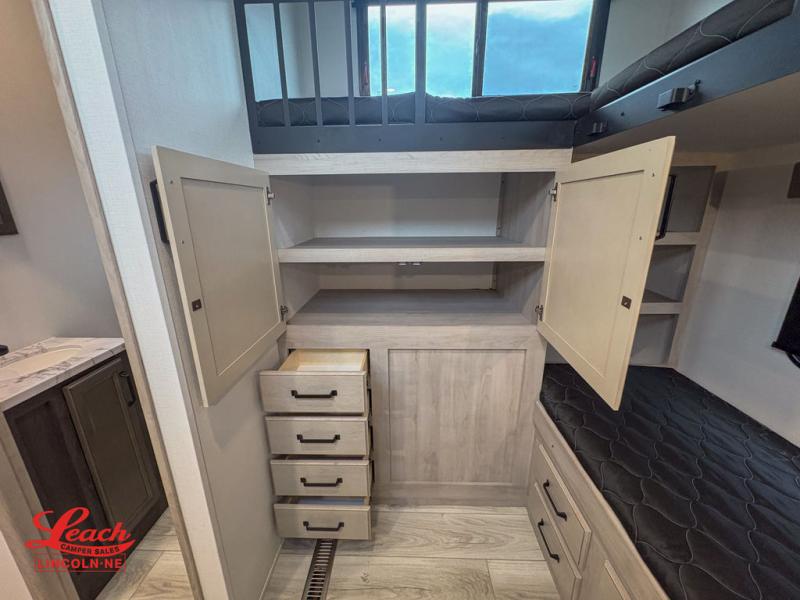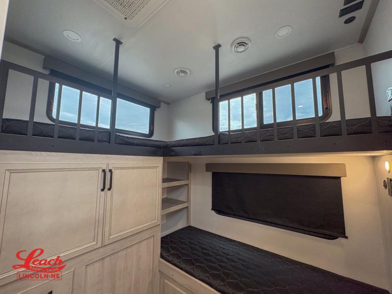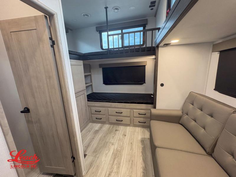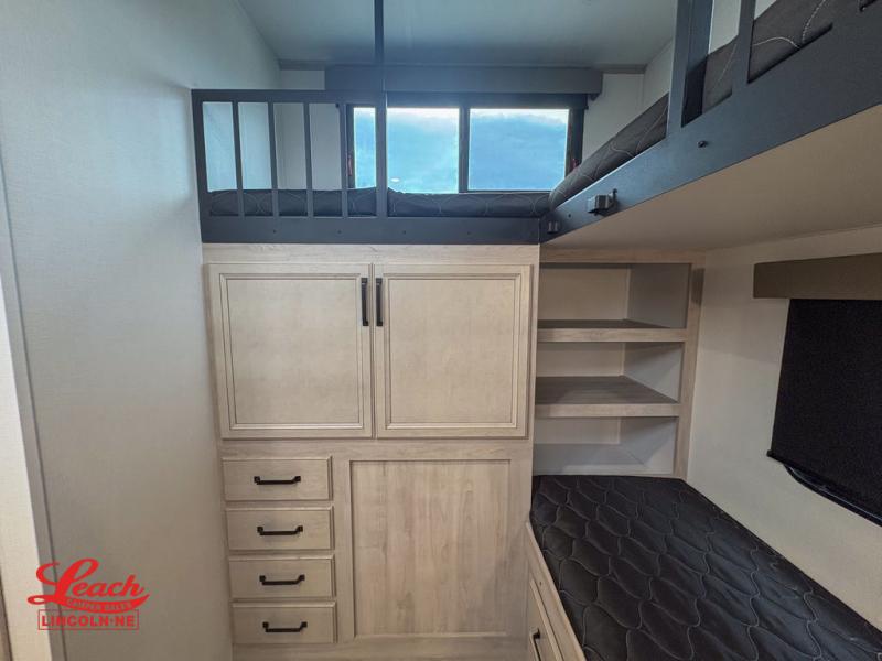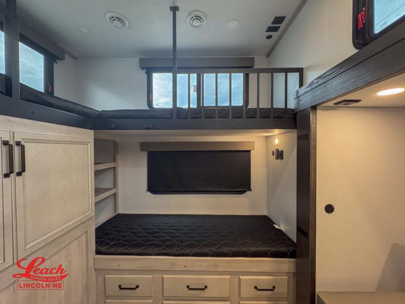 This fifth wheel is sure to check off all the boxes on your wish list for a new RV! There is a rear private bunkhouse suite with triple bunks and a hide-a-bed sofa, plus a half bath with its own exterior entry door! You'll have the front master bedroom all to yourselves with a king bed slide out, three wardrobes, two dressers, and even underbed storage! You could choose the optional queen bed in place of the king if you want more floor place, and there is washer/dryer prep if you want to add those appliances. The combined living area and kitchen is spacious with its dual opposing slides, and there is a kitchen island here for more counter space the chef if sure to love. Power theater seating is directly across from the Smart HDTV and fireplace, and the booth dinette provides a place to dine at. There is also a large residential refrigerator and a pantry for food storage, plus a coffee station where you can park your Keurig machine! Head outdoors to enjoy the two power awnings and outdoor kitchen!