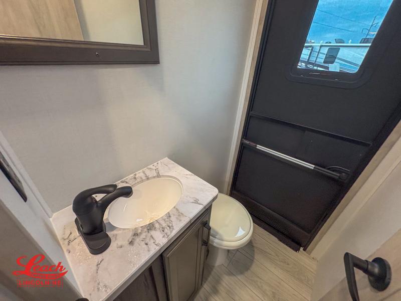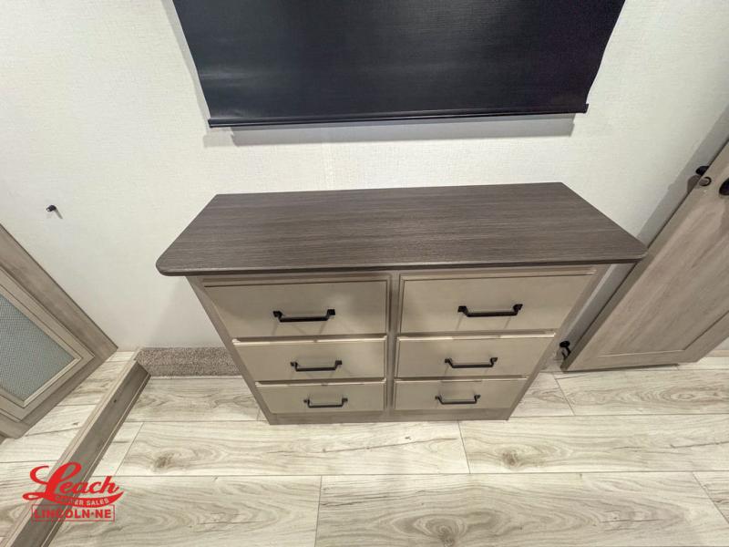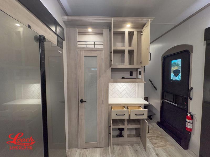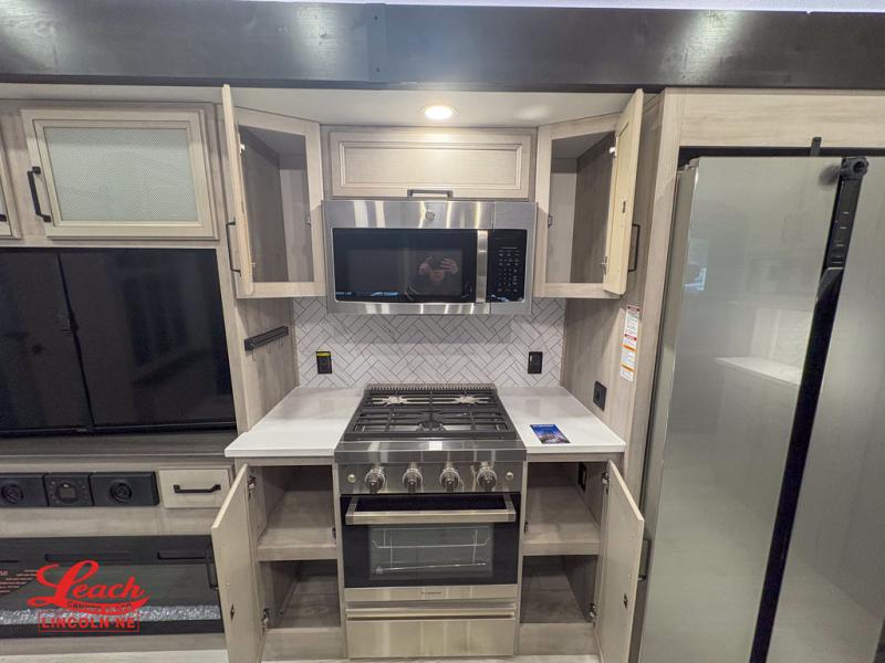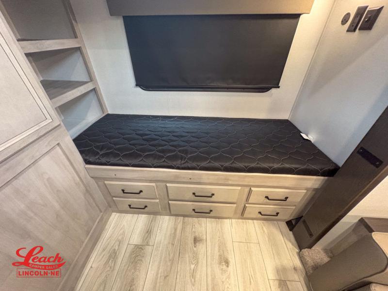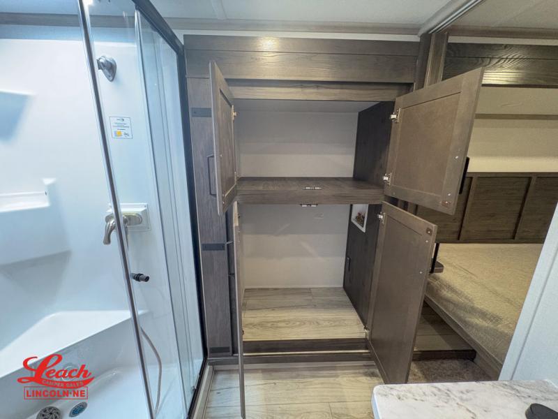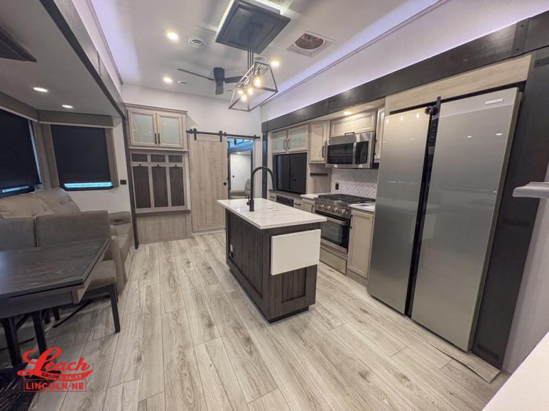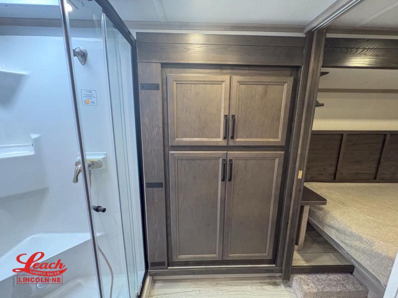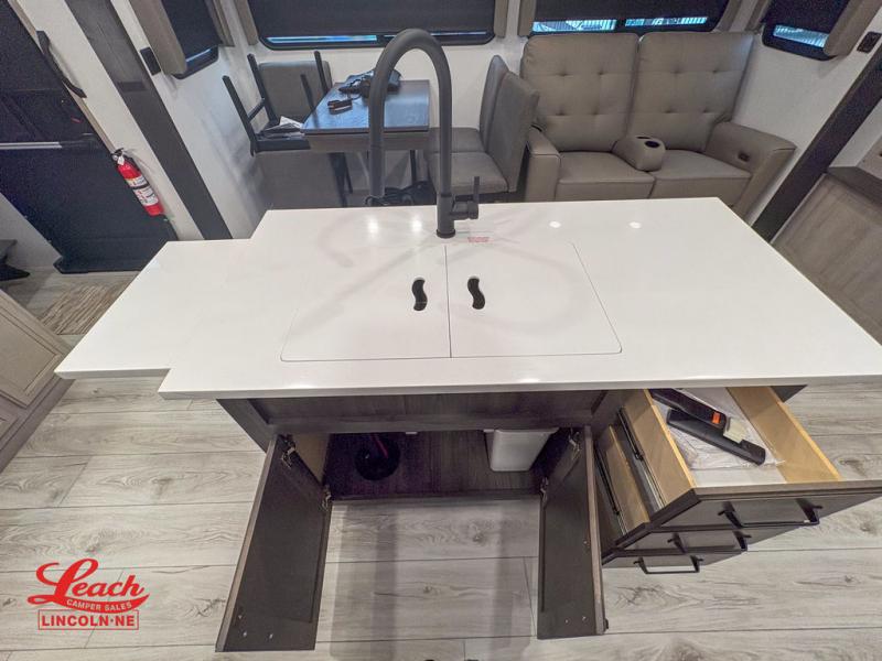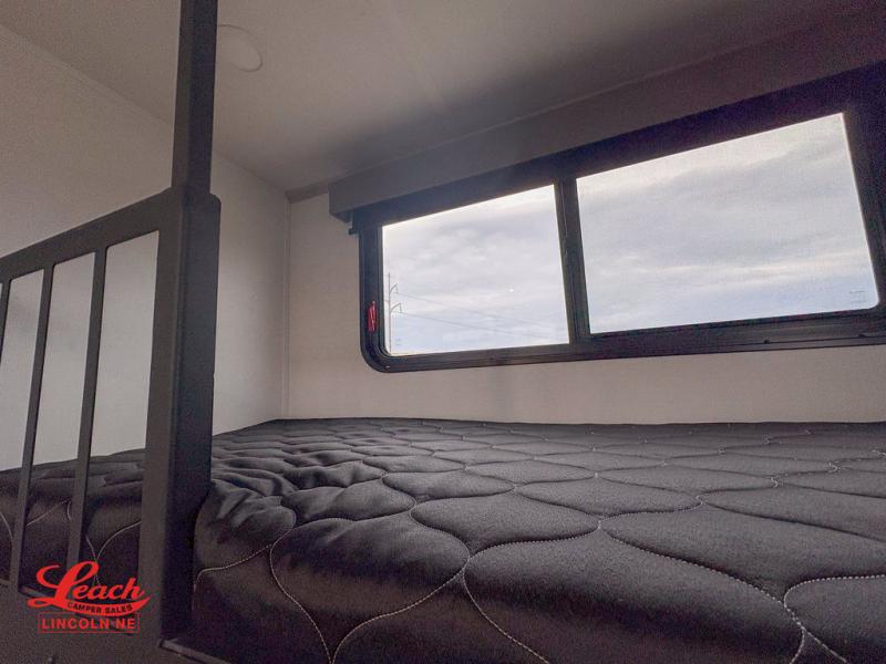 This fifth wheel is sure to check off all the boxes on your wish list for a new RV! There is a rear private bunkhouse suite with triple bunks and a hide-a-bed sofa, plus a half bath with its own exterior entry door! You'll have the front master bedroom all to yourselves with a king bed slide out, three wardrobes, two dressers, and even underbed storage! You could choose the optional queen bed in place of the king if you want more floor place, and there is washer/dryer prep if you want to add those appliances. The combined living area and kitchen is spacious with its dual opposing slides, and there is a kitchen island here for more counter space the chef if sure to love. Power theater seating is directly across from the Smart HDTV and fireplace, and the booth dinette provides a place to dine at. There is also a large residential refrigerator and a pantry for food storage, plus a coffee station where you can park your Keurig machine! Head outdoors to enjoy the two power awnings and outdoor kitchen!