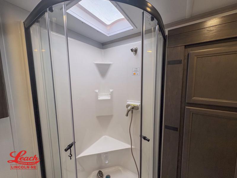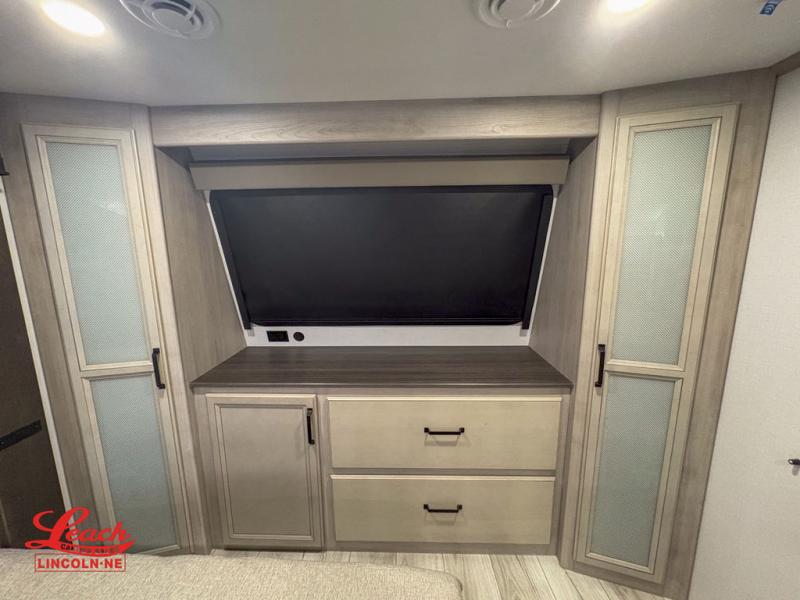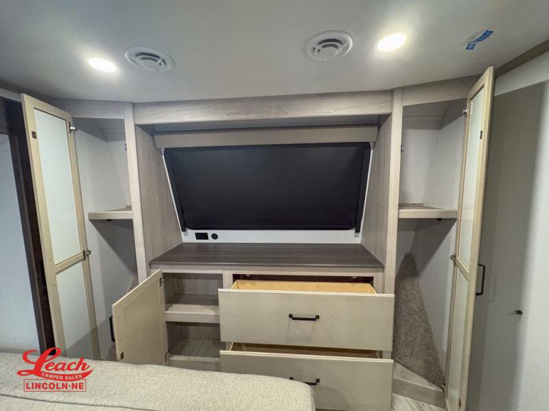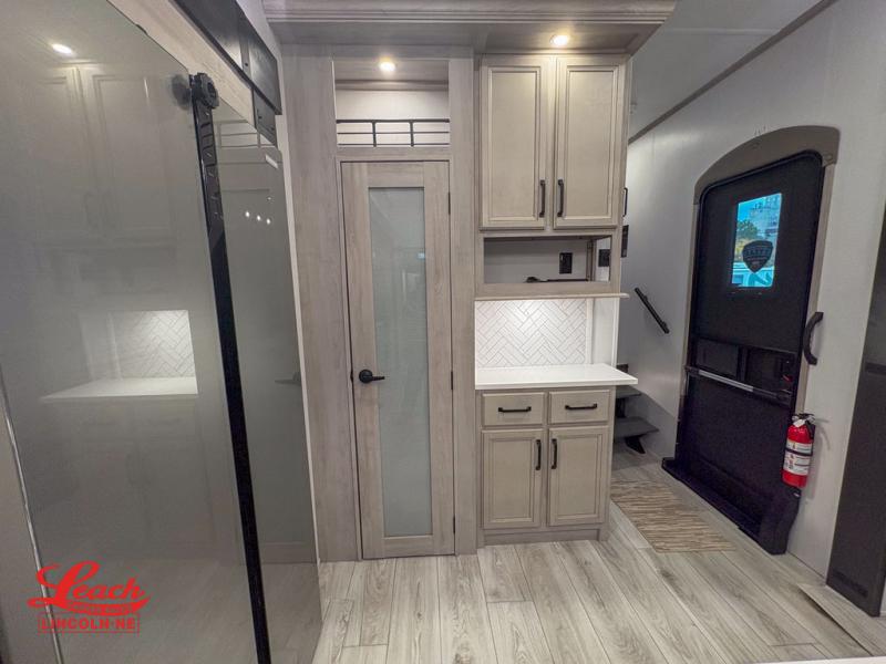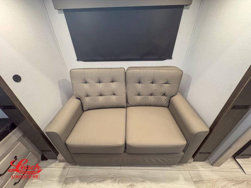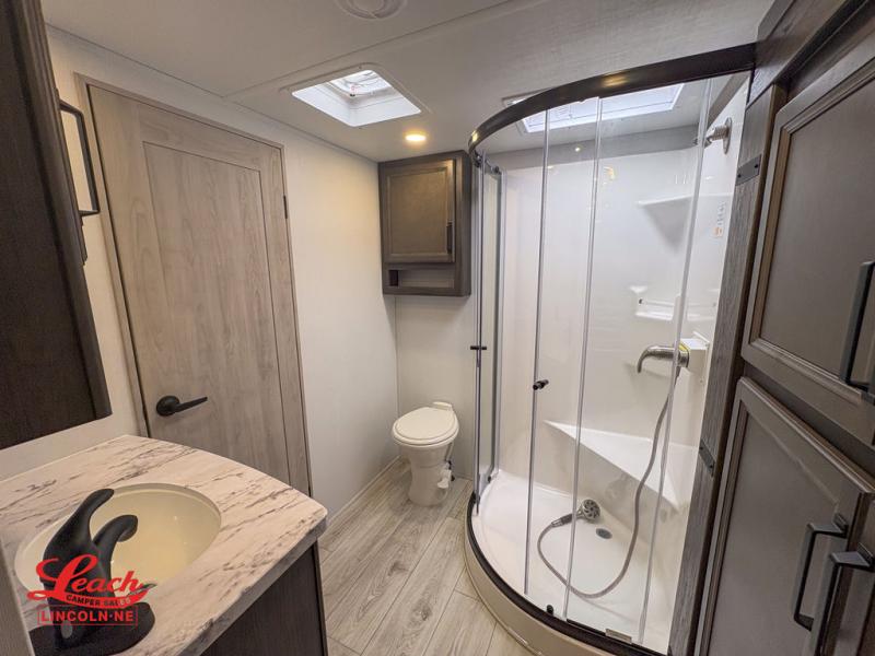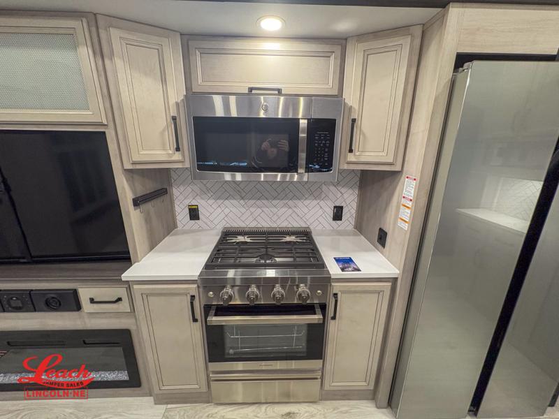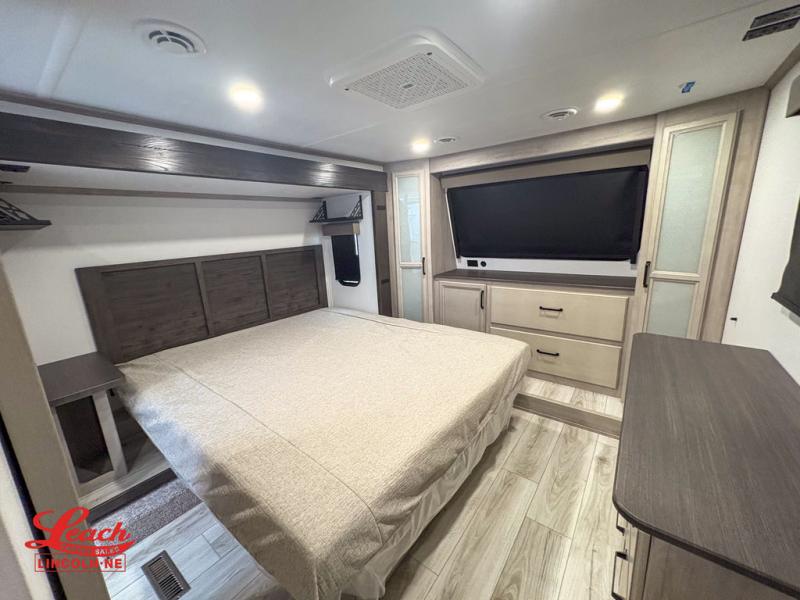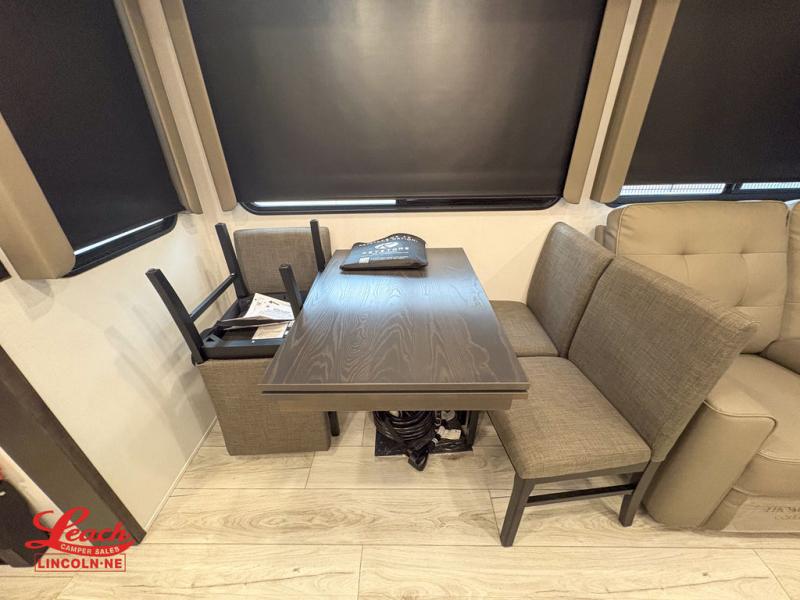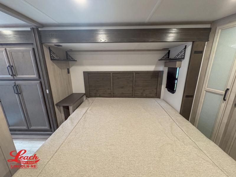 This fifth wheel is sure to check off all the boxes on your wish list for a new RV! There is a rear private bunkhouse suite with triple bunks and a hide-a-bed sofa, plus a half bath with its own exterior entry door! You'll have the front master bedroom all to yourselves with a king bed slide out, three wardrobes, two dressers, and even underbed storage! You could choose the optional queen bed in place of the king if you want more floor place, and there is washer/dryer prep if you want to add those appliances. The combined living area and kitchen is spacious with its dual opposing slides, and there is a kitchen island here for more counter space the chef if sure to love. Power theater seating is directly across from the Smart HDTV and fireplace, and the booth dinette provides a place to dine at. There is also a large residential refrigerator and a pantry for food storage, plus a coffee station where you can park your Keurig machine! Head outdoors to enjoy the two power awnings and outdoor kitchen!