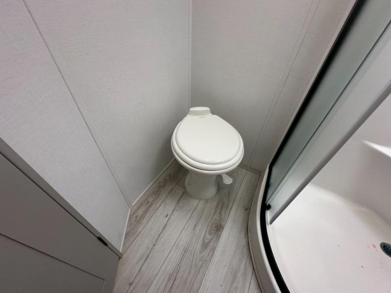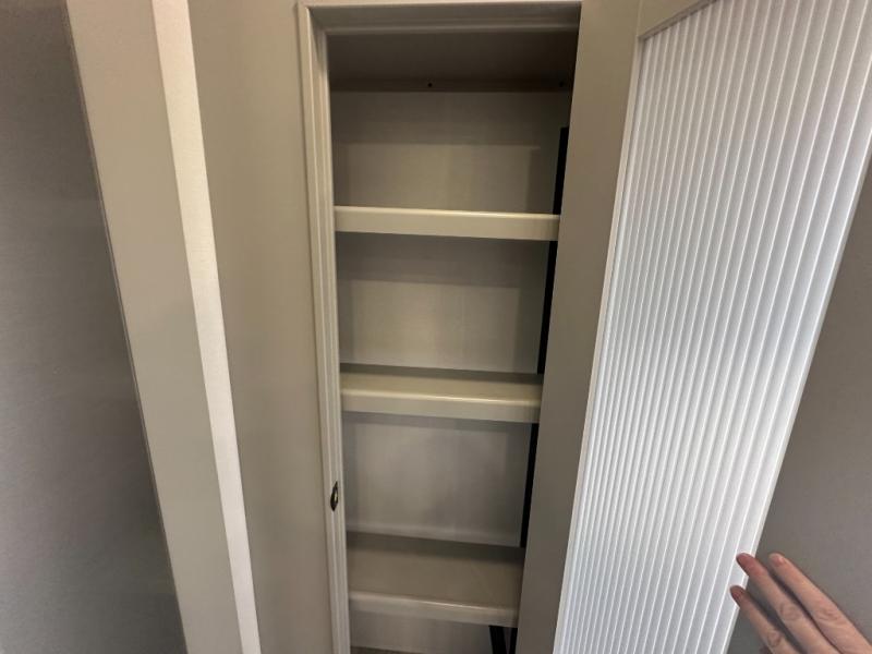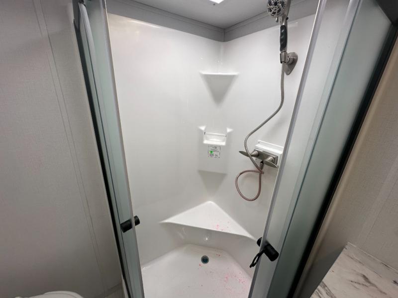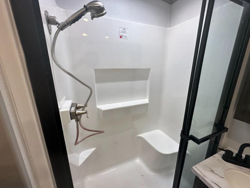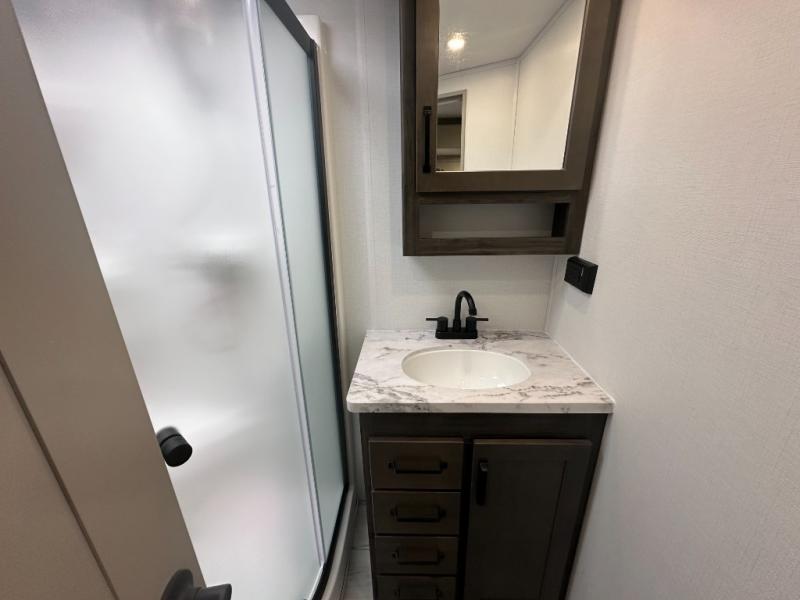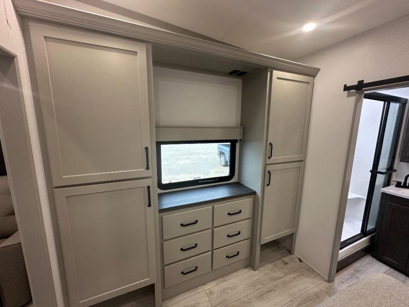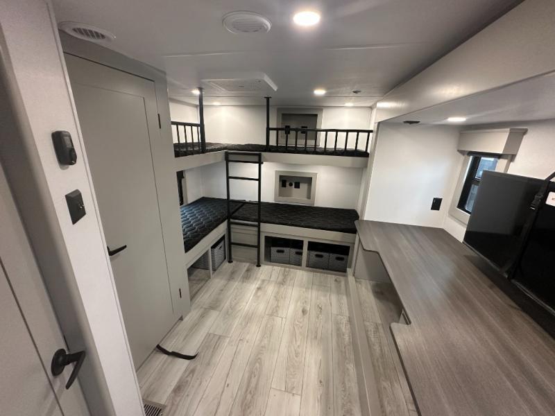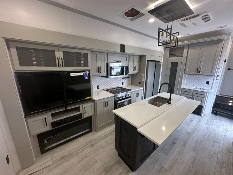 You'll love every minute spent in this spacious fifth wheel! It's perfect to camp with a larger group since there are bunk beds in the front bunkhouse suite plus a second suite in the back. The bunkhouse also includes two desks with chairs and storage drawers, a full bath, plus washer and dryer prep if you plan to go full-time. The rear suite features a king bed slide, two closets, a bedroom countertop plus a full rear bath with dual bath sinks; how convenient! Everyone will love to meet in the combined kitchen and living area in the morning. Here, you'll find two large opposing slides for tons of space, a large sofa and kitchen island, plus three pantries for all the snacks, canned goods, and paper products!