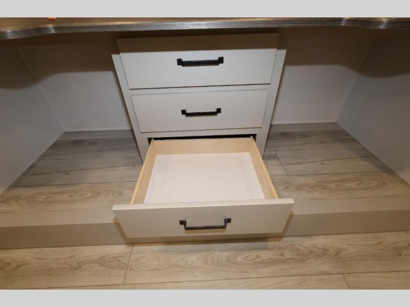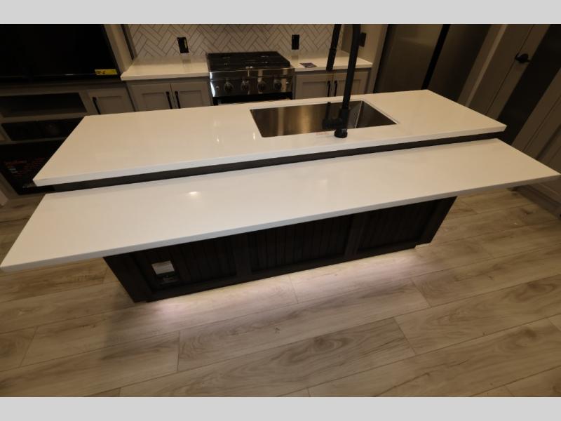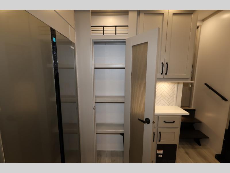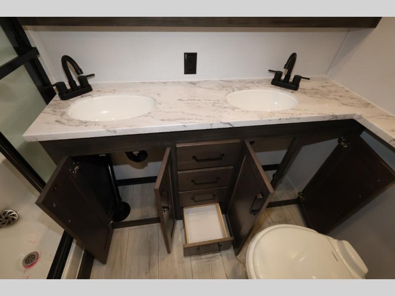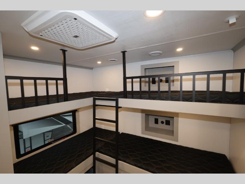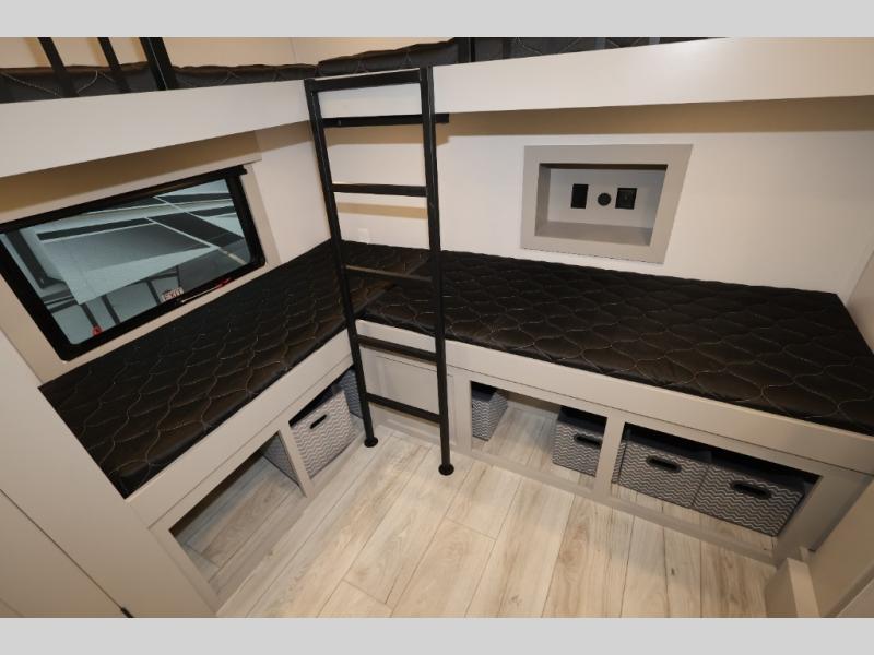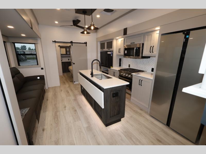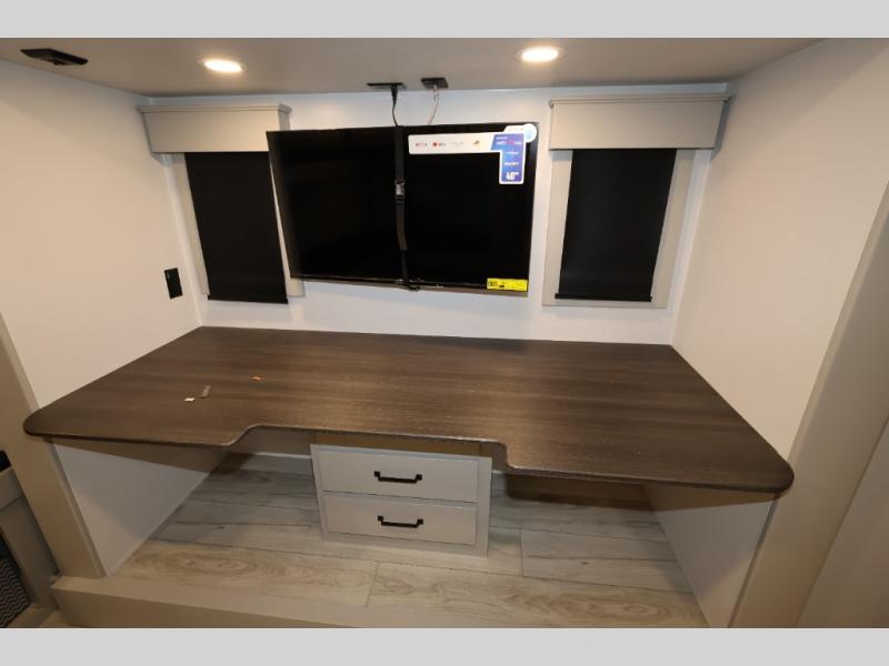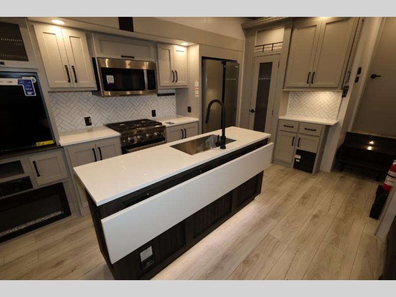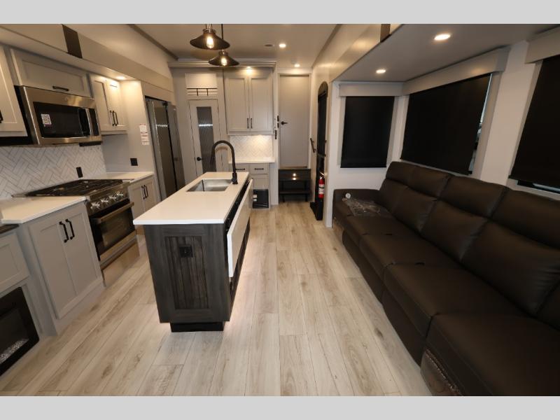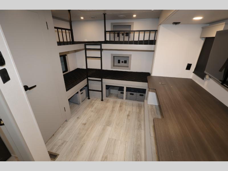 You'll love every minute spent in this spacious fifth wheel! It's perfect to camp with a larger group since there are bunk beds in the front bunkhouse suite plus a second suite in the back. The bunkhouse also includes two desks with chairs and storage drawers, a full bath, plus washer and dryer prep if you plan to go full-time. The rear suite features a king bed slide, two closets, a bedroom countertop plus a full rear bath with dual bath sinks; how convenient! Everyone will love to meet in the combined kitchen and living area in the morning. Here, you'll find two large opposing slides for tons of space, a large sofa and kitchen island, plus three pantries for all the snacks, canned goods, and paper products!