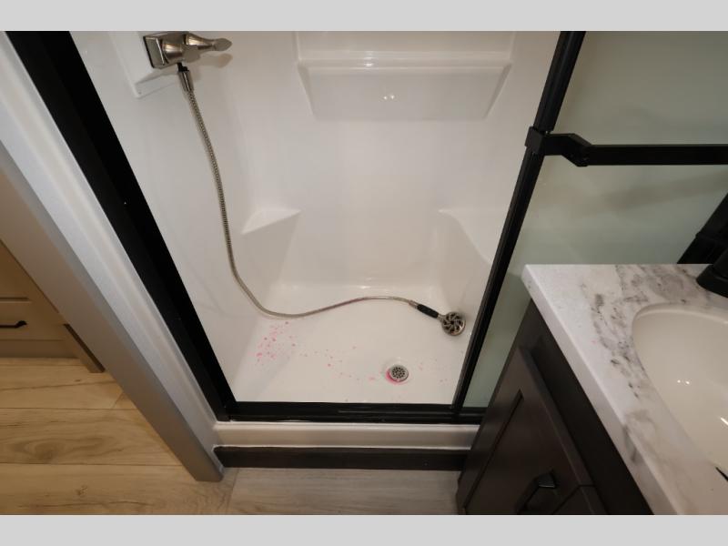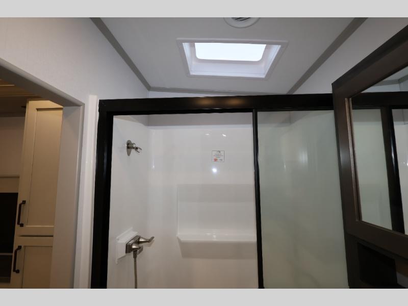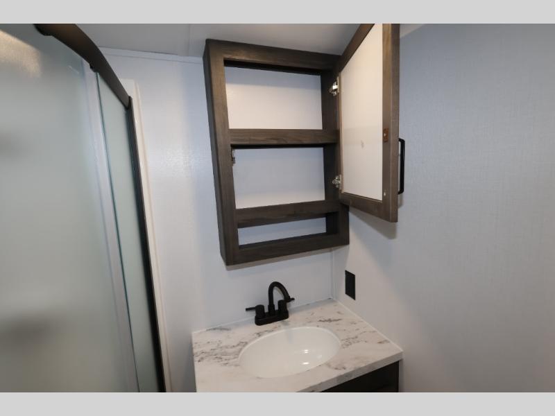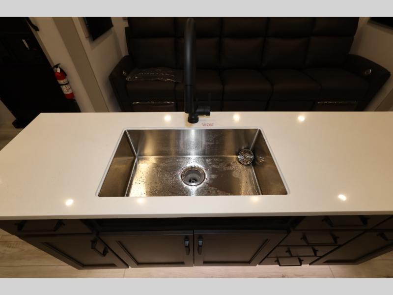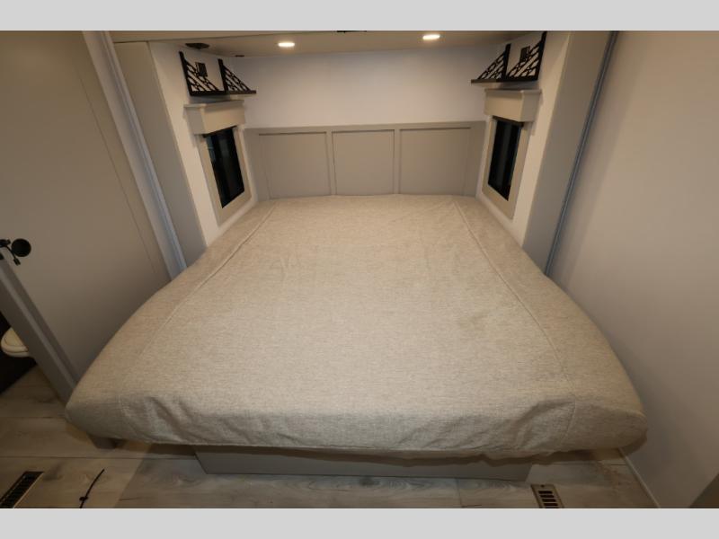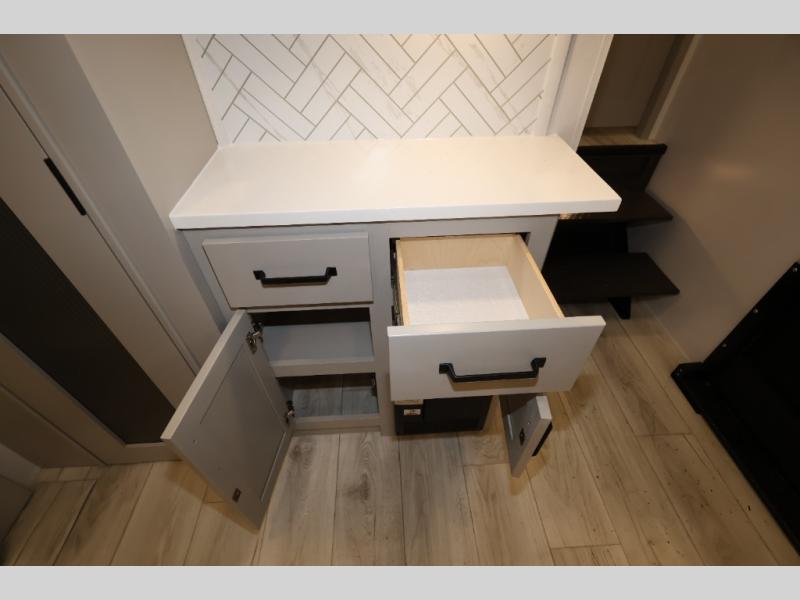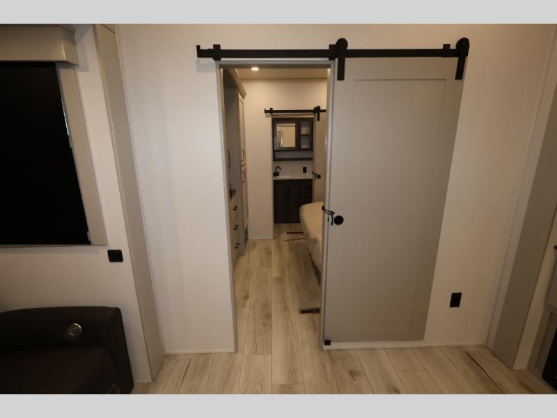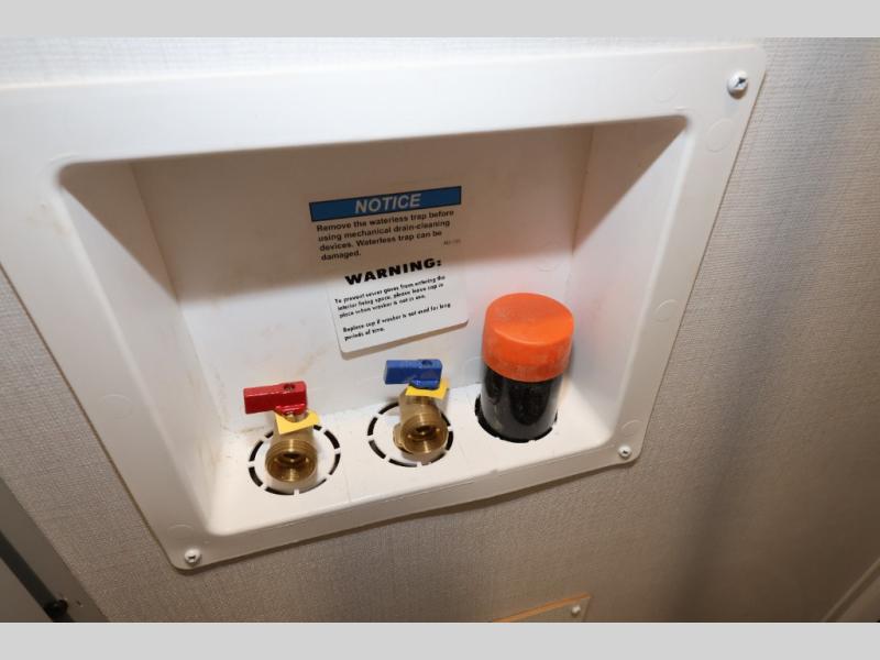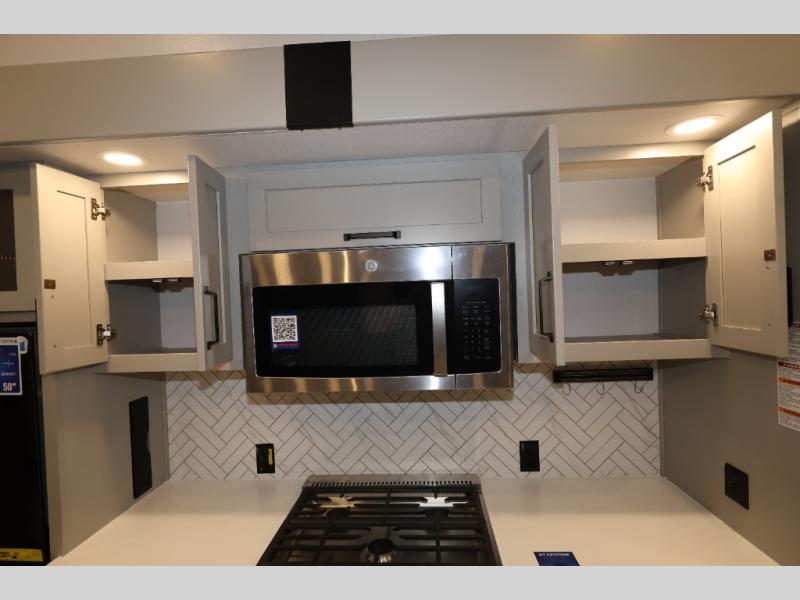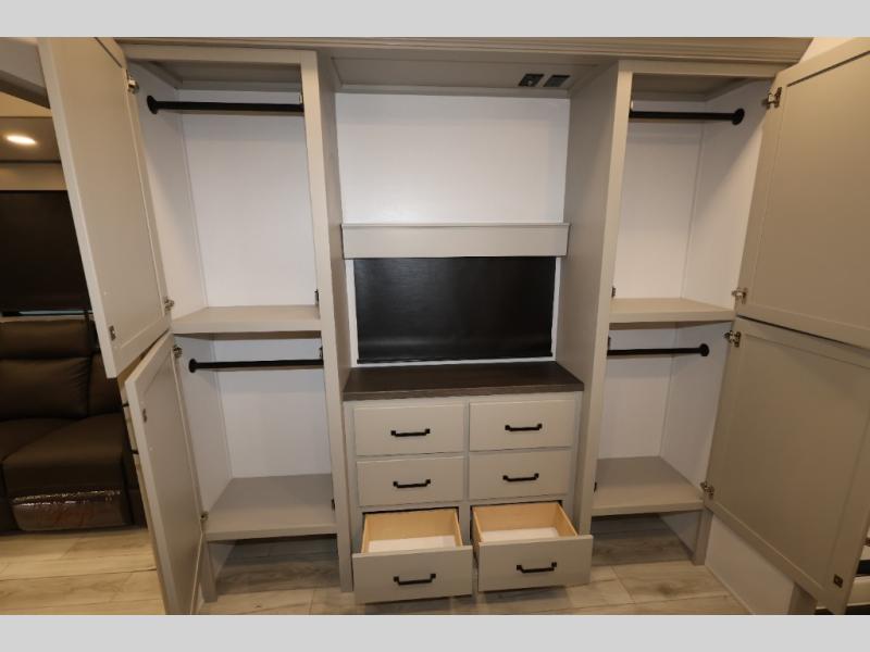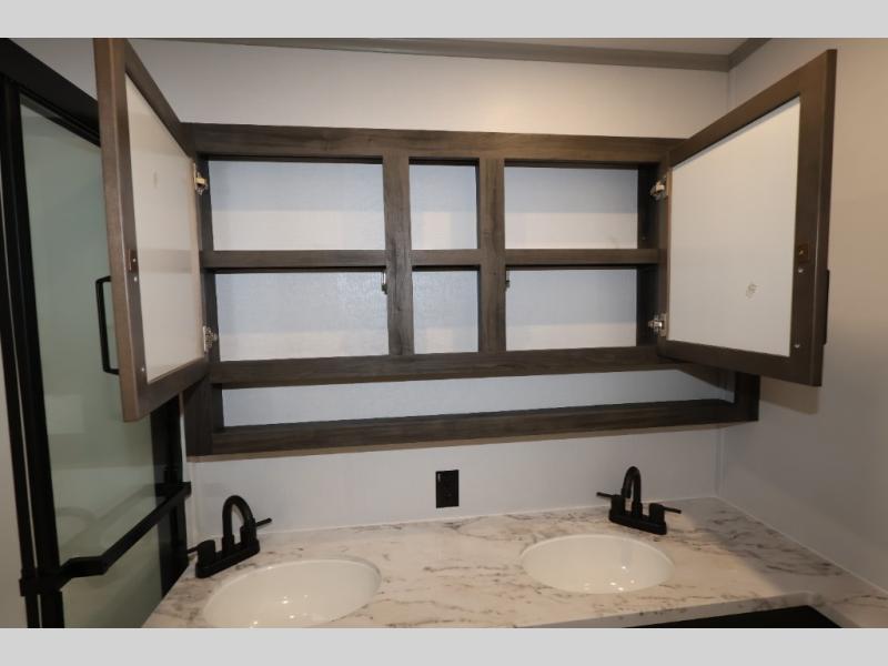 You'll love every minute spent in this spacious fifth wheel! It's perfect to camp with a larger group since there are bunk beds in the front bunkhouse suite plus a second suite in the back. The bunkhouse also includes two desks with chairs and storage drawers, a full bath, plus washer and dryer prep if you plan to go full-time. The rear suite features a king bed slide, two closets, a bedroom countertop plus a full rear bath with dual bath sinks; how convenient! Everyone will love to meet in the combined kitchen and living area in the morning. Here, you'll find two large opposing slides for tons of space, a large sofa and kitchen island, plus three pantries for all the snacks, canned goods, and paper products!