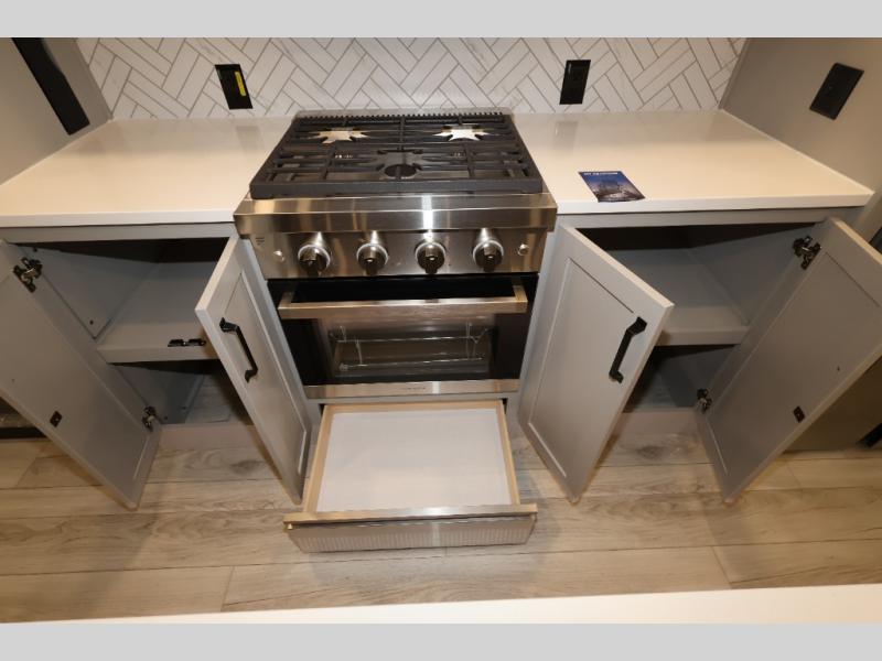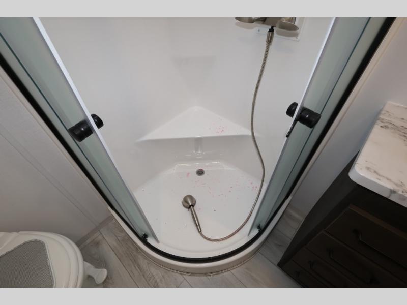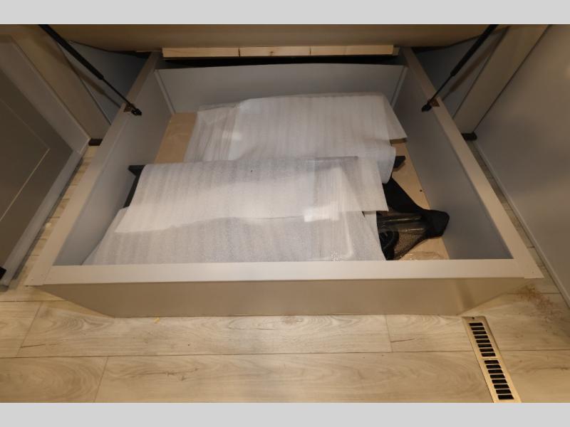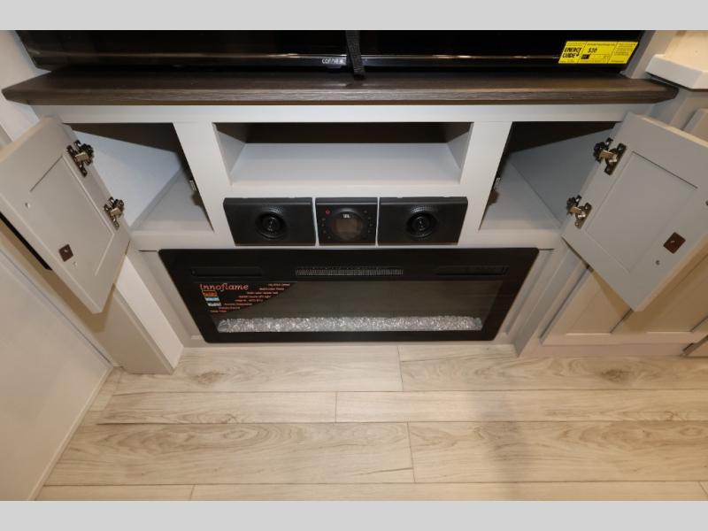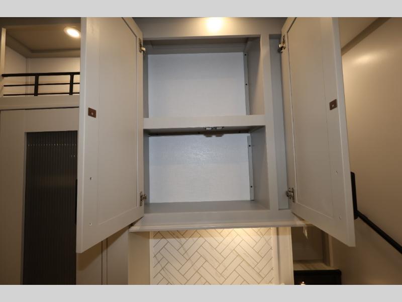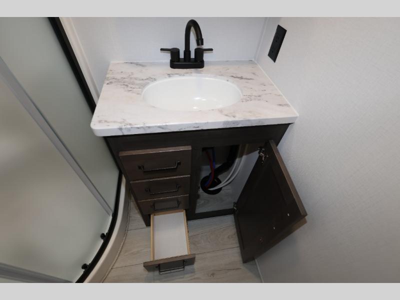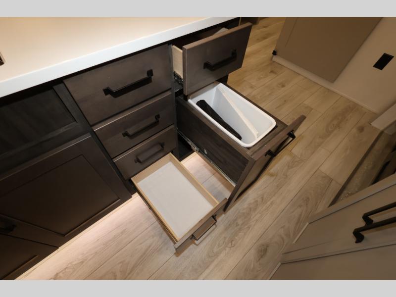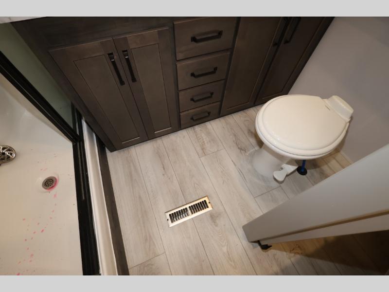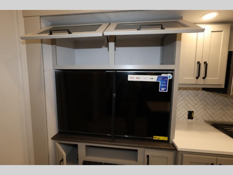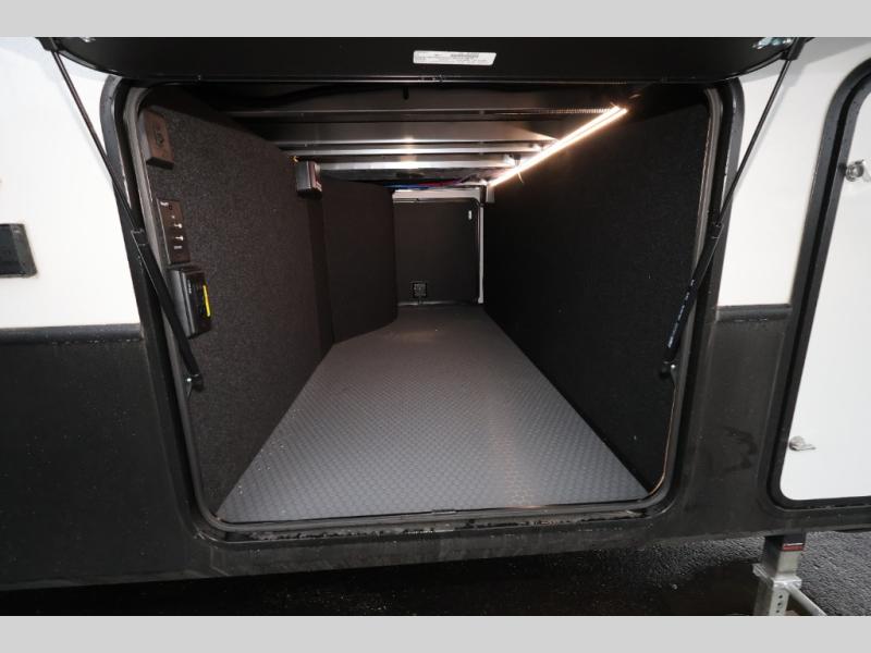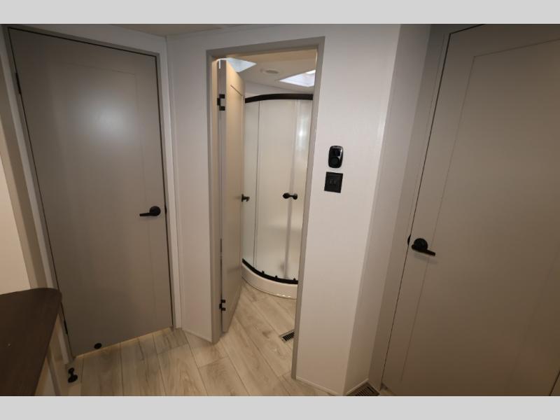You'll love every minute spent in this spacious fifth wheel! It's perfect to camp with a larger group since there are bunk beds in the front bunkhouse suite plus a second suite in the back. The bunkhouse also includes two desks with chairs and storage drawers, a full bath, plus washer and dryer prep if you plan to go full-time. The rear suite features a king bed slide, two closets, a bedroom countertop plus a full rear bath with dual bath sinks; how convenient! Everyone will love to meet in the combined kitchen and living area in the morning. Here, you'll find two large opposing slides for tons of space, a large sofa and kitchen island, plus three pantries for all the snacks, canned goods, and paper products!