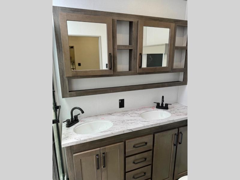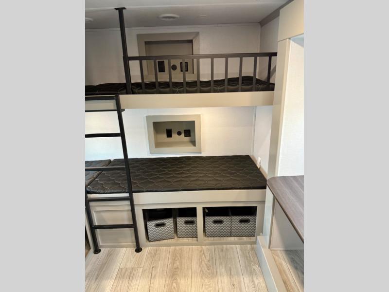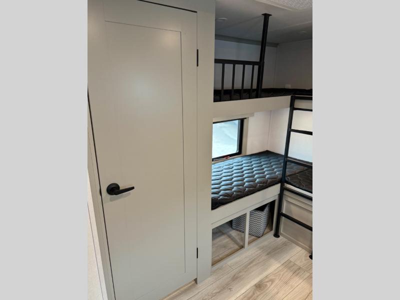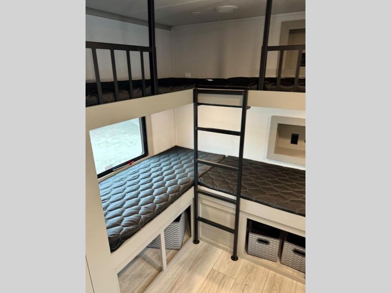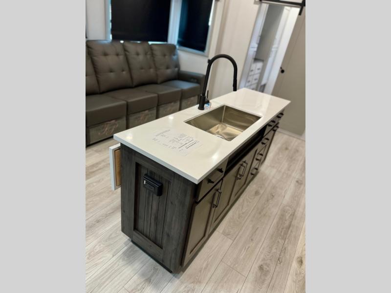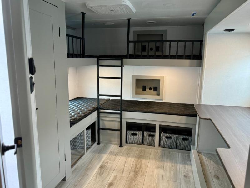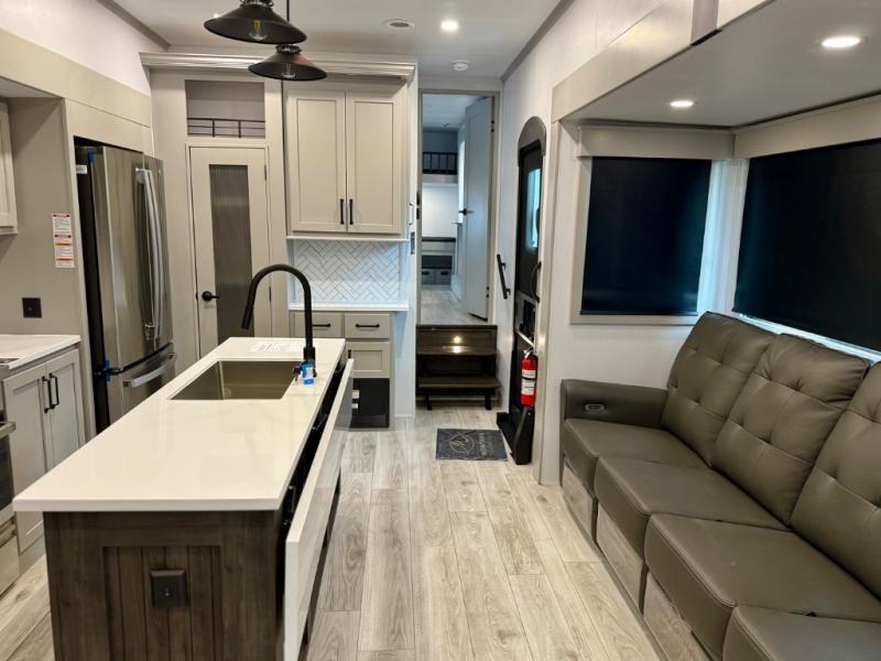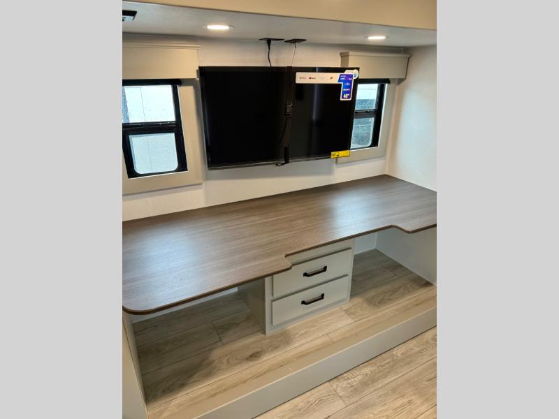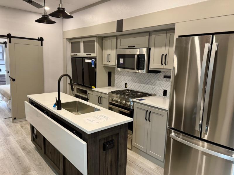 You'll love every minute spent in this spacious fifth wheel! It's perfect to camp with a larger group since there are bunk beds in the front bunkhouse suite plus a second suite in the back. The bunkhouse also includes two desks with chairs and storage drawers, a full bath, plus washer and dryer prep if you plan to go full-time. The rear suite features a king bed slide, two closets, a bedroom countertop plus a full rear bath with dual bath sinks; how convenient! Everyone will love to meet in the combined kitchen and living area in the morning. Here, you'll find two large opposing slides for tons of space, a large sofa and kitchen island, plus three pantries for all the snacks, canned goods, and paper products!
