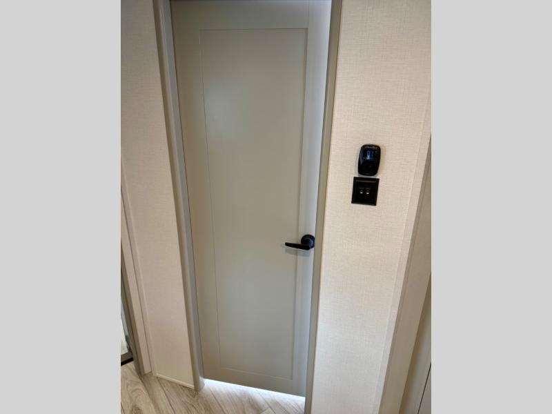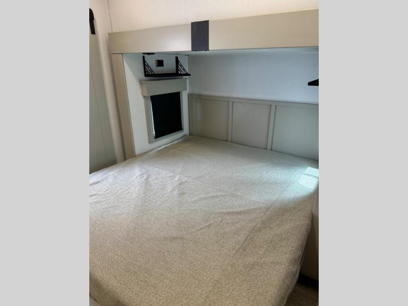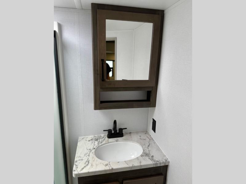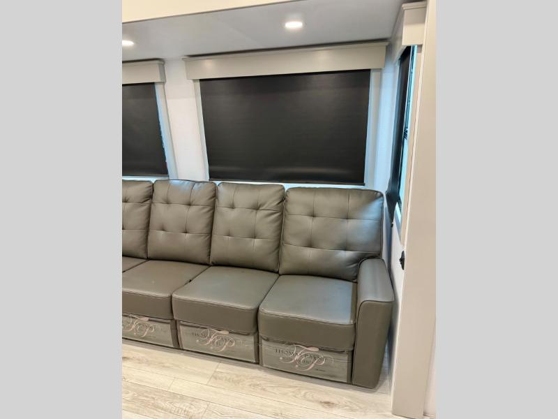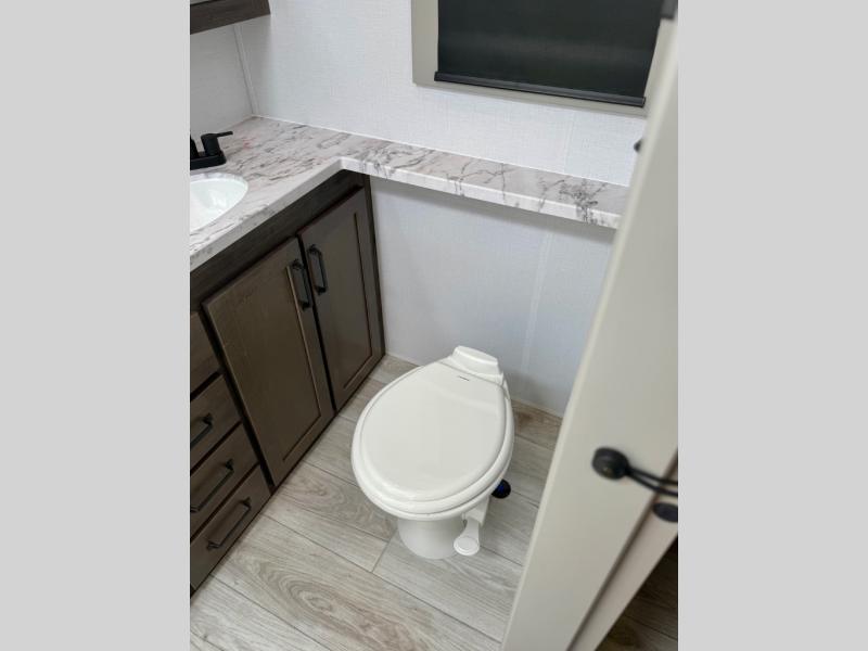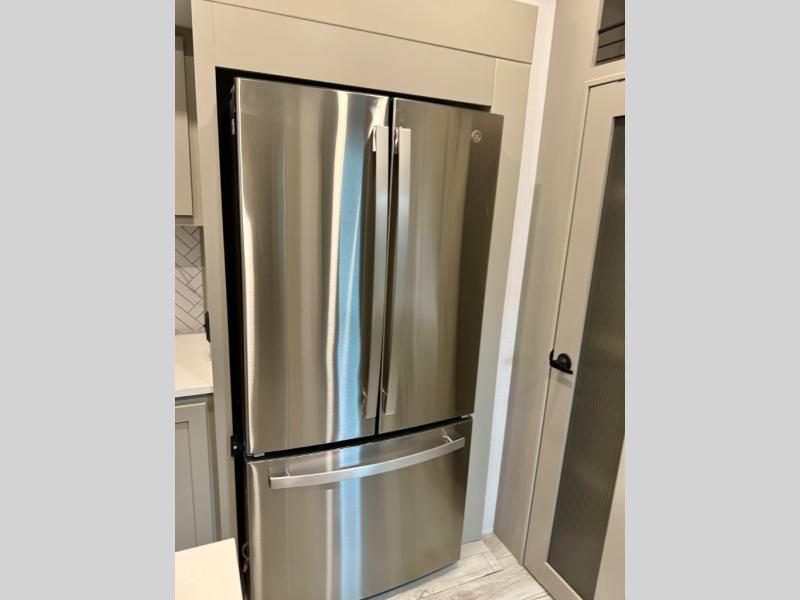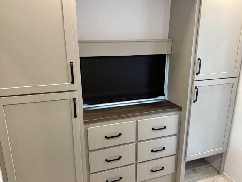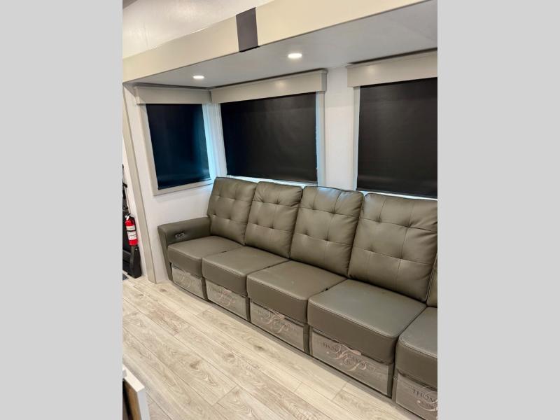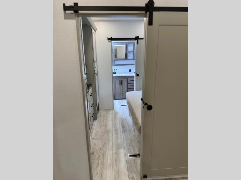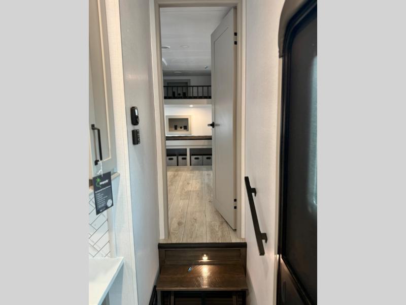 You'll love every minute spent in this spacious fifth wheel! It's perfect to camp with a larger group since there are bunk beds in the front bunkhouse suite plus a second suite in the back. The bunkhouse also includes two desks with chairs and storage drawers, a full bath, plus washer and dryer prep if you plan to go full-time. The rear suite features a king bed slide, two closets, a bedroom countertop plus a full rear bath with dual bath sinks; how convenient! Everyone will love to meet in the combined kitchen and living area in the morning. Here, you'll find two large opposing slides for tons of space, a large sofa and kitchen island, plus three pantries for all the snacks, canned goods, and paper products!