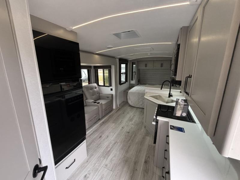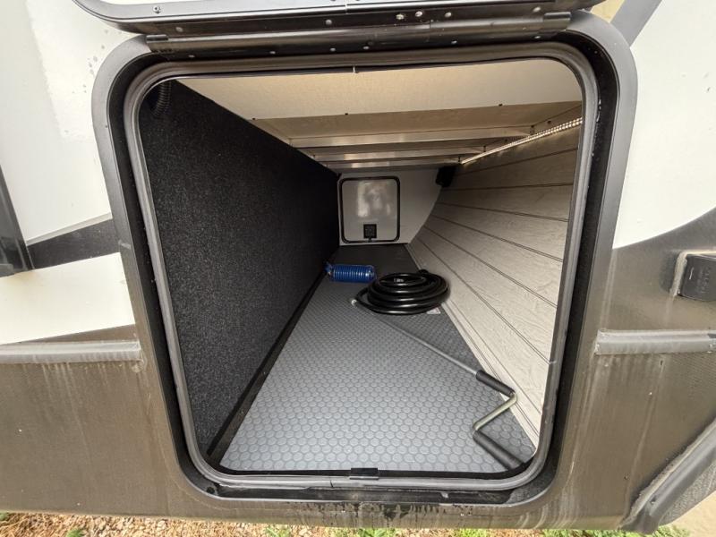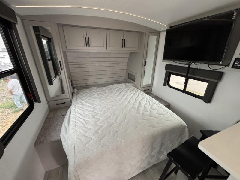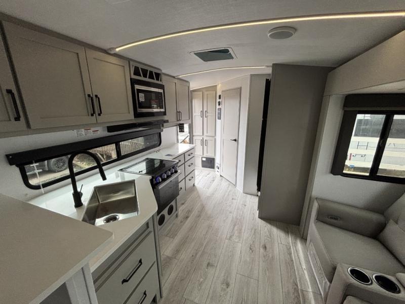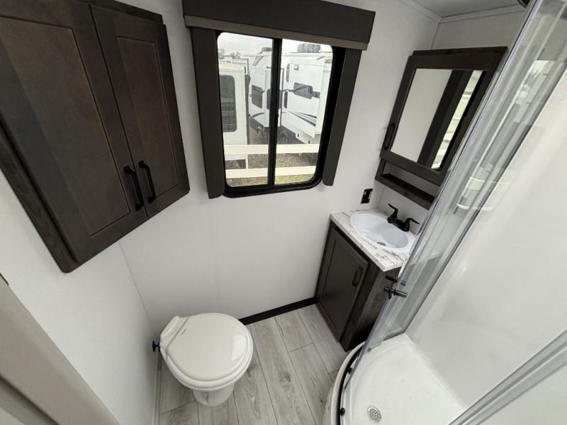 This single slide out travel trailer is perfect for the group of four looking for adventure. There is a queen bed up front with dual wardrobe nightstands, a TV, and a laundry chute that lets you throw dirty clothes straight into the pass-thru storage. The Do-More U-shaped dinette will be perfect for game night, dining, and extra sleeping space for guests. A full kitchen includes a three burner gas range and microwave oven to cook meals, along with a 10 cu. ft. 12V refrigerator for food storage. There is also an entryway pantry/closet for even more storage. And everyone can freshen up in the rear corner bath each day instead of using the camp's facilities!