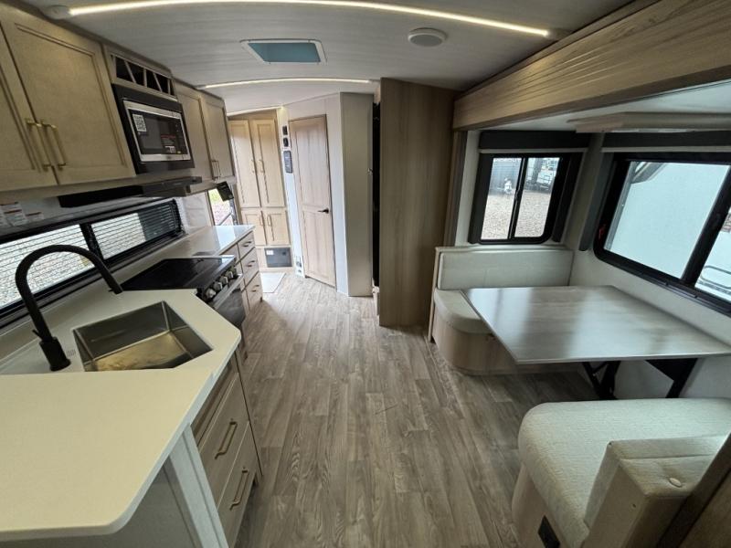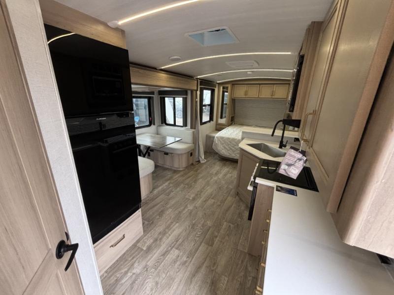 This single slide out travel trailer is perfect for the group of four looking for adventure. There is a queen bed up front with dual wardrobe nightstands, a TV, and a laundry chute that lets you throw dirty clothes straight into the pass-thru storage. The Do-More U-shaped dinette will be perfect for game night, dining, and extra sleeping space for guests. A full kitchen includes a three burner gas range and microwave oven to cook meals, along with a 10 cu. ft. 12V refrigerator for food storage. There is also an entryway pantry/closet for even more storage. And everyone can freshen up in the rear corner bath each day instead of using the camp's facilities!