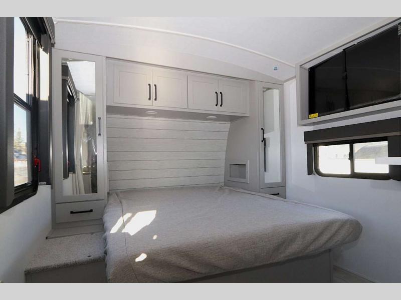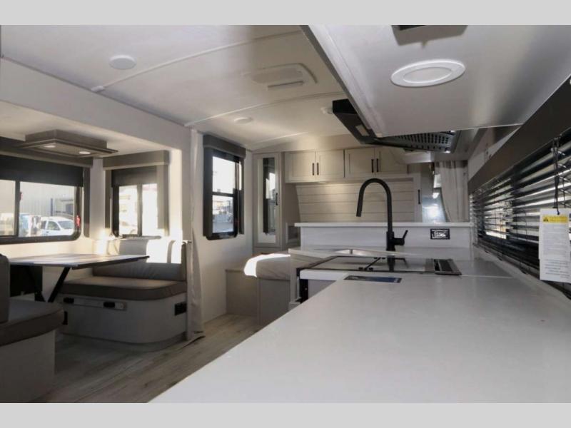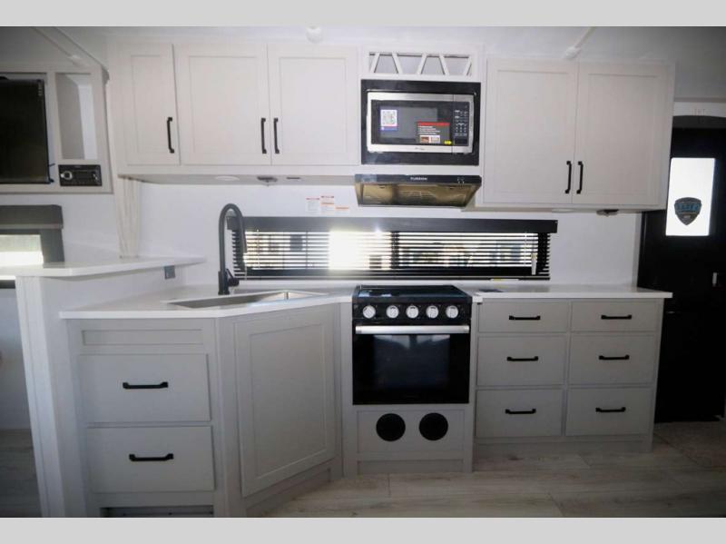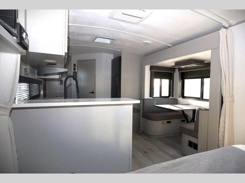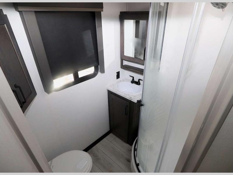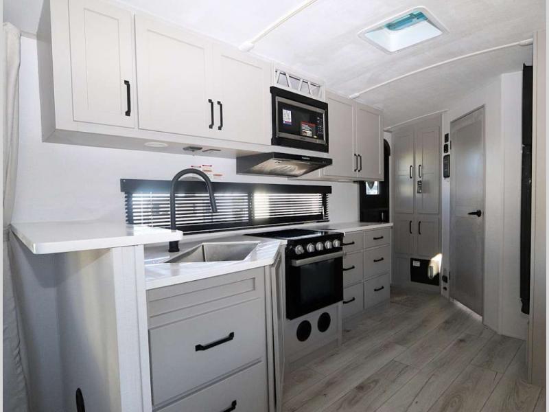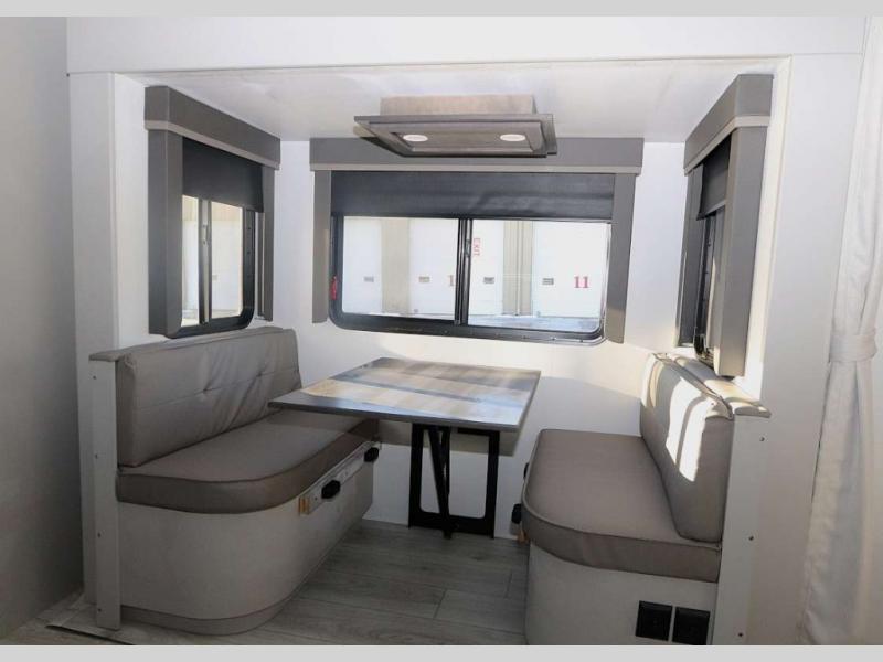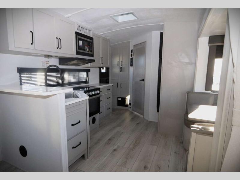 This single slide out travel trailer is perfect for the group of four looking for adventure. There is a queen bed up front with dual wardrobe nightstands, a TV, and a laundry chute that lets you throw dirty clothes straight into the pass-thru storage. The Do-More U-shaped dinette will be perfect for game night, dining, and extra sleeping space for guests. A full kitchen includes a three burner gas range and microwave oven to cook meals, along with a 10 cu. ft. 12V refrigerator for food storage. There is also an entryway pantry/closet for even more storage. And everyone can freshen up in the rear corner bath each day instead of using the camp's facilities!