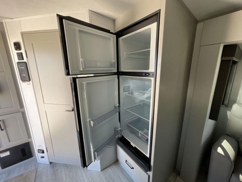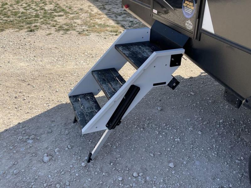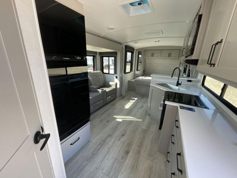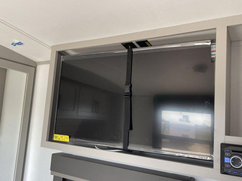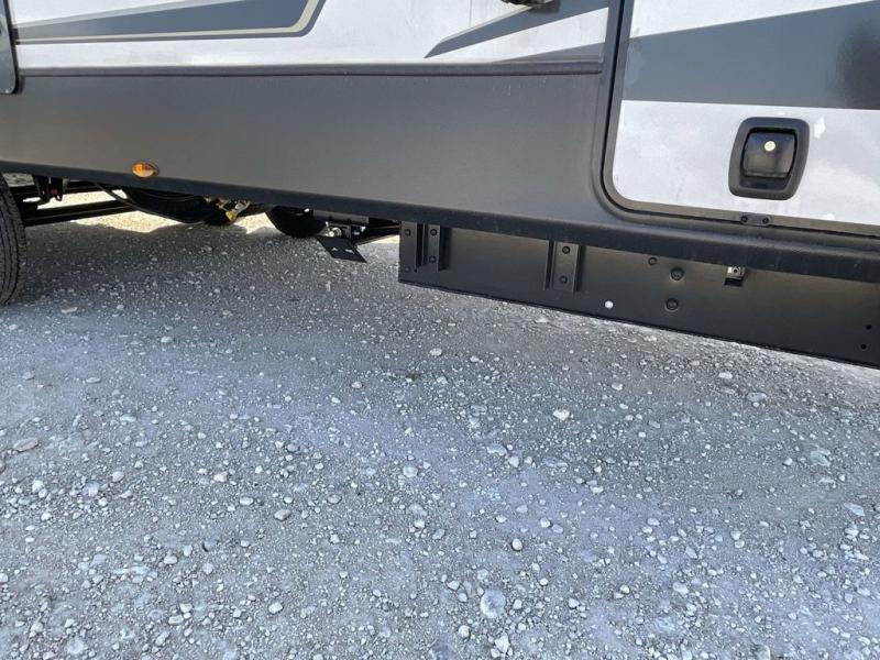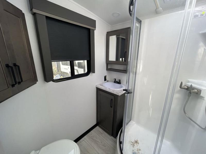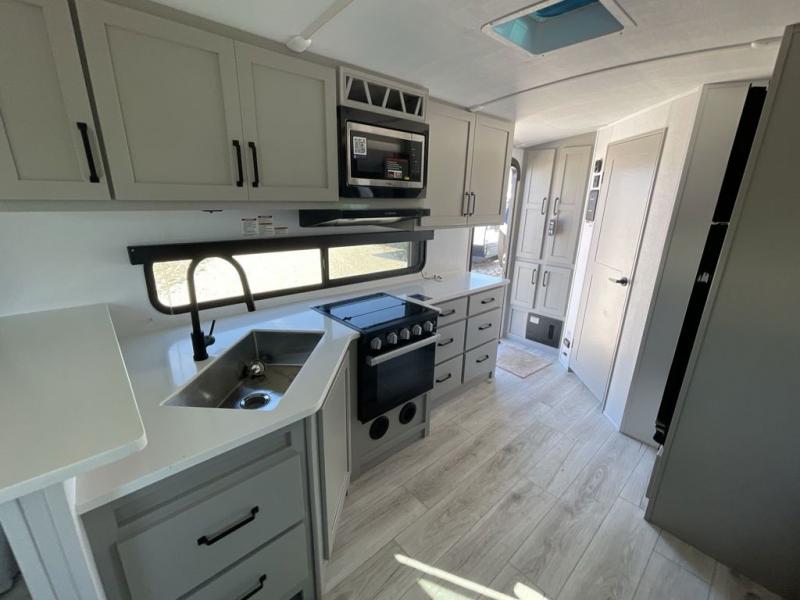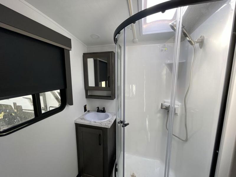 This single slide out travel trailer is perfect for the group of four looking for adventure. There is a queen bed up front with dual wardrobe nightstands, a TV, and a laundry chute that lets you throw dirty clothes straight into the pass-thru storage. The Do-More U-shaped dinette will be perfect for game night, dining, and extra sleeping space for guests. A full kitchen includes a three burner gas range and microwave oven to cook meals, along with a 10 cu. ft. 12V refrigerator for food storage. There is also an entryway pantry/closet for even more storage. And everyone can freshen up in the rear corner bath each day instead of using the camp's facilities!