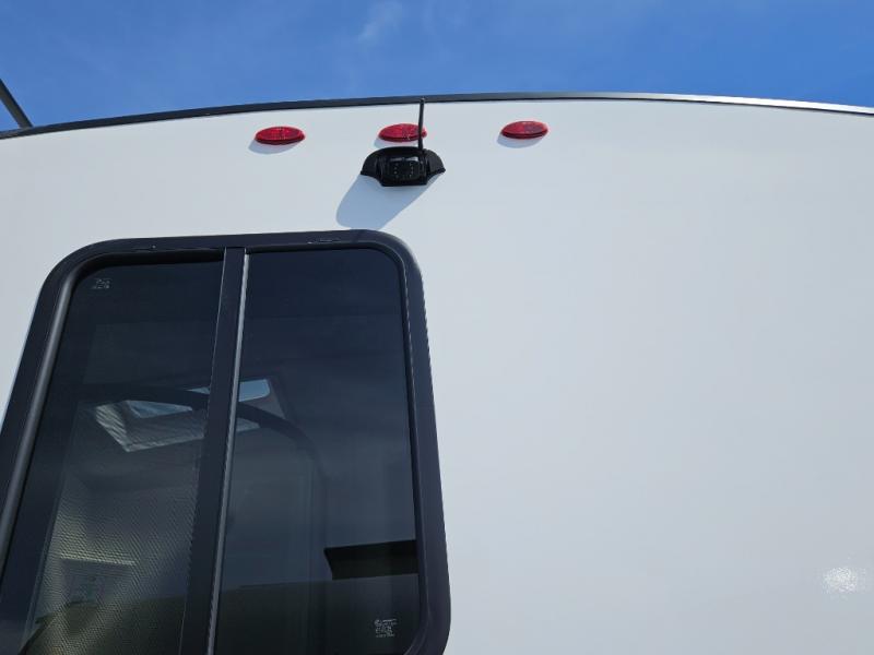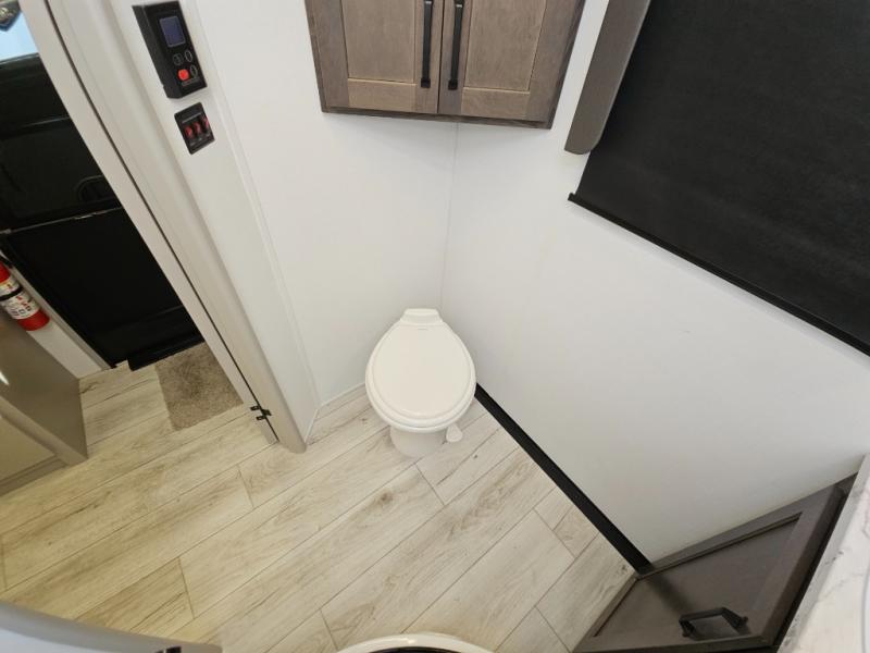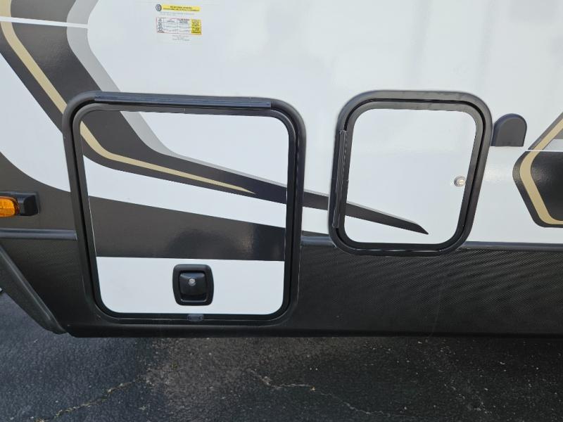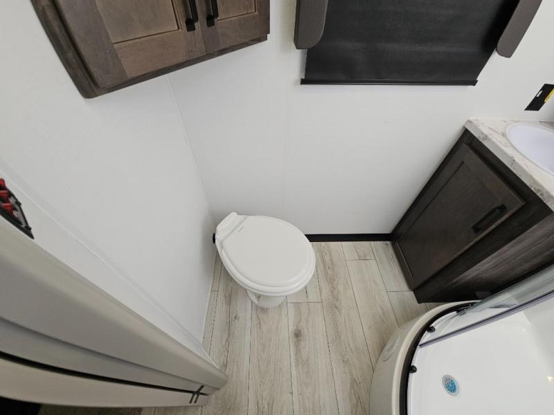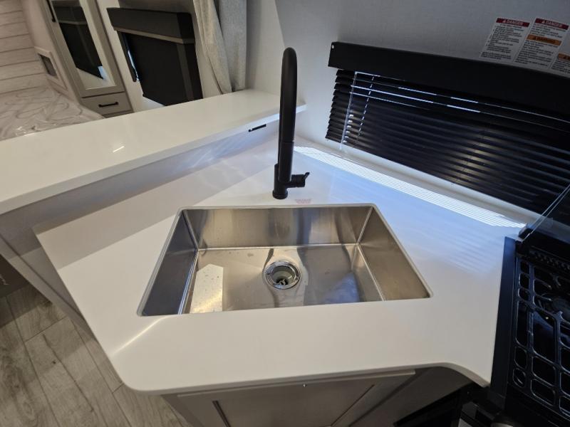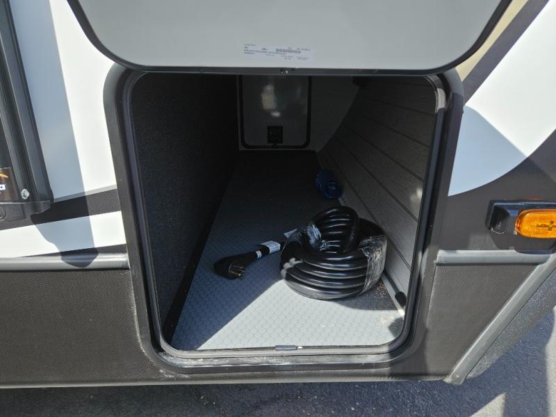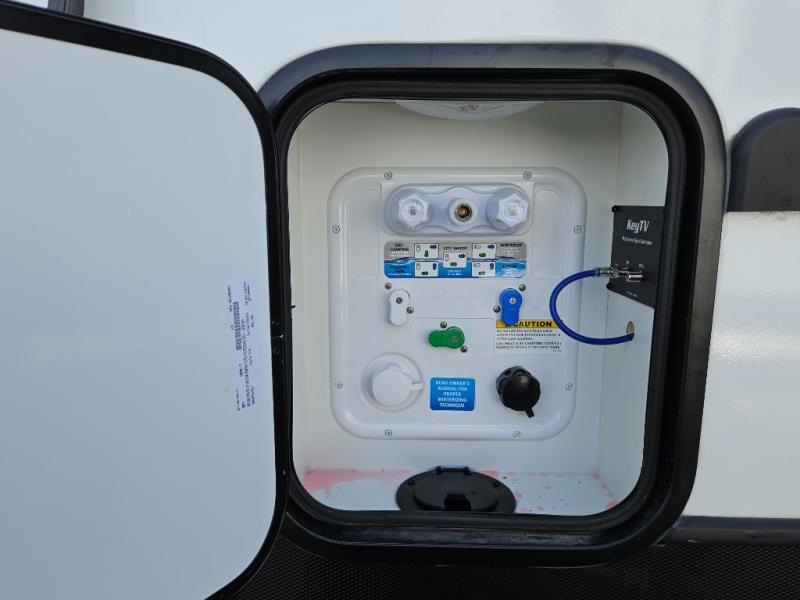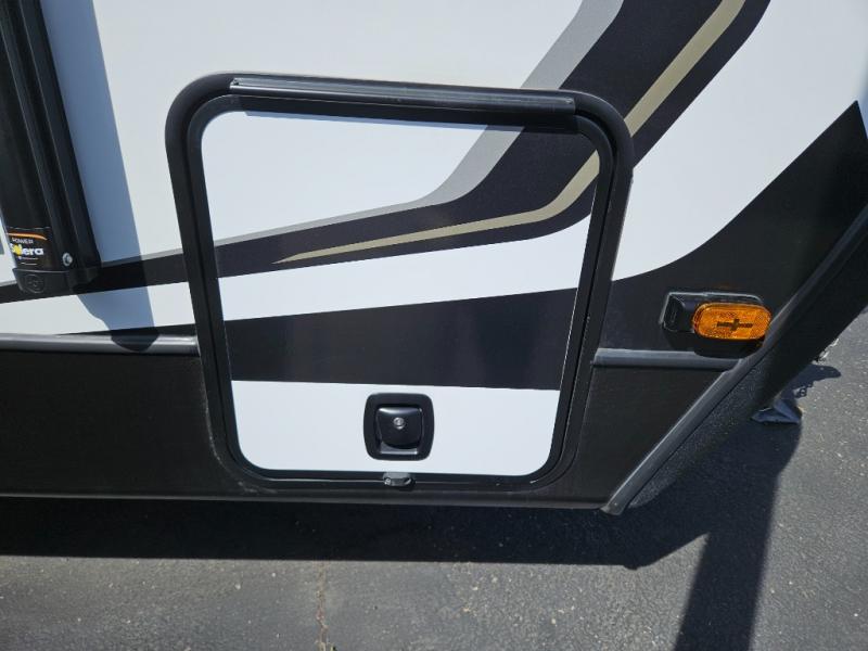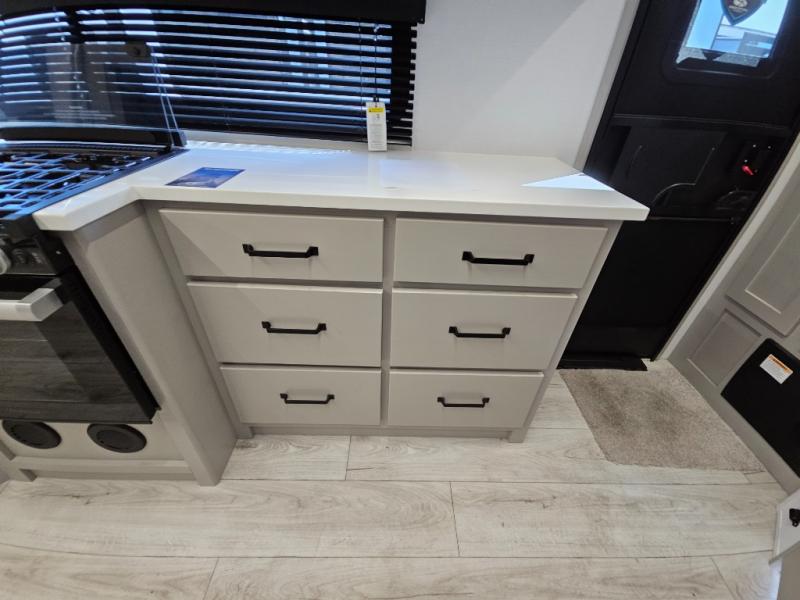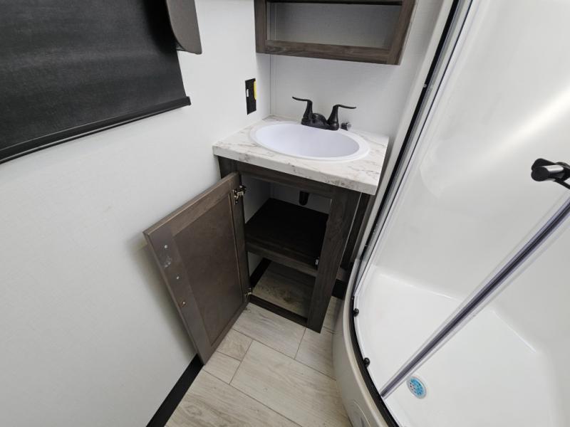 This single slide out travel trailer is perfect for the group of four looking for adventure. There is a queen bed up front with dual wardrobe nightstands, a TV, and a laundry chute that lets you throw dirty clothes straight into the pass-thru storage. The Do-More U-shaped dinette will be perfect for game night, dining, and extra sleeping space for guests. A full kitchen includes a three burner gas range and microwave oven to cook meals, along with a 10 cu. ft. 12V refrigerator for food storage. There is also an entryway pantry/closet for even more storage. And everyone can freshen up in the rear corner bath each day instead of using the camp's facilities!