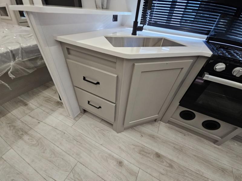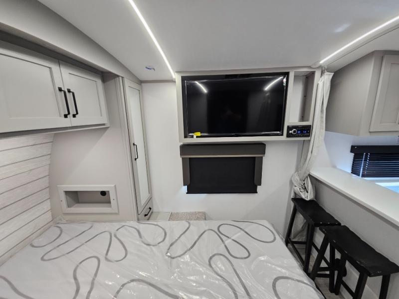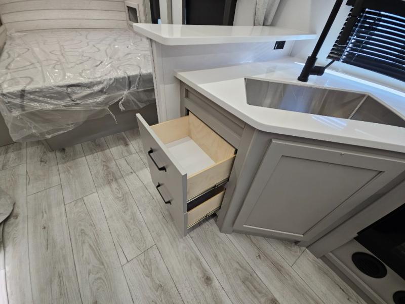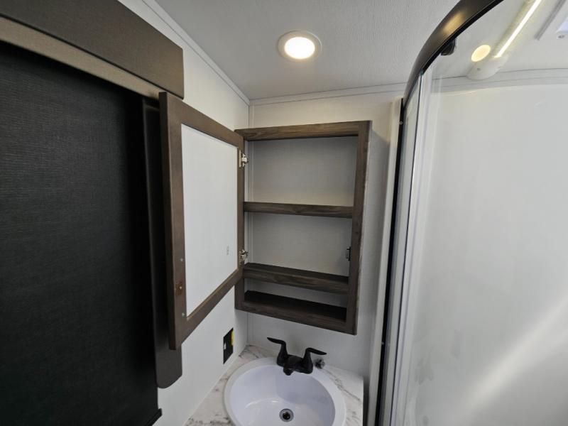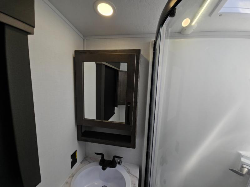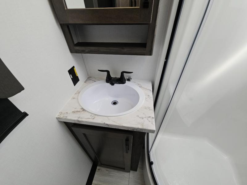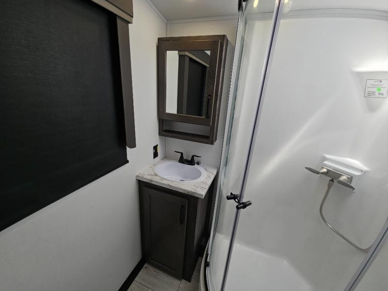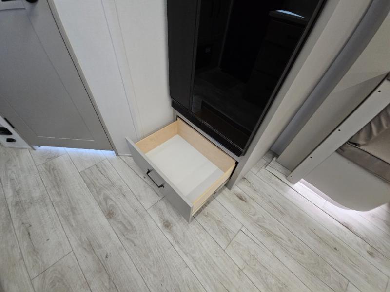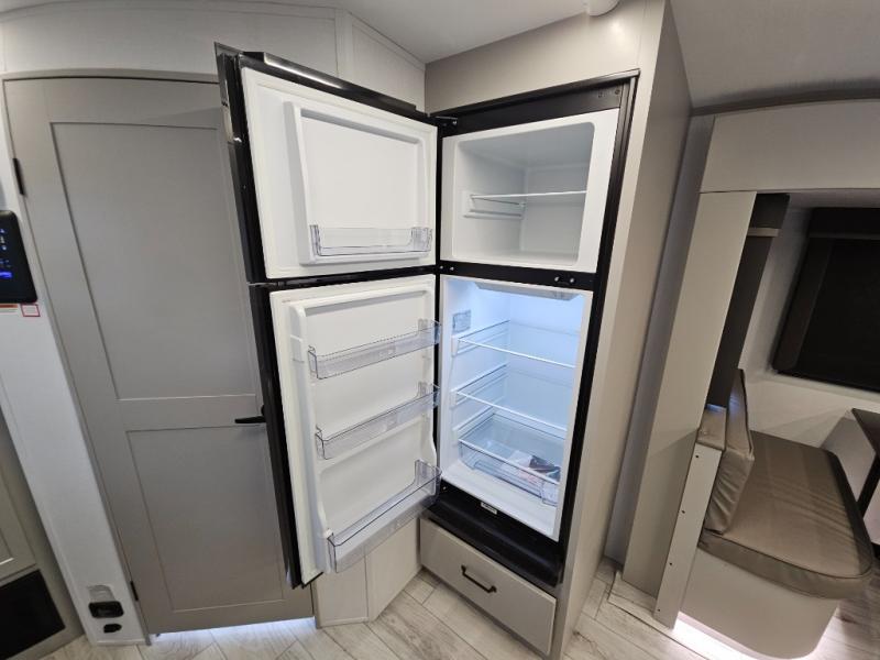 This single slide out travel trailer is perfect for the group of four looking for adventure. There is a queen bed up front with dual wardrobe nightstands, a TV, and a laundry chute that lets you throw dirty clothes straight into the pass-thru storage. The Do-More U-shaped dinette will be perfect for game night, dining, and extra sleeping space for guests. A full kitchen includes a three burner gas range and microwave oven to cook meals, along with a 10 cu. ft. 12V refrigerator for food storage. There is also an entryway pantry/closet for even more storage. And everyone can freshen up in the rear corner bath each day instead of using the camp's facilities!