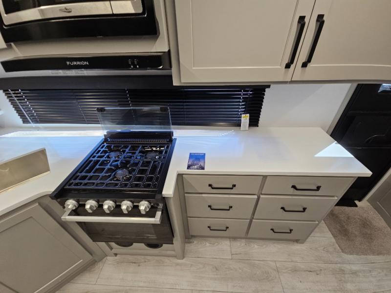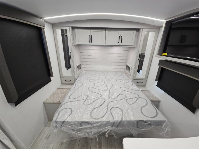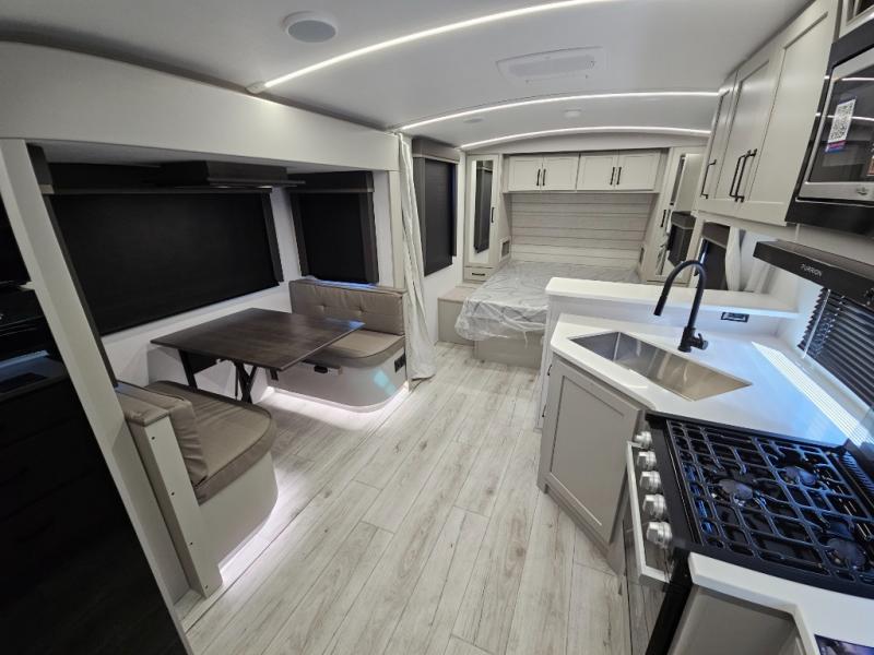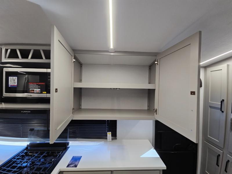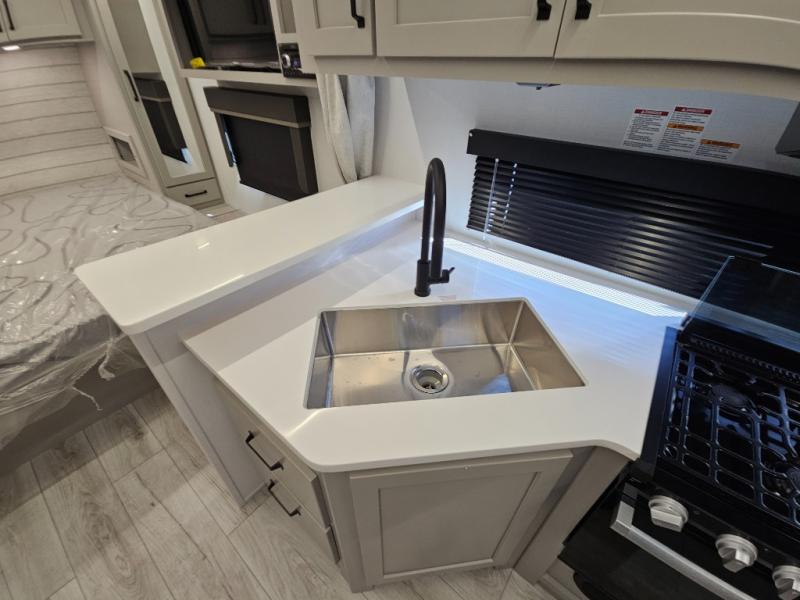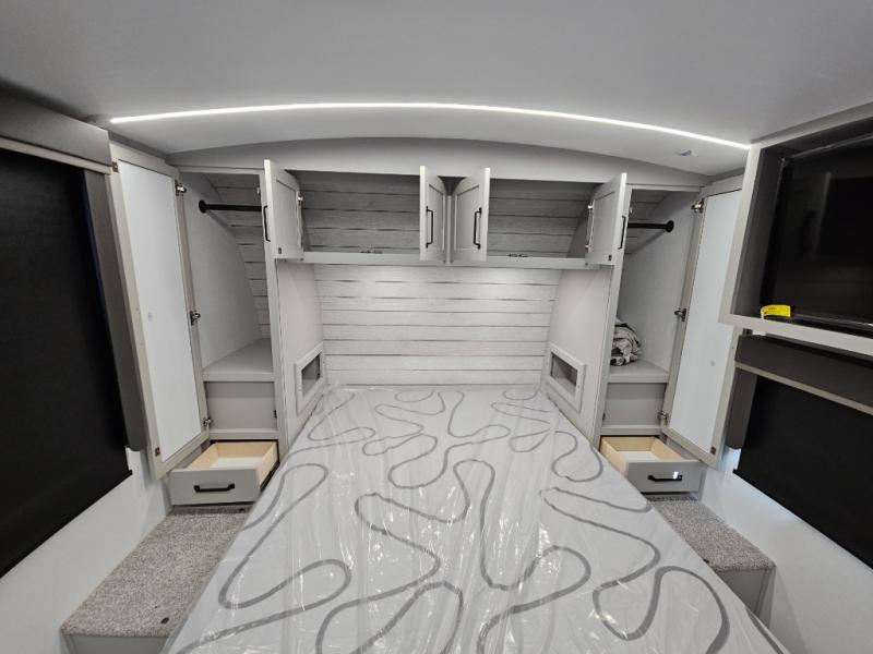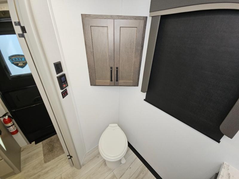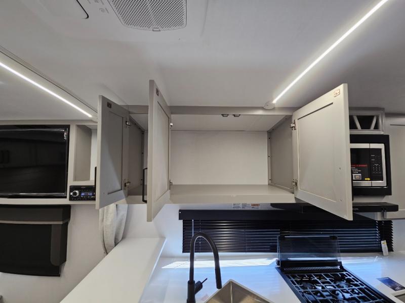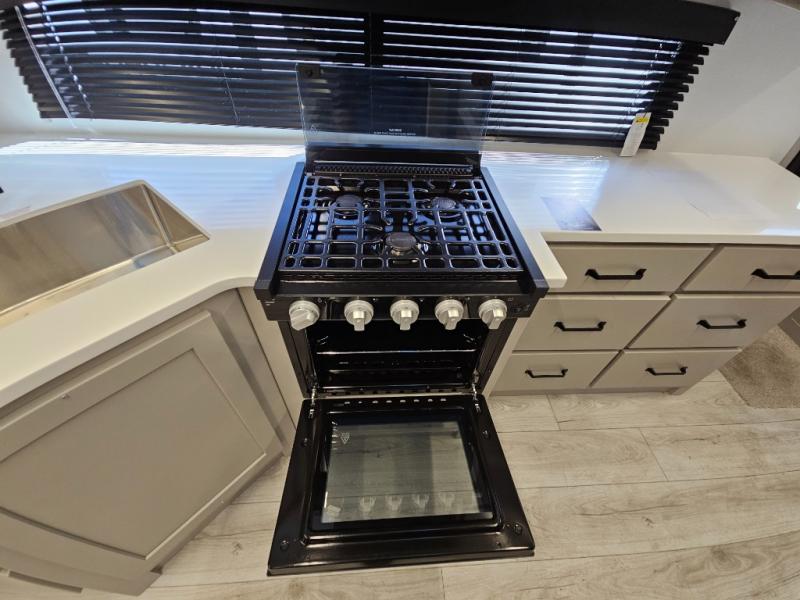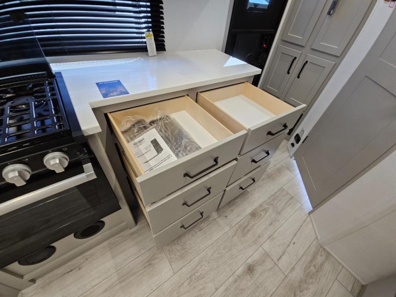 This single slide out travel trailer is perfect for the group of four looking for adventure. There is a queen bed up front with dual wardrobe nightstands, a TV, and a laundry chute that lets you throw dirty clothes straight into the pass-thru storage. The Do-More U-shaped dinette will be perfect for game night, dining, and extra sleeping space for guests. A full kitchen includes a three burner gas range and microwave oven to cook meals, along with a 10 cu. ft. 12V refrigerator for food storage. There is also an entryway pantry/closet for even more storage. And everyone can freshen up in the rear corner bath each day instead of using the camp's facilities!