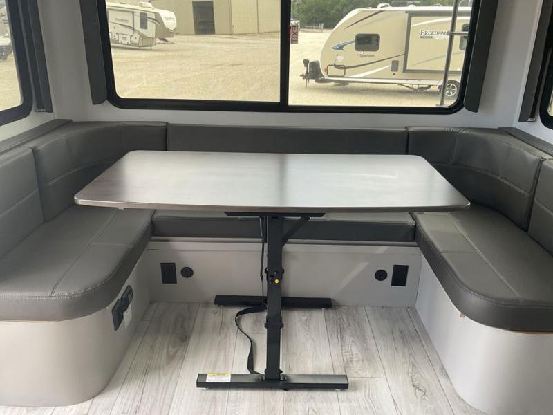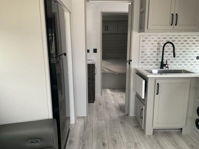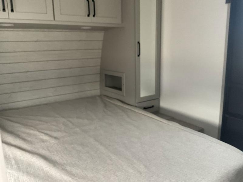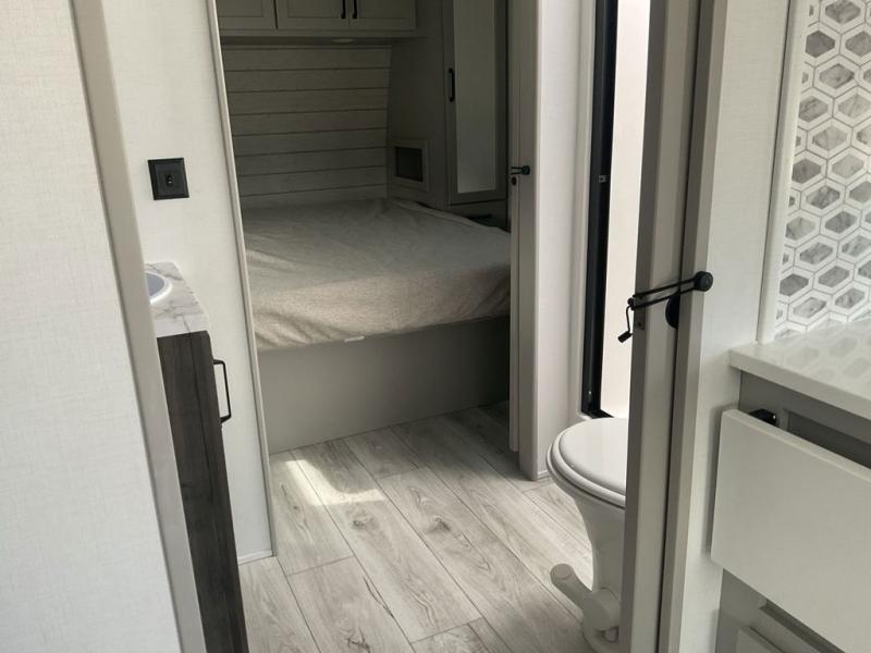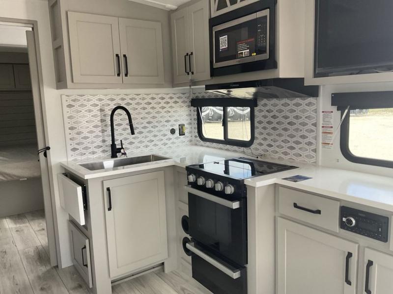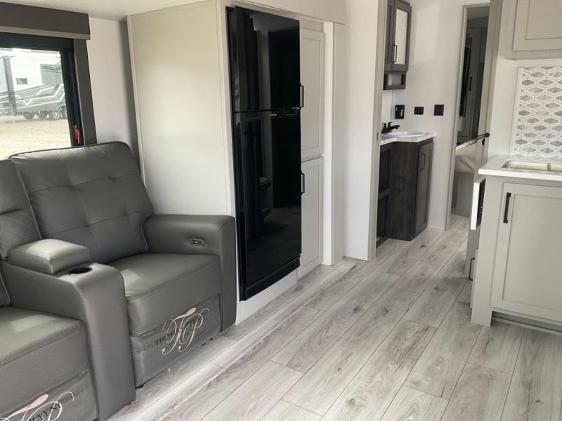 With dual entry doors on this travel trailer, you can enter in through the front master bedroom or the main living area and kitchen. The walk-thru bath will be easily accessible for everyone, and your guests can sleep on the dinette table or tri-fold sofa sleeper. If you're not needing the extra sleeping space, just choose the optional theater seat. A full kitchen with a three burner range and microwave oven will let you make meals each day, and there is added storage for all your kitchen necessities. You'll love the queen bed in the front master bedroom, along with dual wardrobe nightstands and a laundry chute that goes straight into the pass-thru storage for easy clean up.