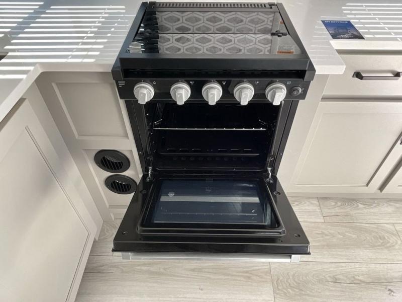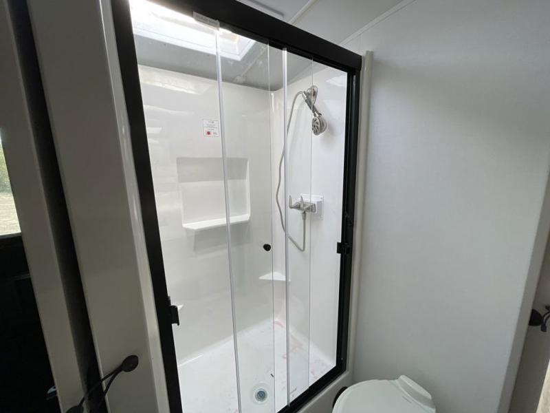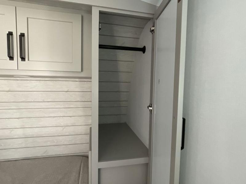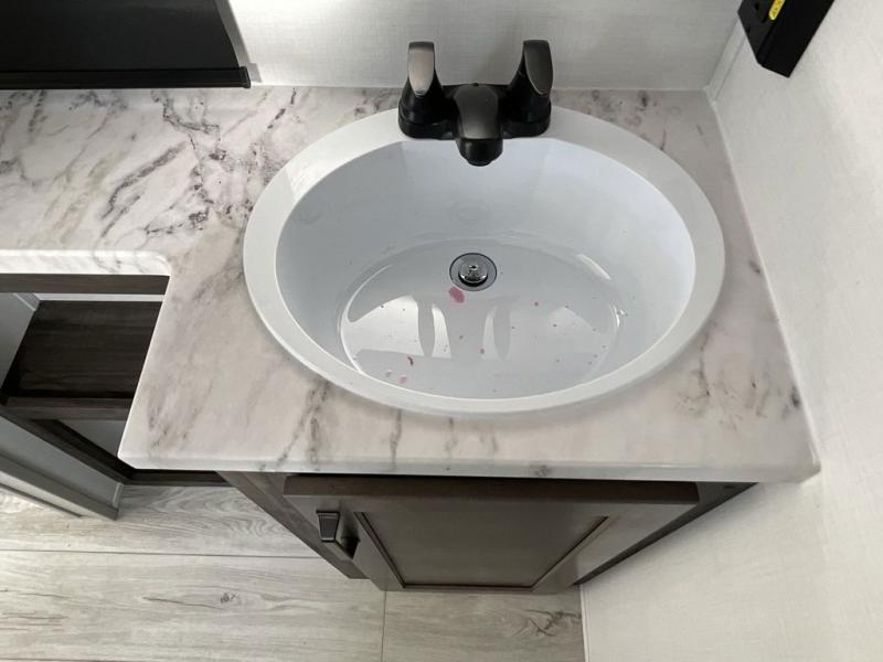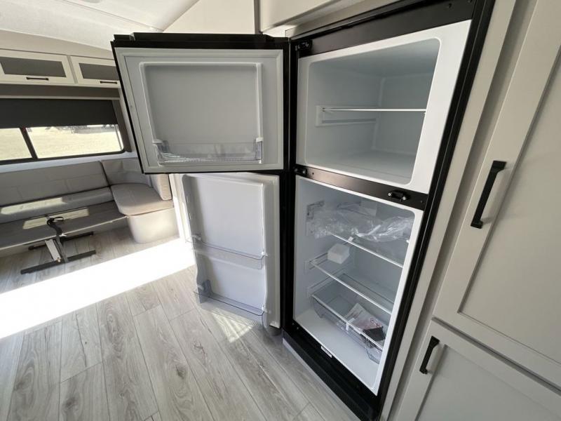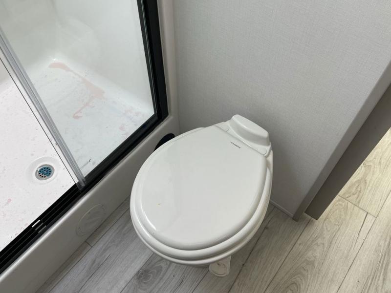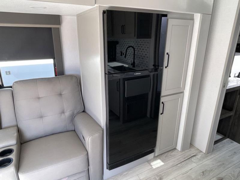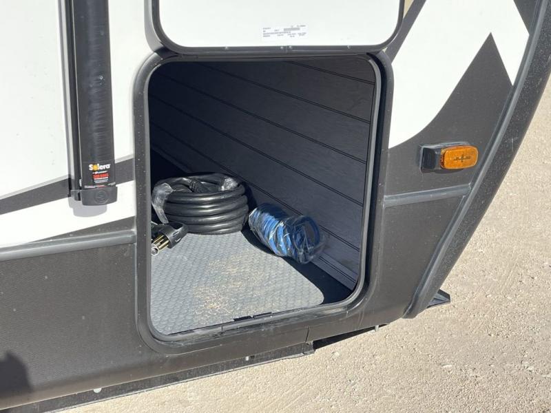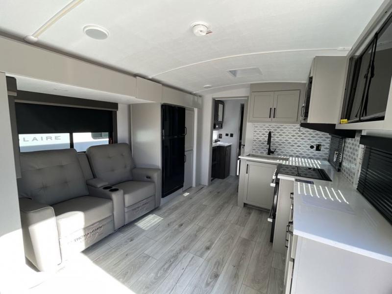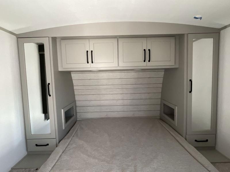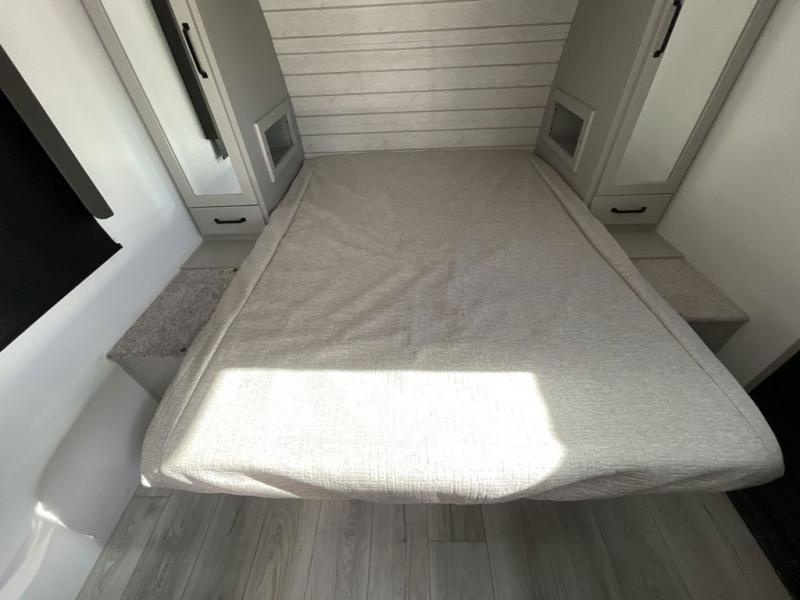 With dual entry doors on this travel trailer, you can enter in through the front master bedroom or the main living area and kitchen. The walk-thru bath will be easily accessible for everyone, and your guests can sleep on the dinette table or tri-fold sofa sleeper. If you're not needing the extra sleeping space, just choose the optional theater seat. A full kitchen with a three burner range and microwave oven will let you make meals each day, and there is added storage for all your kitchen necessities. You'll love the queen bed in the front master bedroom, along with dual wardrobe nightstands and a laundry chute that goes straight into the pass-thru storage for easy clean up.