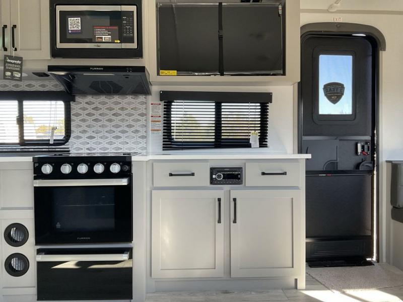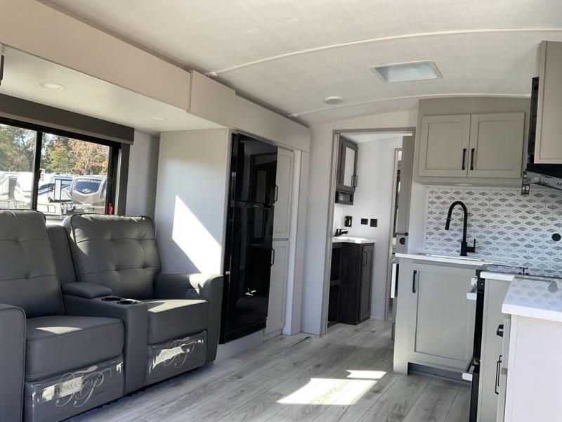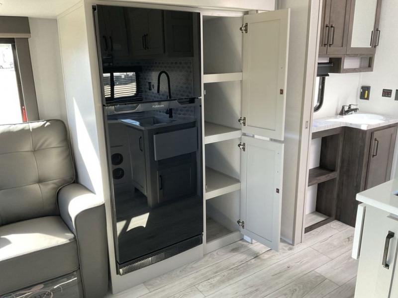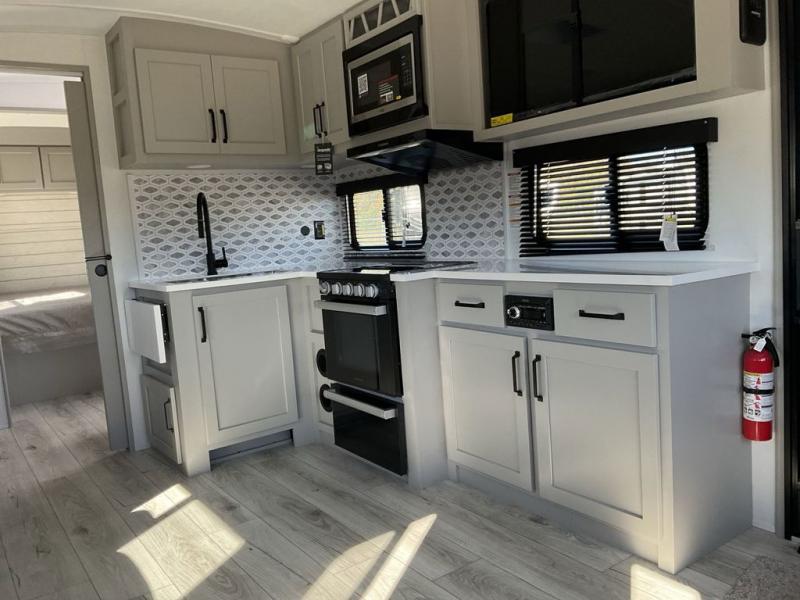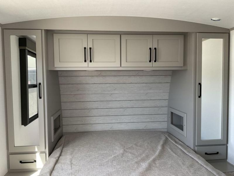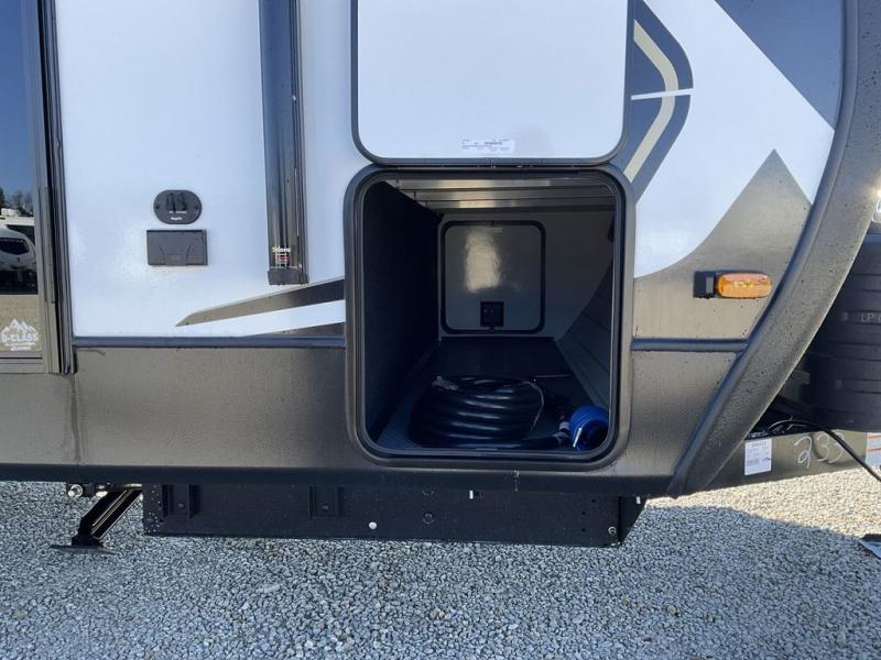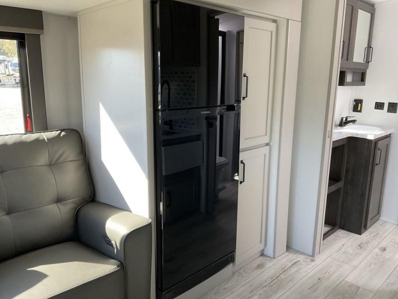 With dual entry doors on this travel trailer, you can enter in through the front master bedroom or the main living area and kitchen. The walk-thru bath will be easily accessible for everyone, and your guests can sleep on the dinette table or tri-fold sofa sleeper. If you're not needing the extra sleeping space, just choose the optional theater seat. A full kitchen with a three burner range and microwave oven will let you make meals each day, and there is added storage for all your kitchen necessities. You'll love the queen bed in the front master bedroom, along with dual wardrobe nightstands and a laundry chute that goes straight into the pass-thru storage for easy clean up.