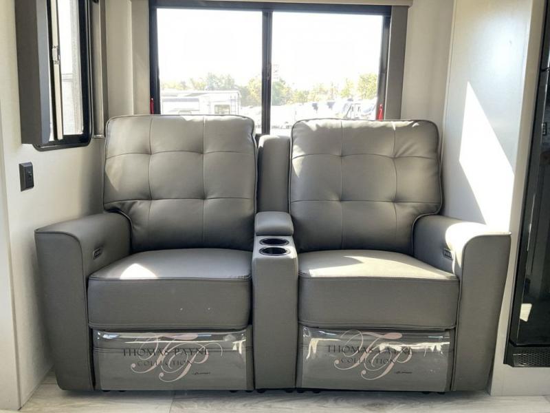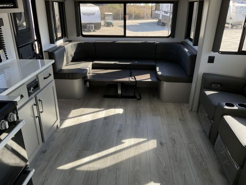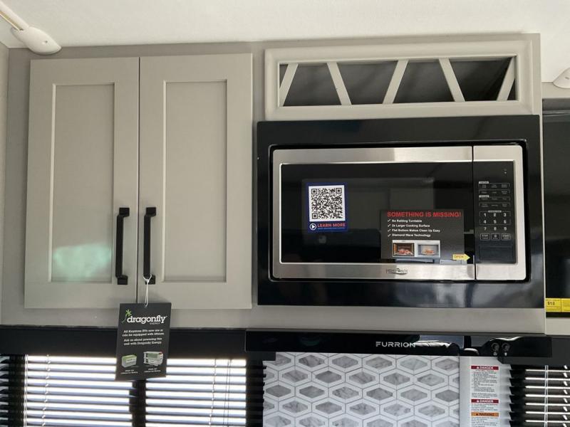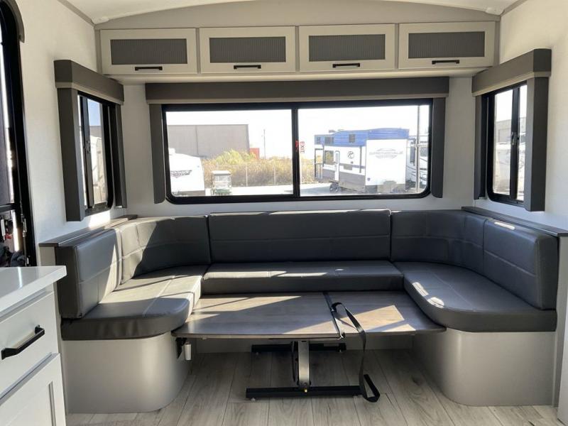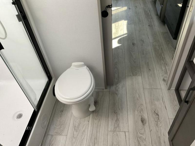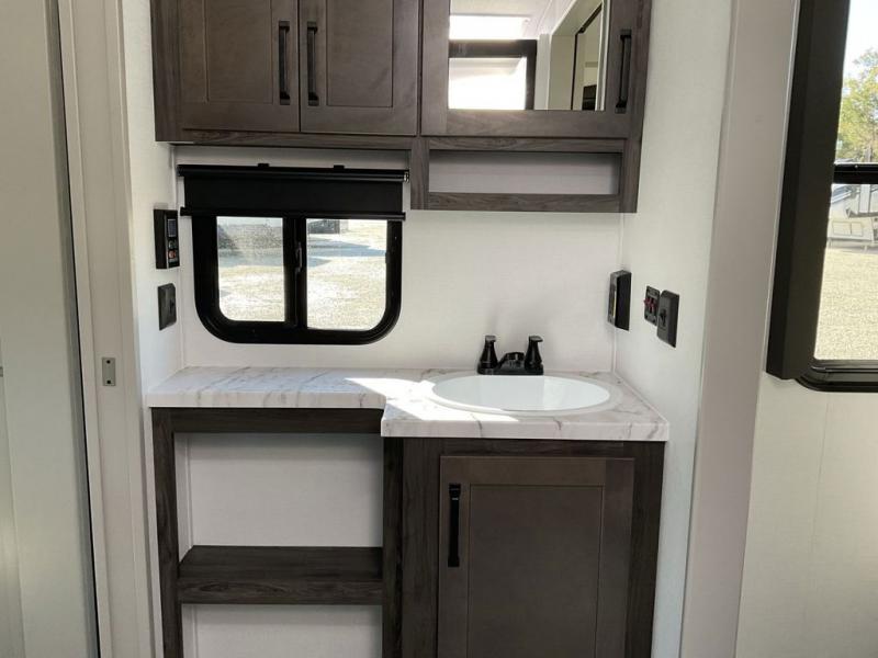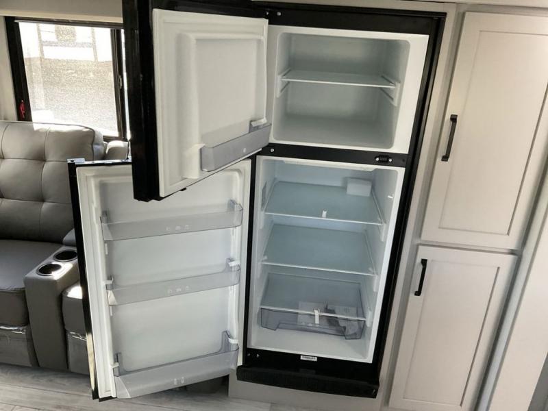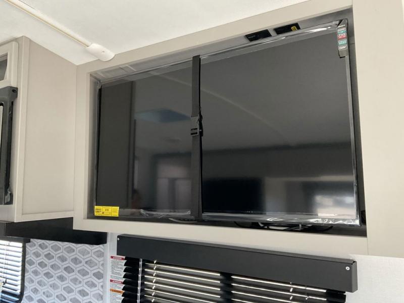 With dual entry doors on this travel trailer, you can enter in through the front master bedroom or the main living area and kitchen. The walk-thru bath will be easily accessible for everyone, and your guests can sleep on the dinette table or tri-fold sofa sleeper. If you're not needing the extra sleeping space, just choose the optional theater seat. A full kitchen with a three burner range and microwave oven will let you make meals each day, and there is added storage for all your kitchen necessities. You'll love the queen bed in the front master bedroom, along with dual wardrobe nightstands and a laundry chute that goes straight into the pass-thru storage for easy clean up.