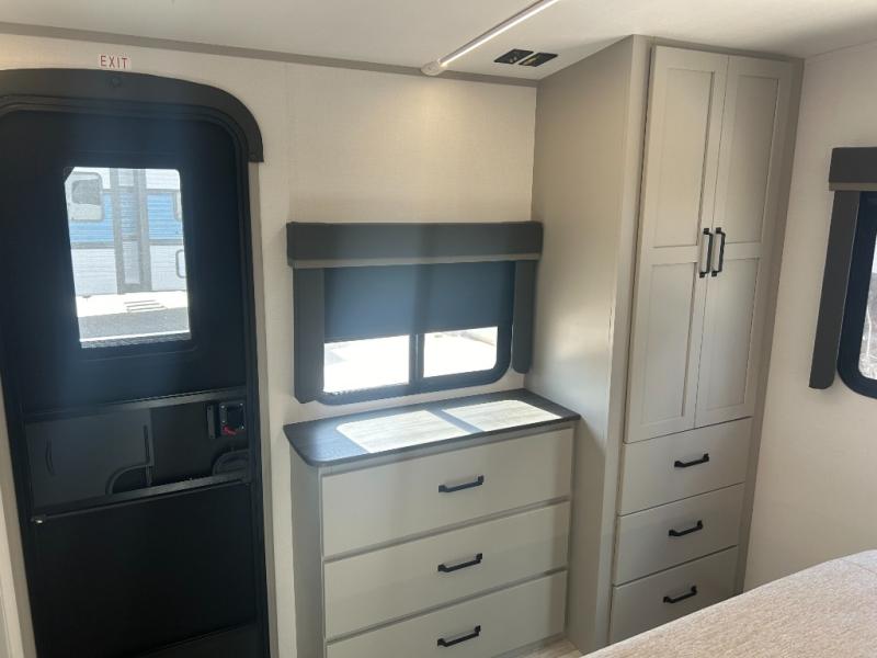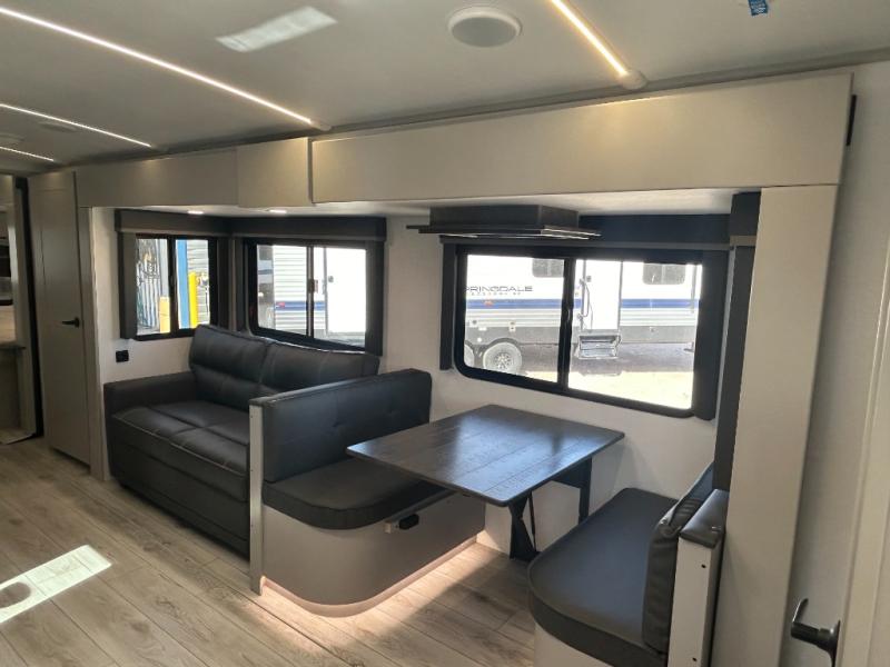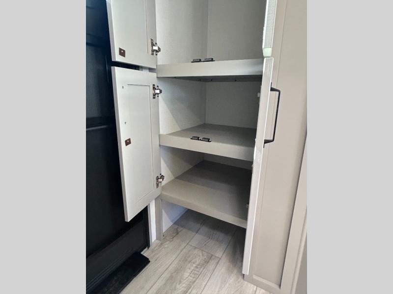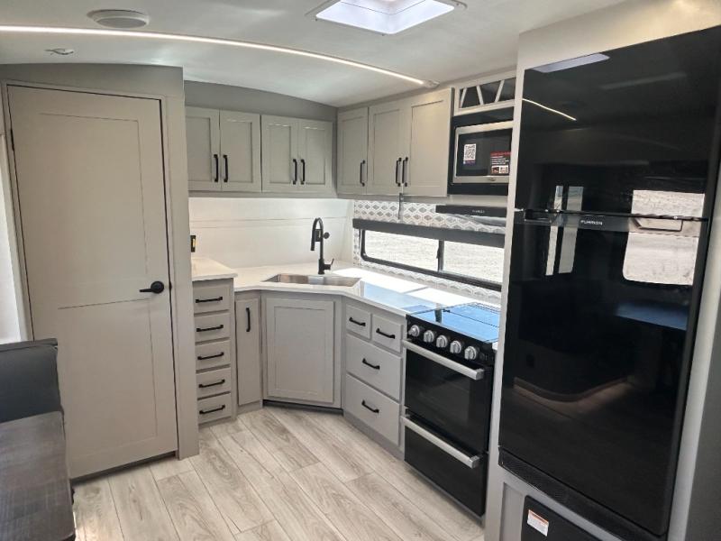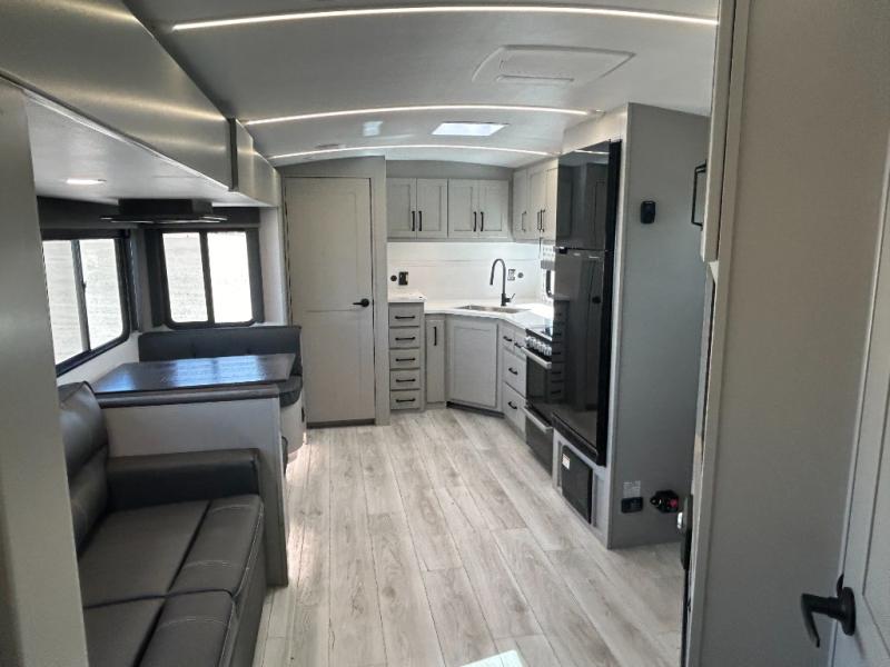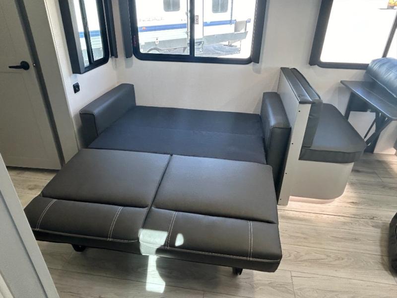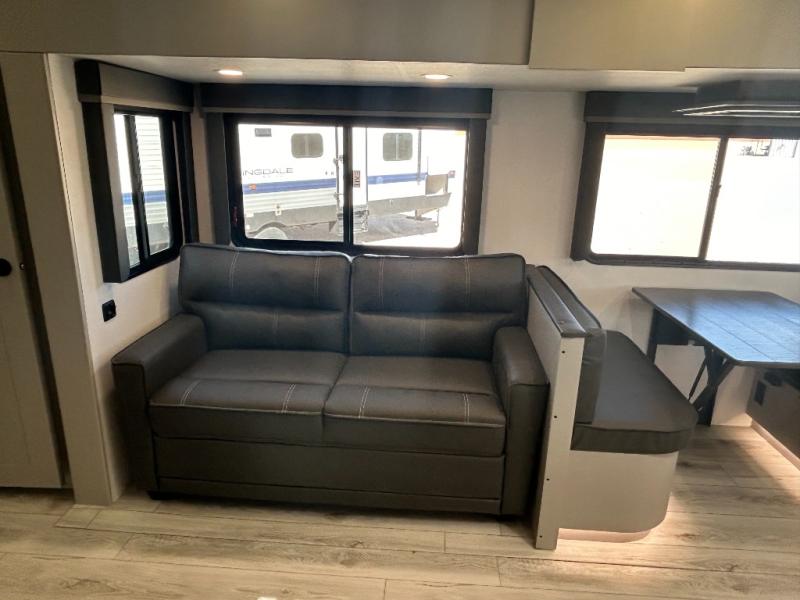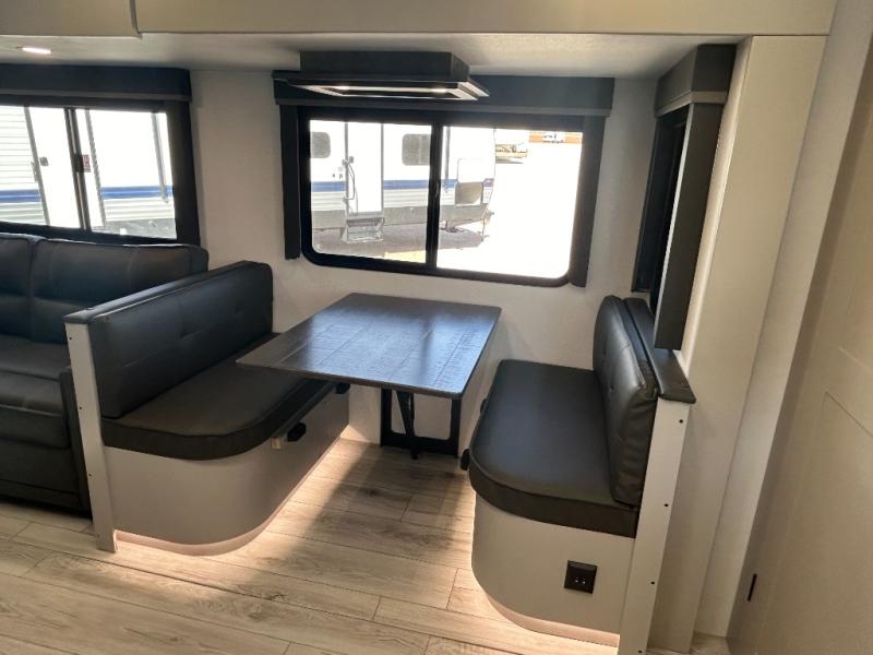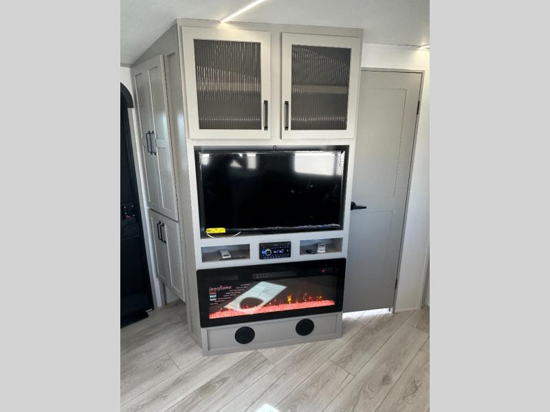 Come see all that this travel trailer has to offer! You will get a good night's rest each night on the 72" x 75" king bed slide, and your furry friend can sleep in there too with the built-in pet kennel storage underneath. There is even one of the dual entry doors to the unit, and an entrance into the dual entry bathroom which has a 34" radius shower to freshen up in every morning. Head to the front kitchen to brew a cup of coffee at the coffee bar then start frying up some eggs on the three burner cooktop and grab some oatmeal from the walk-in pantry. You can enjoy your meals at the booth dinette and then read the morning newspaper in comfort on the sofa sleeper across from the entertainment center with a 36" fireplace. The sofa sleeper can be switched out for optional theater seating, and the booth dinette can be switched out for the optional table and chairs!