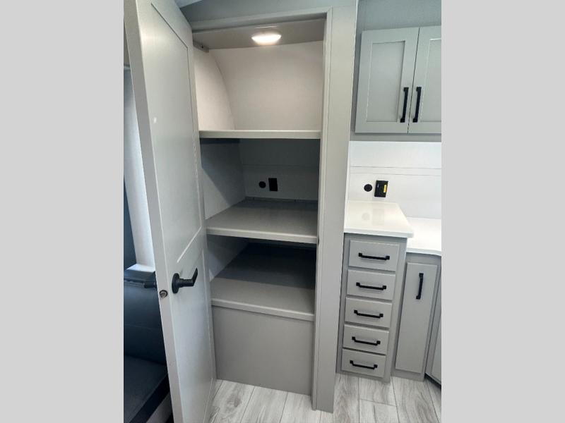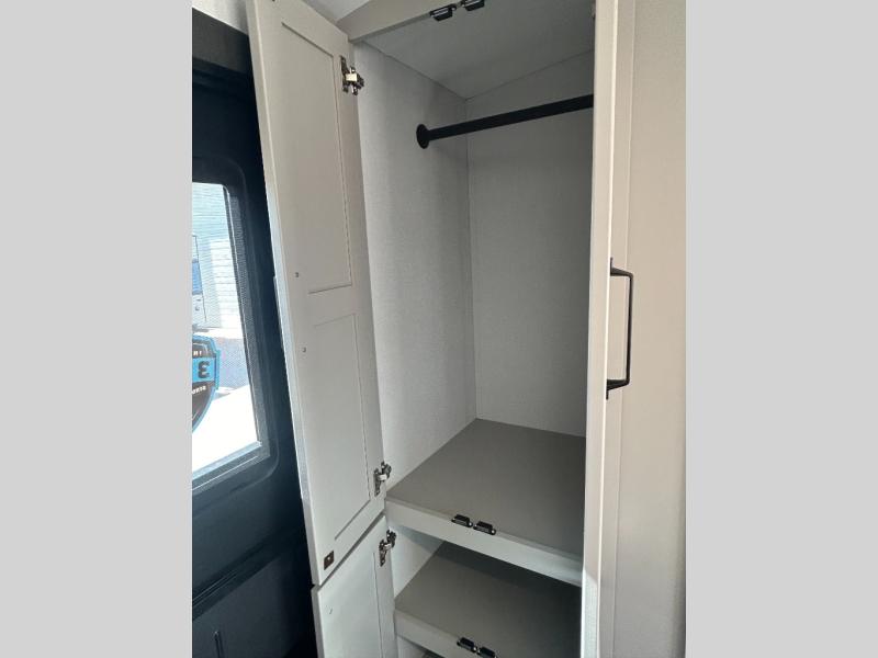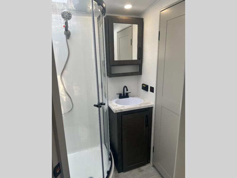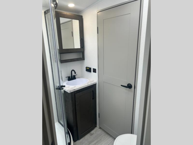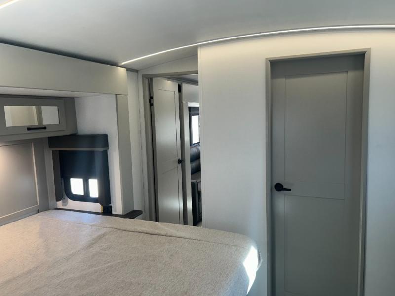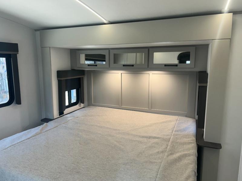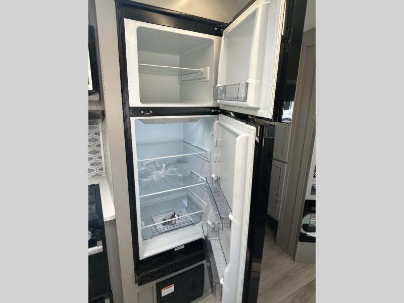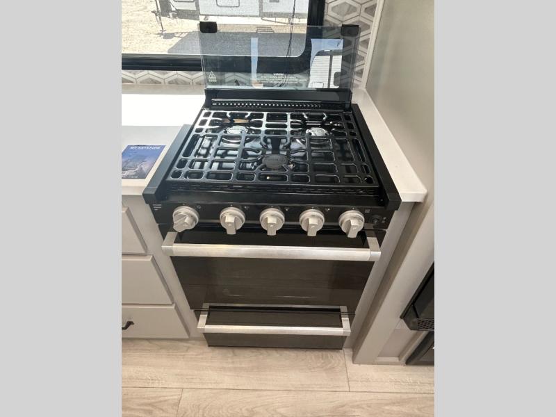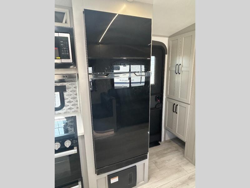 Come see all that this travel trailer has to offer! You will get a good night's rest each night on the 72" x 75" king bed slide, and your furry friend can sleep in there too with the built-in pet kennel storage underneath. There is even one of the dual entry doors to the unit, and an entrance into the dual entry bathroom which has a 34" radius shower to freshen up in every morning. Head to the front kitchen to brew a cup of coffee at the coffee bar then start frying up some eggs on the three burner cooktop and grab some oatmeal from the walk-in pantry. You can enjoy your meals at the booth dinette and then read the morning newspaper in comfort on the sofa sleeper across from the entertainment center with a 36" fireplace. The sofa sleeper can be switched out for optional theater seating, and the booth dinette can be switched out for the optional table and chairs!