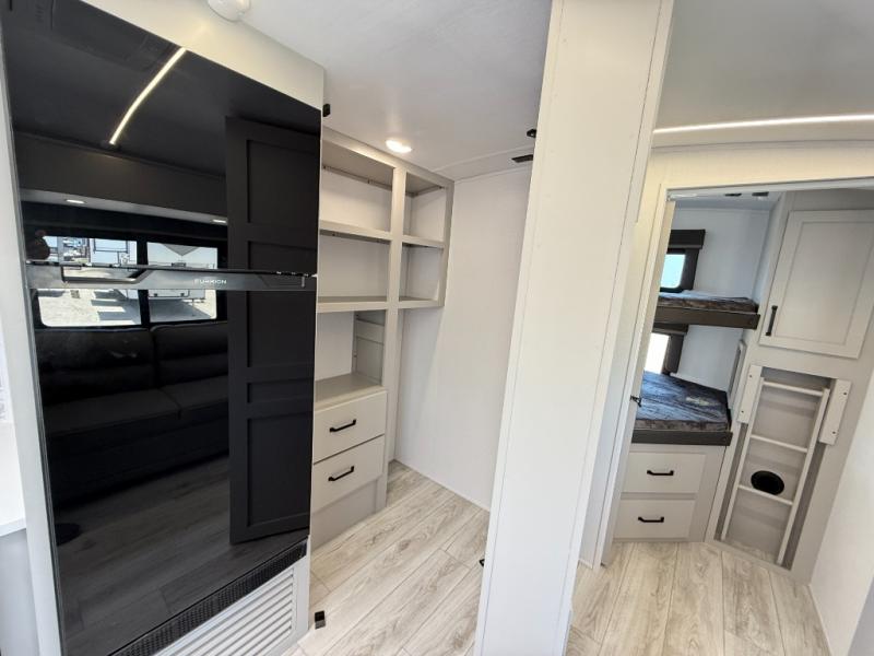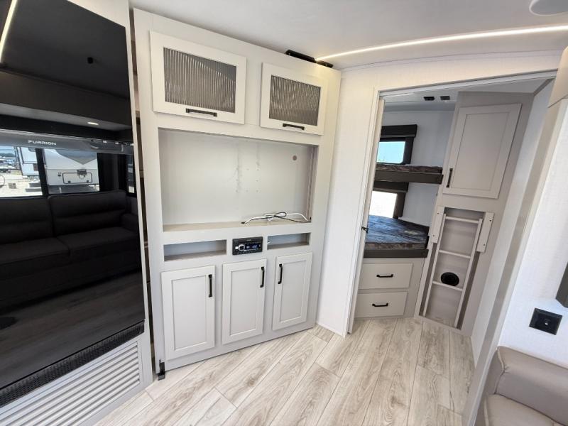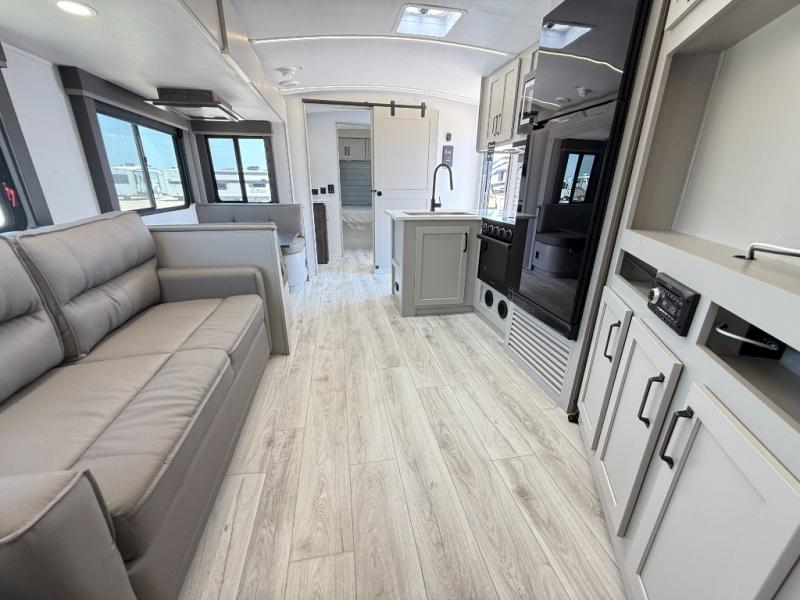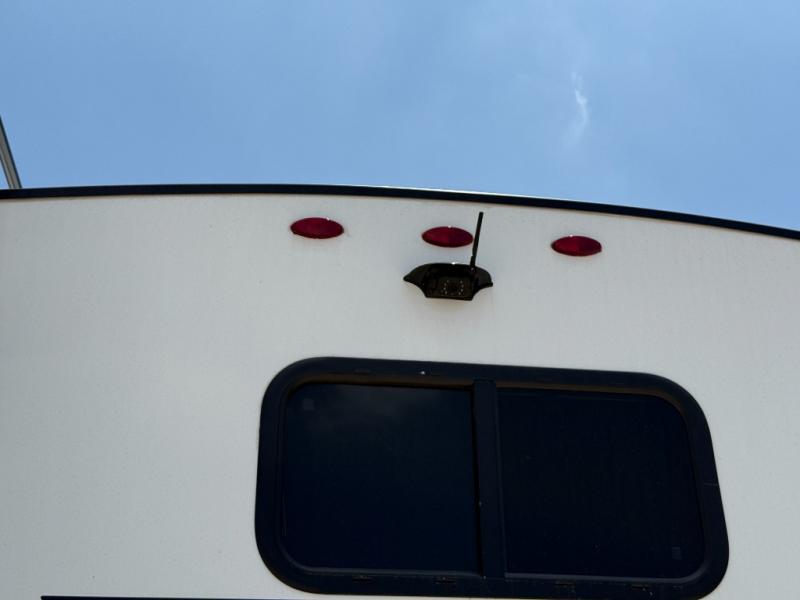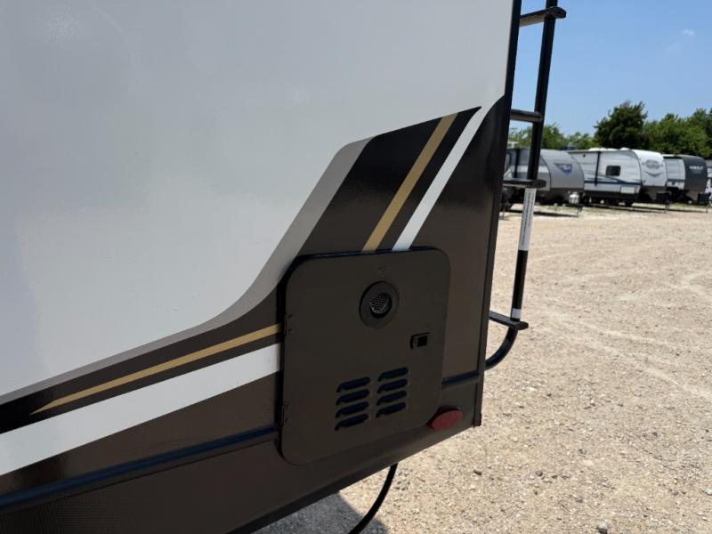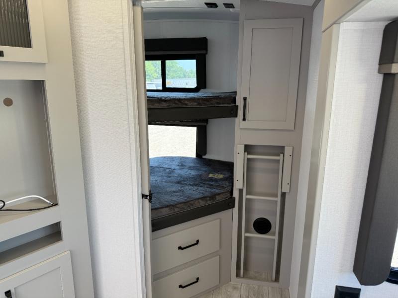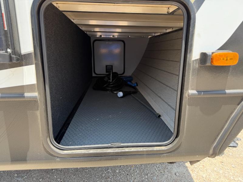 Get out and explore, hike, and camp in comfort! This trailer offers a private bunkhouse with double-size bunks and a wardrobe, a private front bedroom with a walk-around queen bed with a built-in pet kennel storage for your family's best friend, a laundry chute to keep everything tidy, and dual wardrobes for your clothing. You can access the walk-through bathroom from the bedroom and the main living and kitchen area through barn slider doors. Your guests can sleep on the sofa sleeper and booth dinette slide out while watching the 40" TV within the entertainment center after grabbing some snacks from the hidden pantry. There are full kitchen amenities inside, plus there is an outside kitchen to use, a 21' awning offers protection from the elements, and a pass-through storage to carry your larger gear like fishing poles, an outdoor table, and camping chairs.