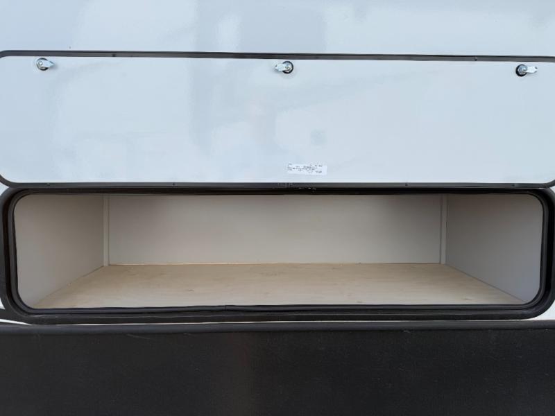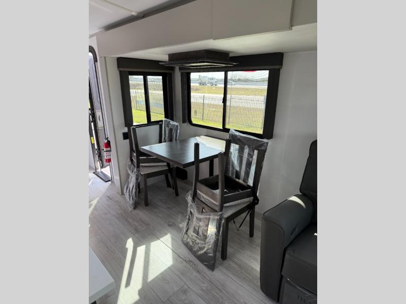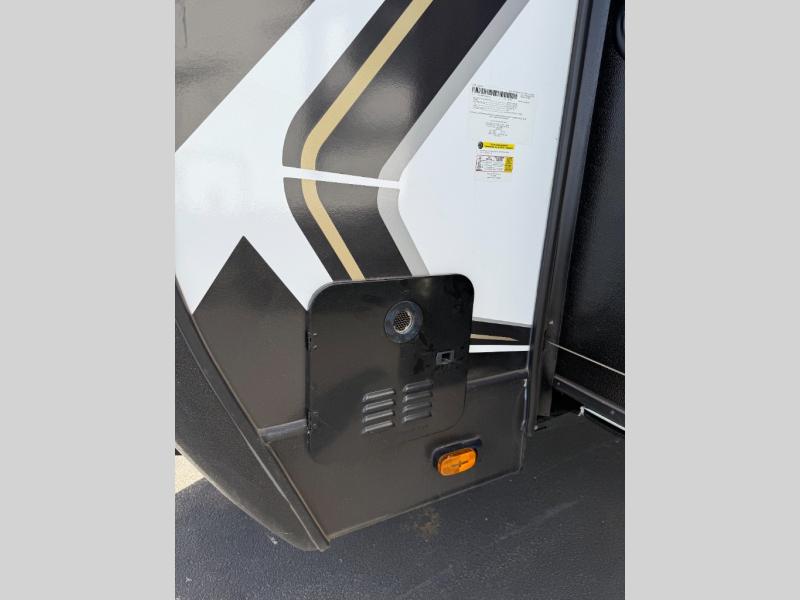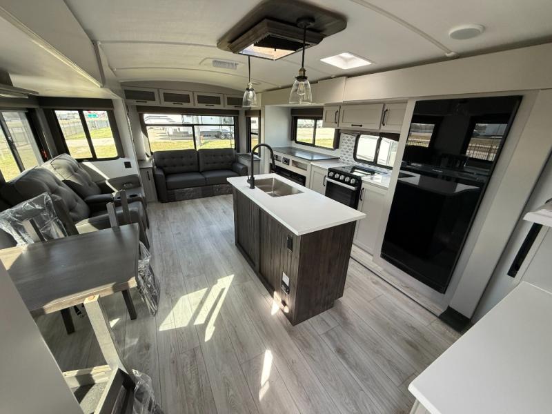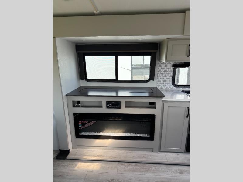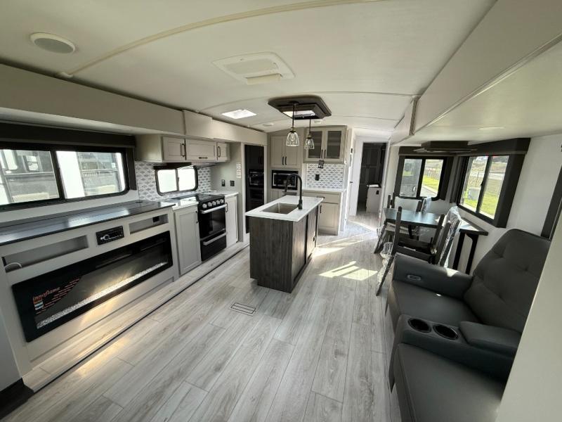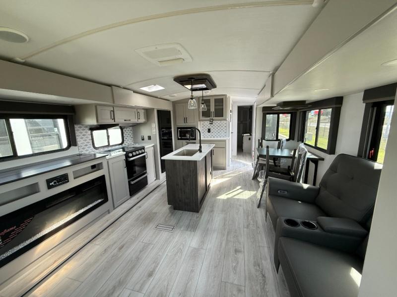 Whether you camp for inside comforts or outside adventures, this trailer will provide the comfort once you step inside. The rear living area has a sofa sleeper for guests, three slides throughout for maximum floor space, and a 10 cu. ft. 12V GE refrigerator. There is a 50" HDTV and fireplace to enjoy, theater seats, and a booth dinette, or you can choose a table and chairs option in its place. The full bathroom will let you freshen up each night, and the bedroom offers a king bed, front wardrobe, washer/dryer prep, and more storage.