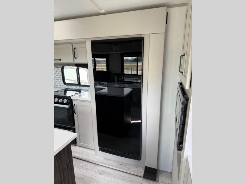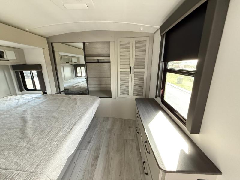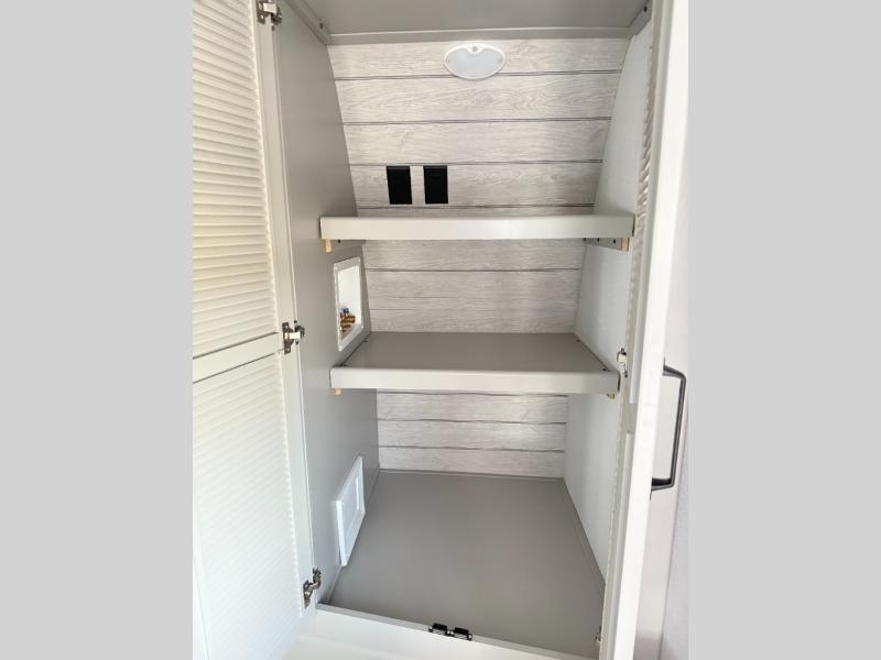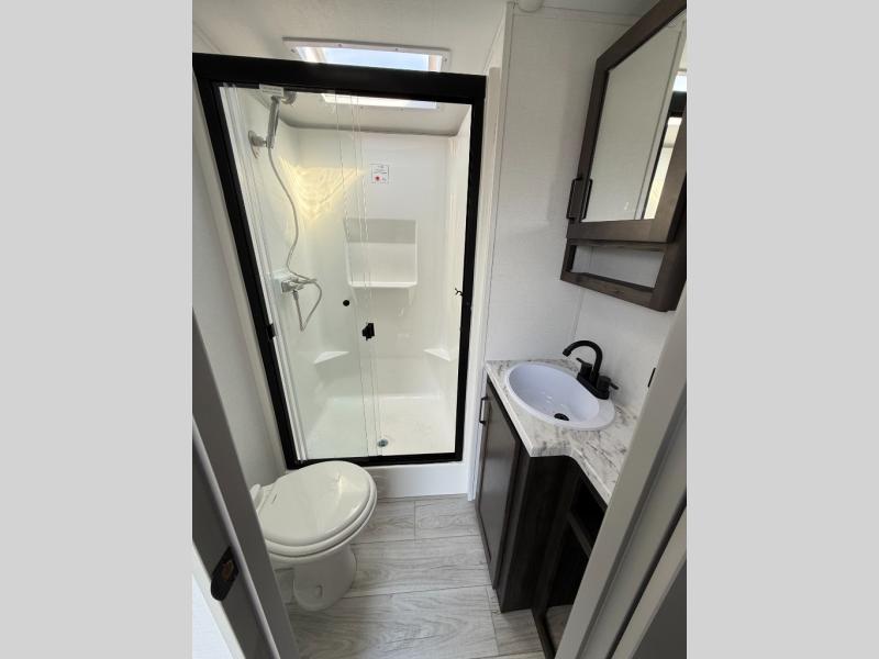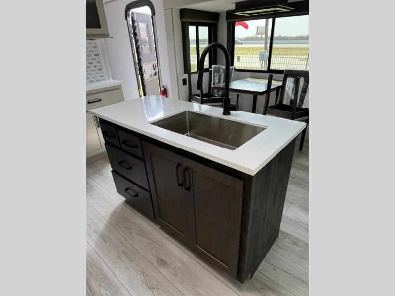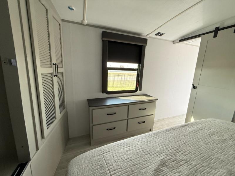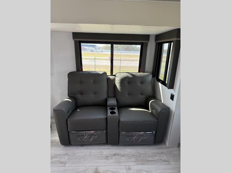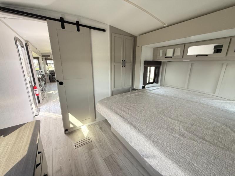 Whether you camp for inside comforts or outside adventures, this trailer will provide the comfort once you step inside. The rear living area has a sofa sleeper for guests, three slides throughout for maximum floor space, and a 10 cu. ft. 12V GE refrigerator. There is a 50" HDTV and fireplace to enjoy, theater seats, and a booth dinette, or you can choose a table and chairs option in its place. The full bathroom will let you freshen up each night, and the bedroom offers a king bed, front wardrobe, washer/dryer prep, and more storage.