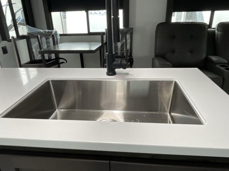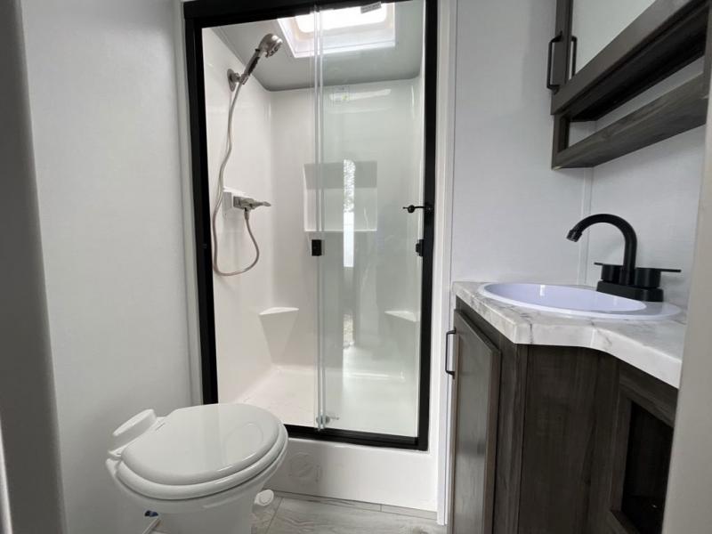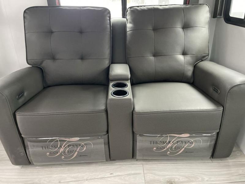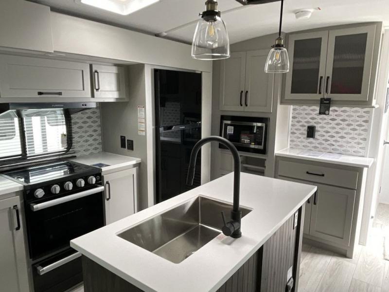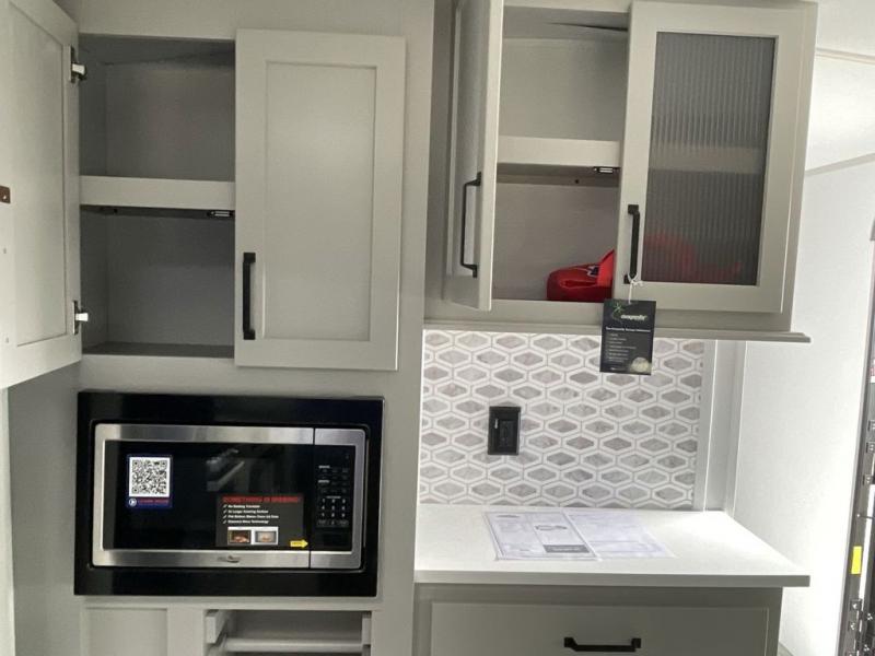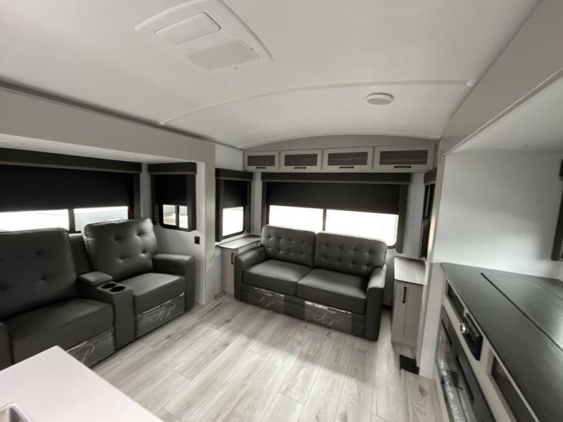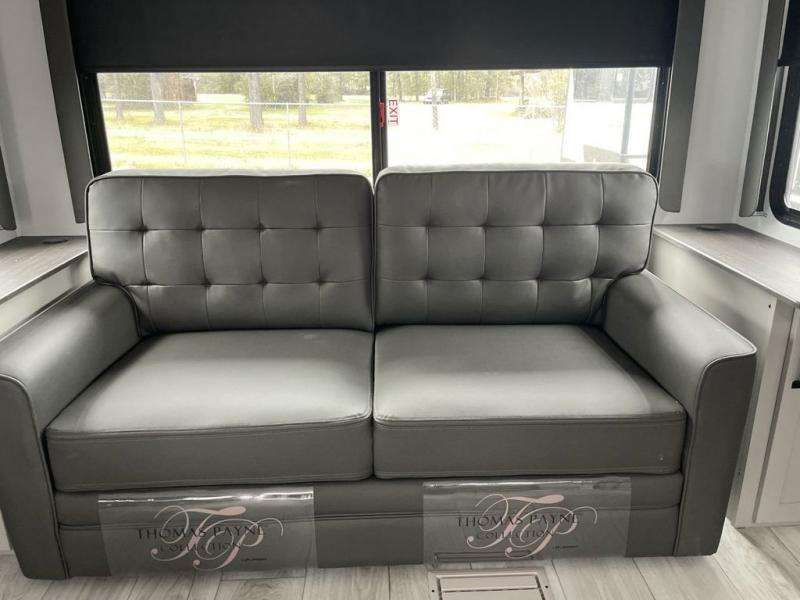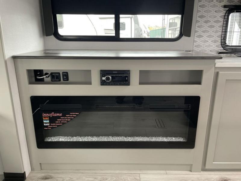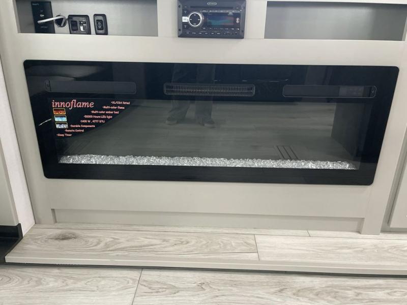 Whether you camp for inside comforts or outside adventures, this trailer will provide the comfort once you step inside. The rear living area has a sofa sleeper for guests, three slides throughout for maximum floor space, and a 10 cu. ft. 12V GE refrigerator. There is a 50" HDTV and fireplace to enjoy, theater seats, and a booth dinette, or you can choose a table and chairs option in its place. The full bathroom will let you freshen up each night, and the bedroom offers a king bed, front wardrobe, washer/dryer prep, and more storage.