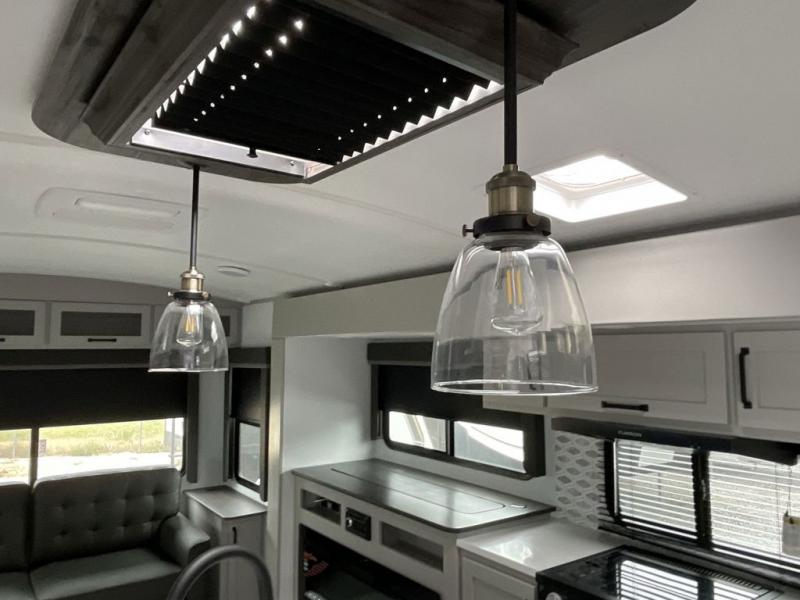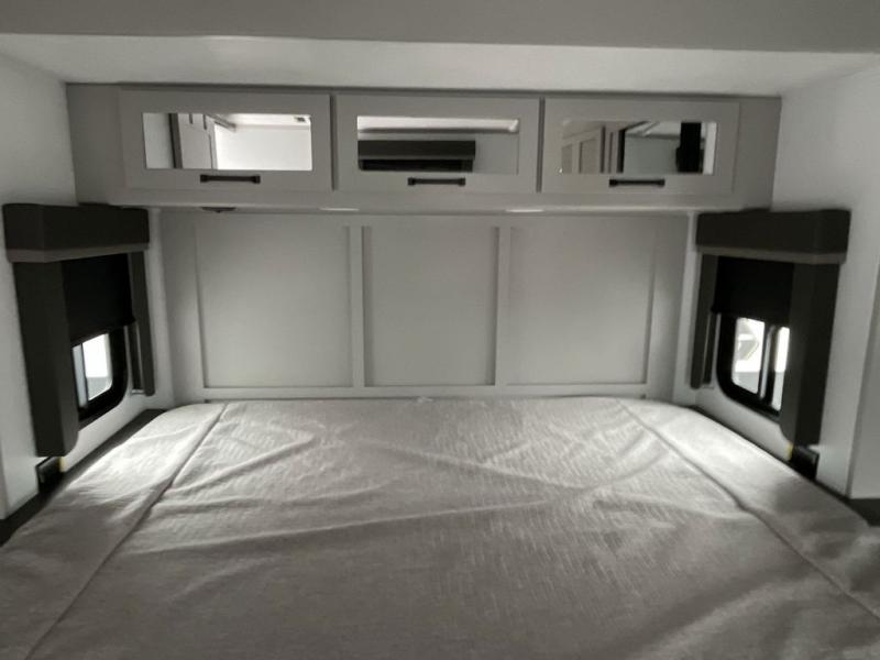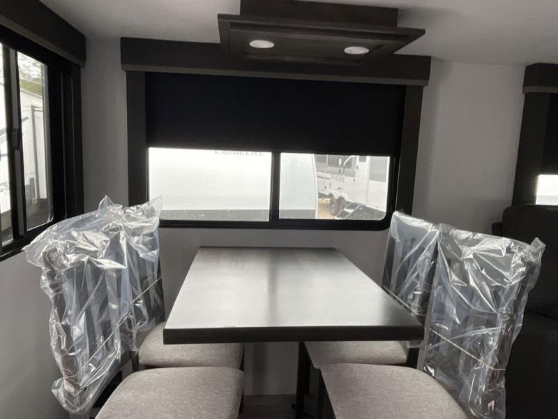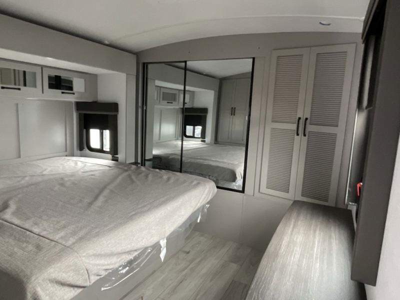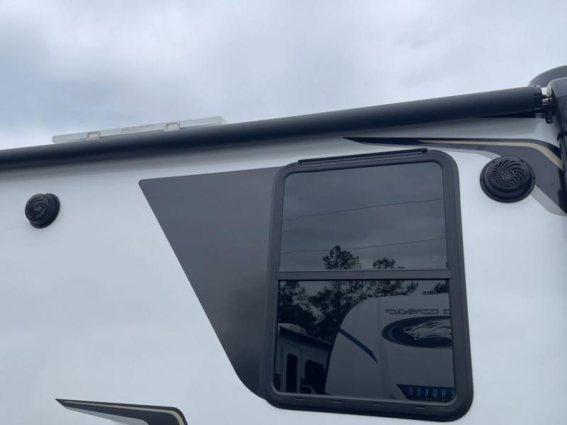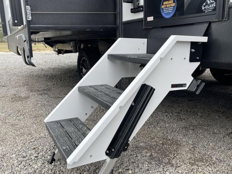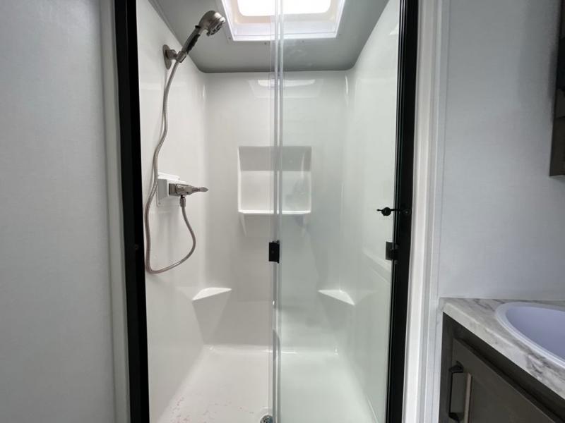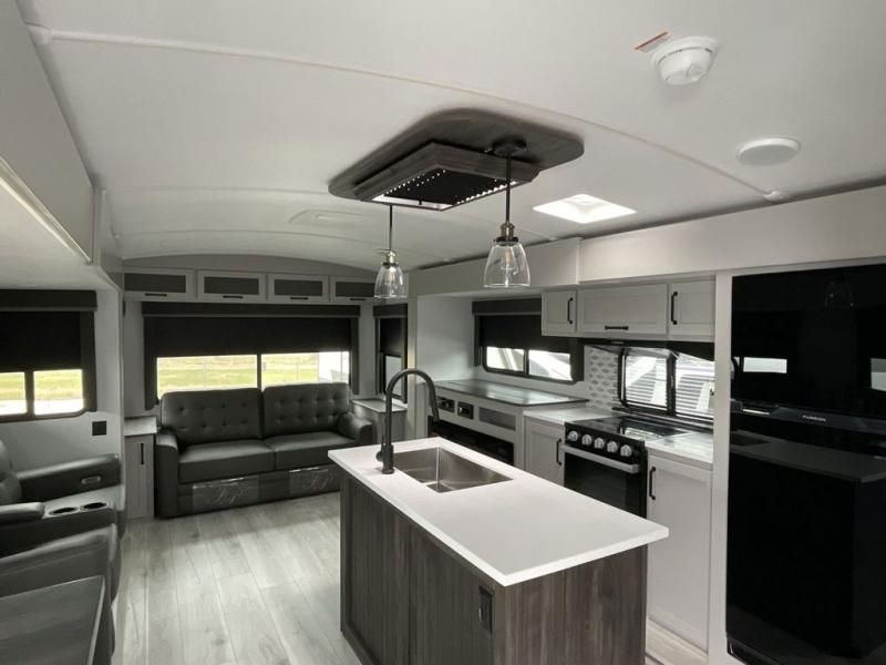 Whether you camp for inside comforts or outside adventures, this trailer will provide the comfort once you step inside. The rear living area has a sofa sleeper for guests, three slides throughout for maximum floor space, and a 10 cu. ft. 12V GE refrigerator. There is a 50" HDTV and fireplace to enjoy, theater seats, and a booth dinette, or you can choose a table and chairs option in its place. The full bathroom will let you freshen up each night, and the bedroom offers a king bed, front wardrobe, washer/dryer prep, and more storage.