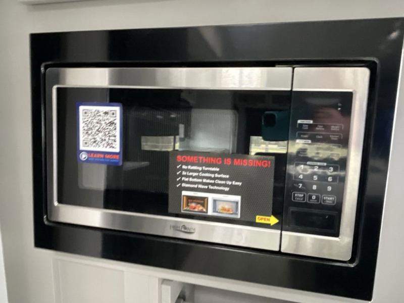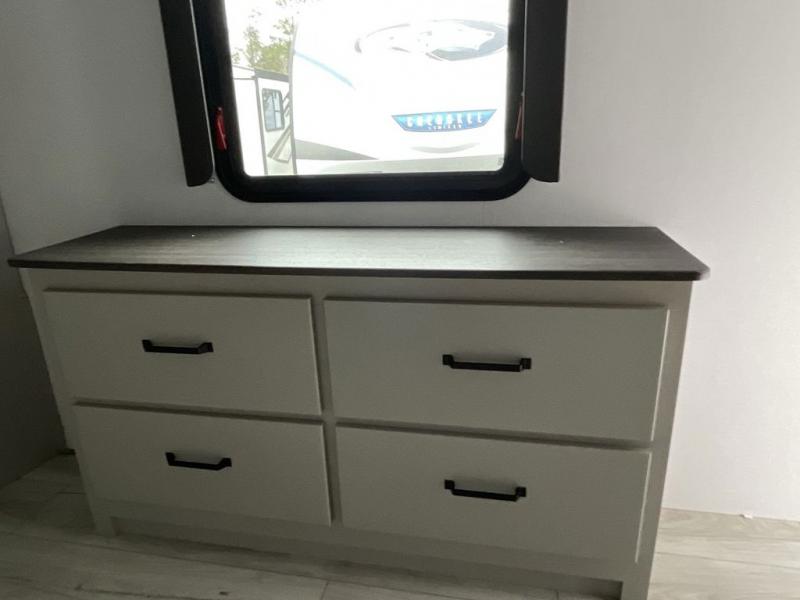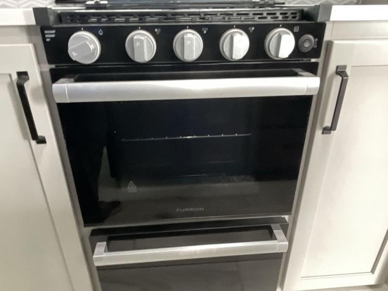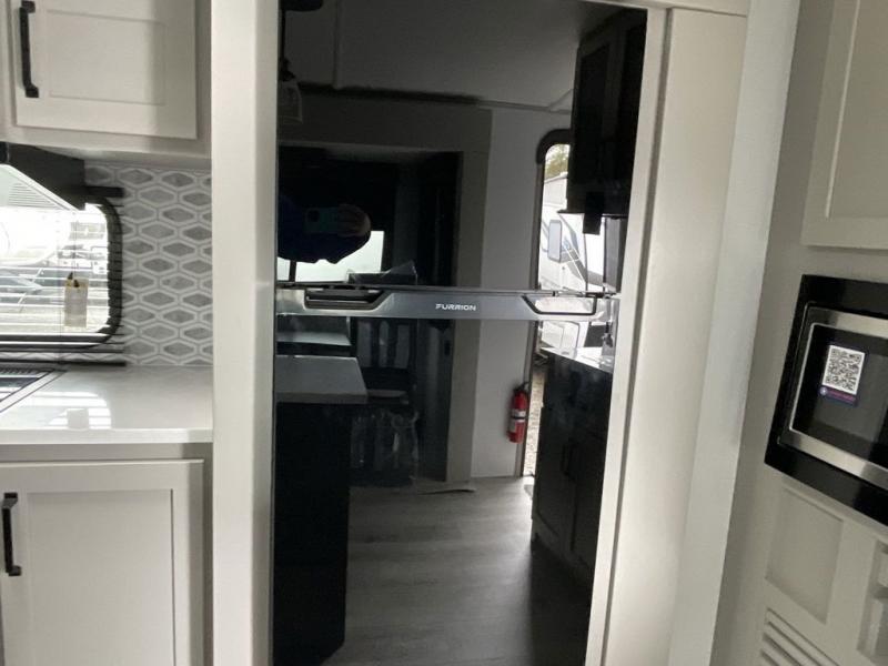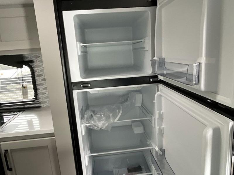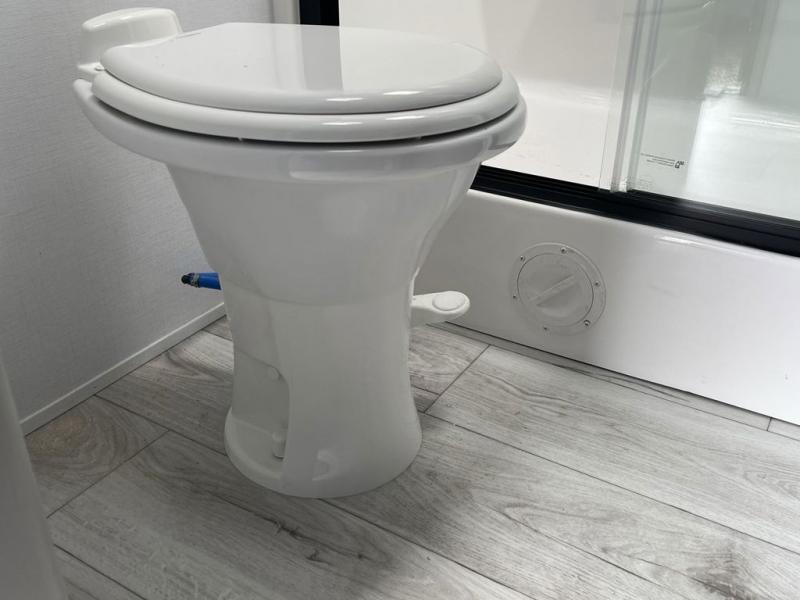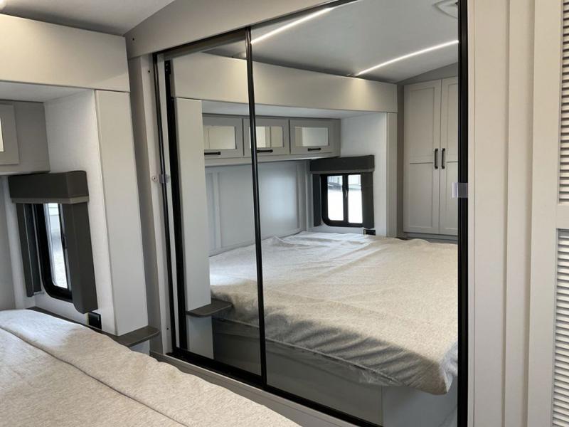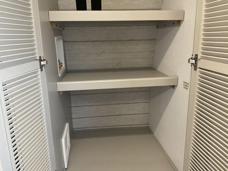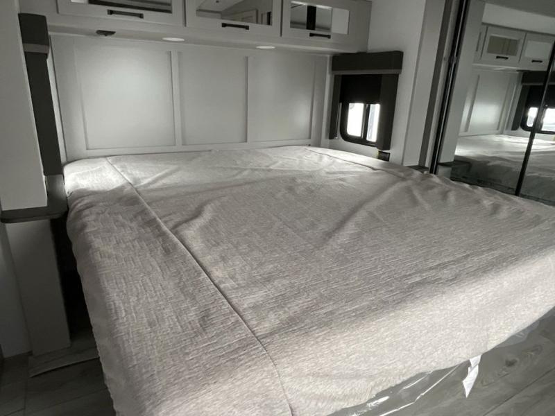 Whether you camp for inside comforts or outside adventures, this trailer will provide the comfort once you step inside. The rear living area has a sofa sleeper for guests, three slides throughout for maximum floor space, and a 10 cu. ft. 12V GE refrigerator. There is a 50" HDTV and fireplace to enjoy, theater seats, and a booth dinette, or you can choose a table and chairs option in its place. The full bathroom will let you freshen up each night, and the bedroom offers a king bed, front wardrobe, washer/dryer prep, and more storage.