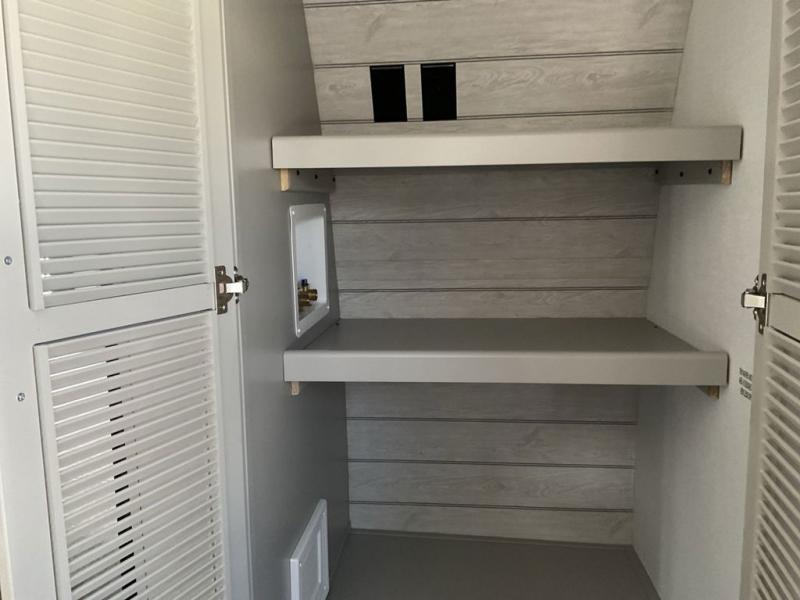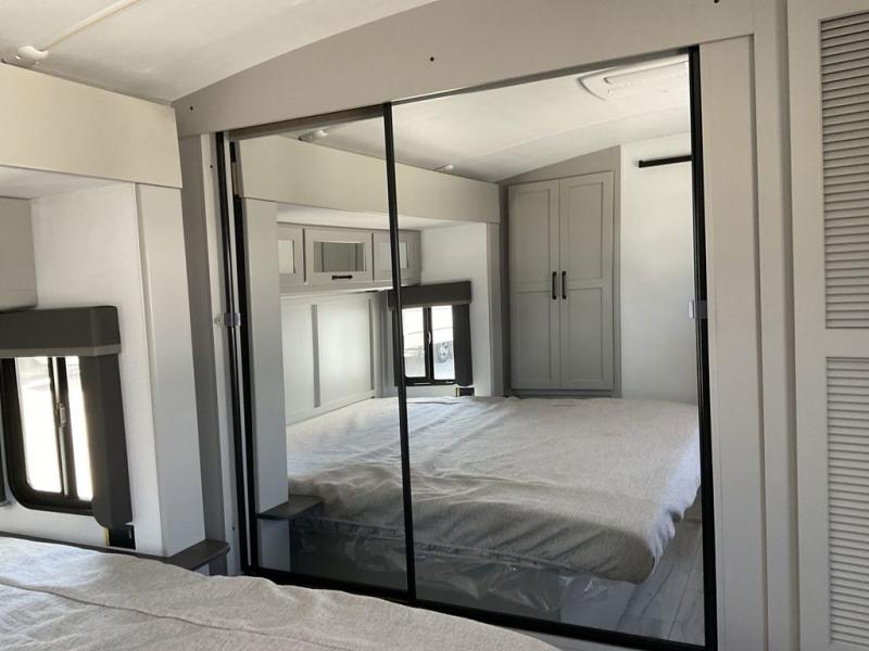 Whether you camp for inside comforts or outside adventures, this trailer will provide the comfort once you step inside. The rear living area has a sofa sleeper for guests, three slides throughout for maximum floor space, and a 10 cu. ft. 12V GE refrigerator. There is a 50" HDTV and fireplace to enjoy, theater seats, and a booth dinette, or you can choose a table and chairs option in its place. The full bathroom will let you freshen up each night, and the bedroom offers a king bed, front wardrobe, washer/dryer prep, and more storage.