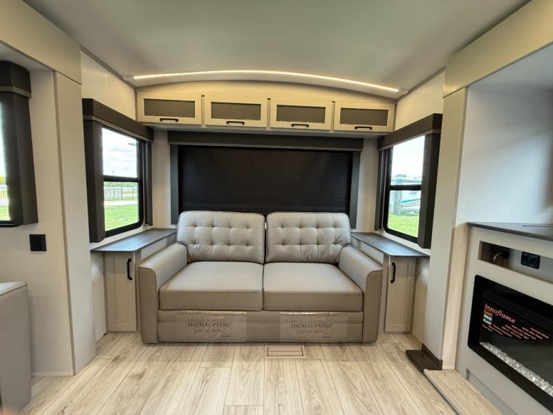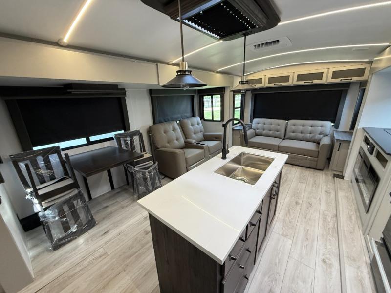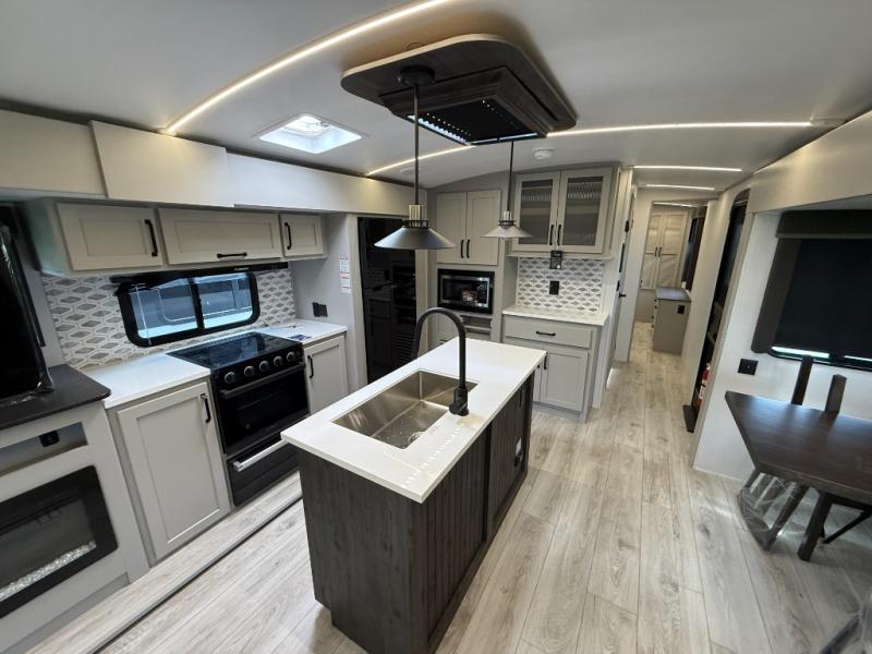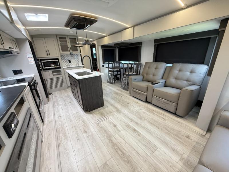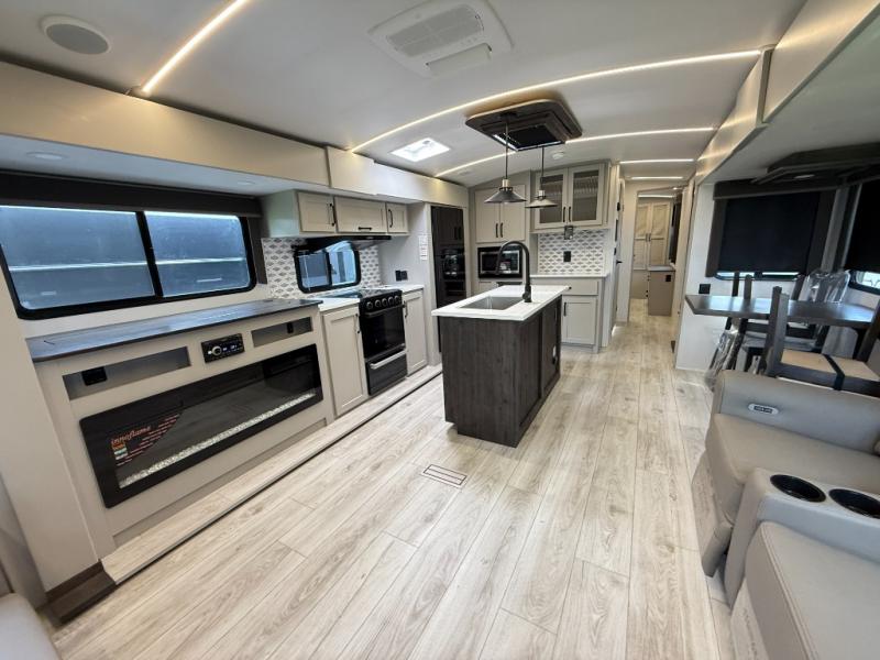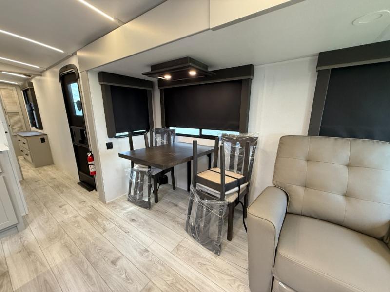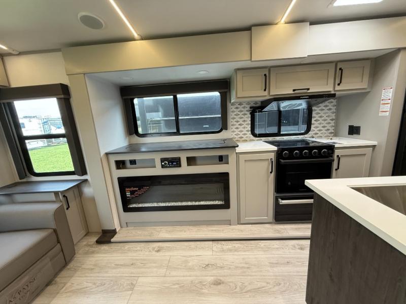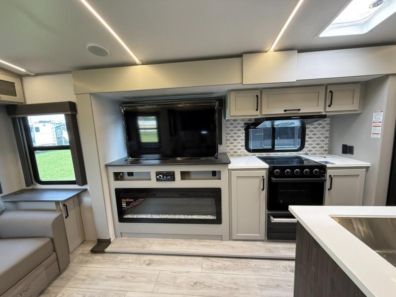 Whether you camp for inside comforts or outside adventures, this trailer will provide the comfort once you step inside. The rear living area has a sofa sleeper for guests, three slides throughout for maximum floor space, and a 10 cu. ft. 12V GE refrigerator. There is a 50" HDTV and fireplace to enjoy, theater seats, and a booth dinette, or you can choose a table and chairs option in its place. The full bathroom will let you freshen up each night, and the bedroom offers a king bed, front wardrobe, washer/dryer prep, and more storage.