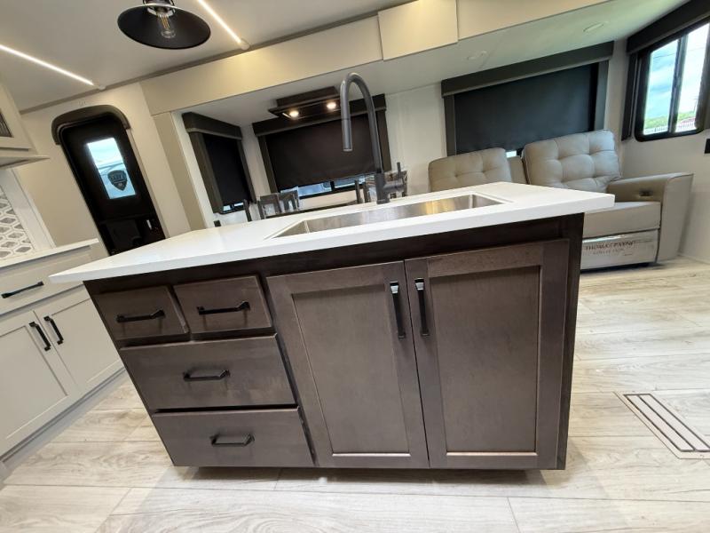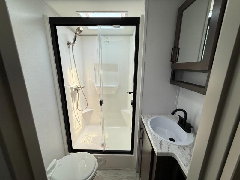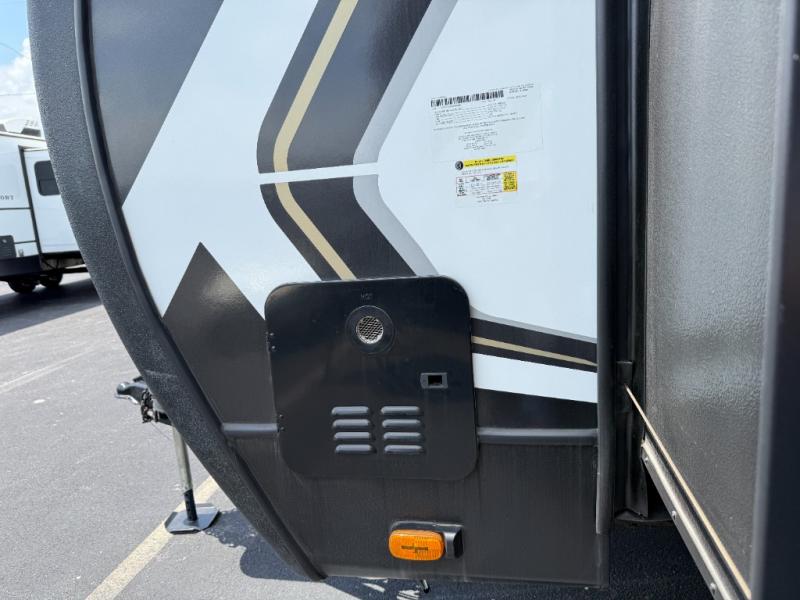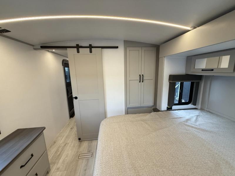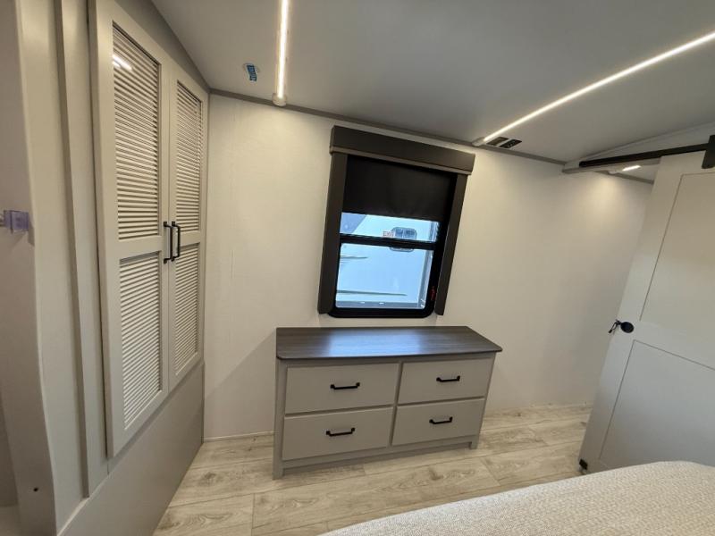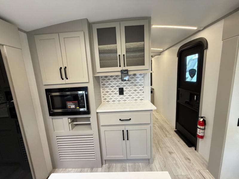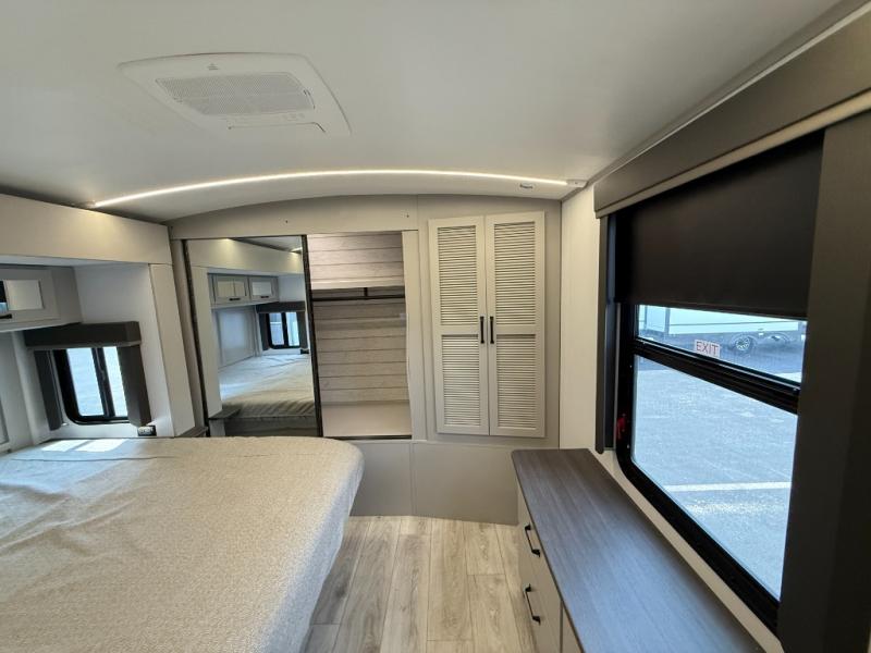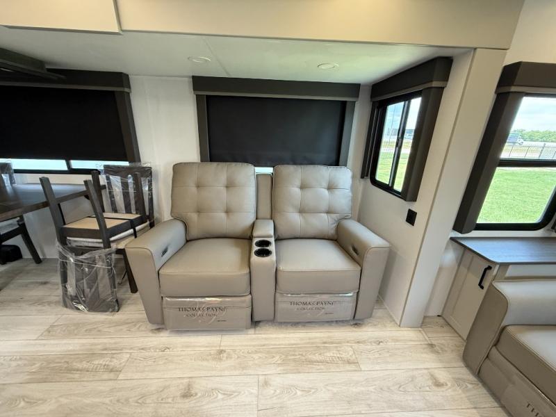 Whether you camp for inside comforts or outside adventures, this trailer will provide the comfort once you step inside. The rear living area has a sofa sleeper for guests, three slides throughout for maximum floor space, and a 10 cu. ft. 12V GE refrigerator. There is a 50" HDTV and fireplace to enjoy, theater seats, and a booth dinette, or you can choose a table and chairs option in its place. The full bathroom will let you freshen up each night, and the bedroom offers a king bed, front wardrobe, washer/dryer prep, and more storage.