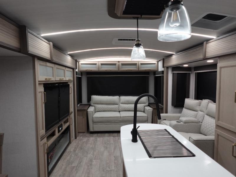 A spacious rear living area is created by two opposing slide outs giving everyone plenty of floor space to move from the sofa sleeper to the double entry bathroom and front private bedroom. You can relax on the theater seats while watching the 50" HDTV with fireplace below, and dine at the dinette. The kitchen island is a great place to wash the veggies and fruit, and prepare meals. The cook will have full amenities including more counter space near the microwave. And there is an outside kitchen with a flip-out stove and more. The slide out king bed gives you more space in the front bedroom, and you will find plenty of storage and a place for your best friend in the built-in pet kennel.