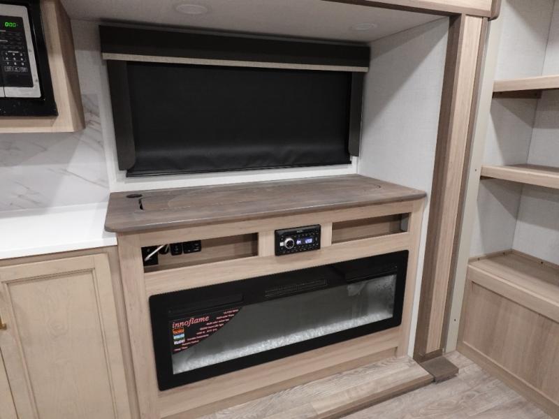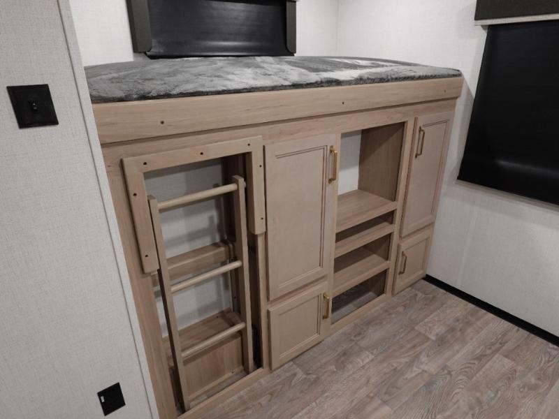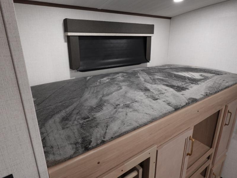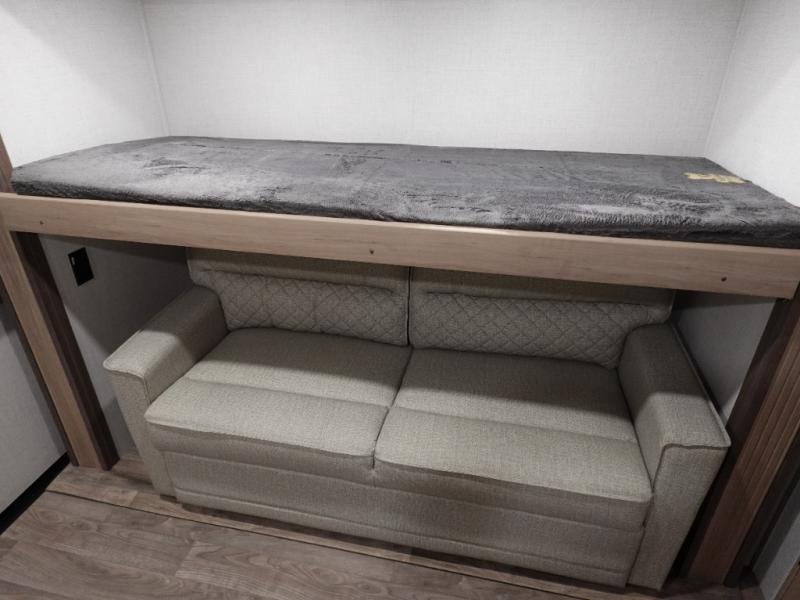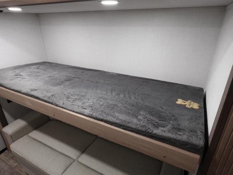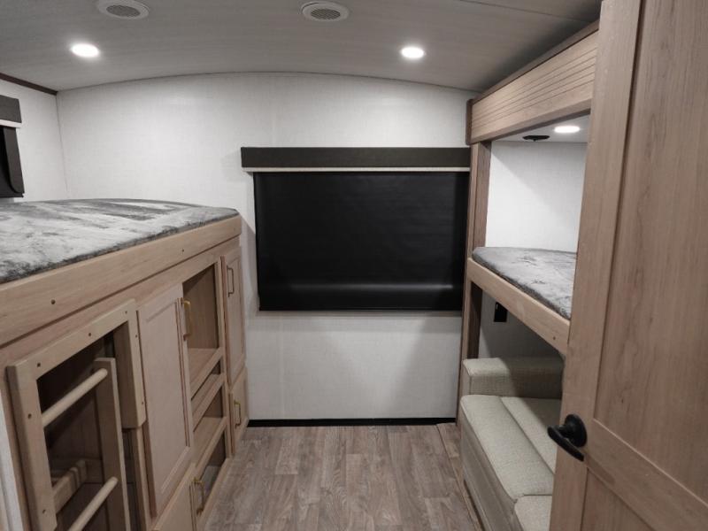 When you enjoy entertaining guests and relaxing both inside and outside at the campgrounds, this trailer has you covered! There is a 20' awning along the exterior, a drop frame pass-through storage to carry larger gear like camping chairs, outdoor tables, fishing poles and such, plus an outside kitchen to make a few meals. The inside is spacious with dual opposing slides in the main living and kitchen area, and the private bunkhouse has a slide out with a sofa sleeper and bunk above. There is a second bunk above an entertainment center that your guests will surely appreciate. You will have a queen bed in the front bedroom, and the full bathroom will keep everyone refreshed. The kitchen has full amenities, plus a kitchen island with a skylight for more natural lighting and booth dinette.