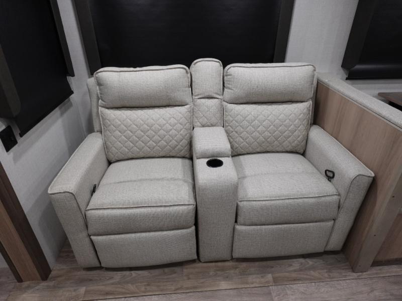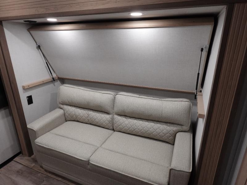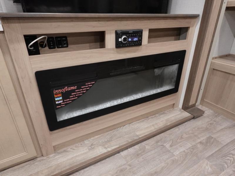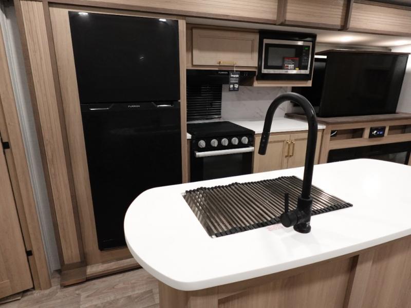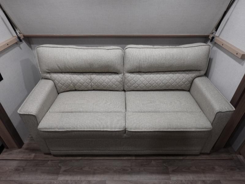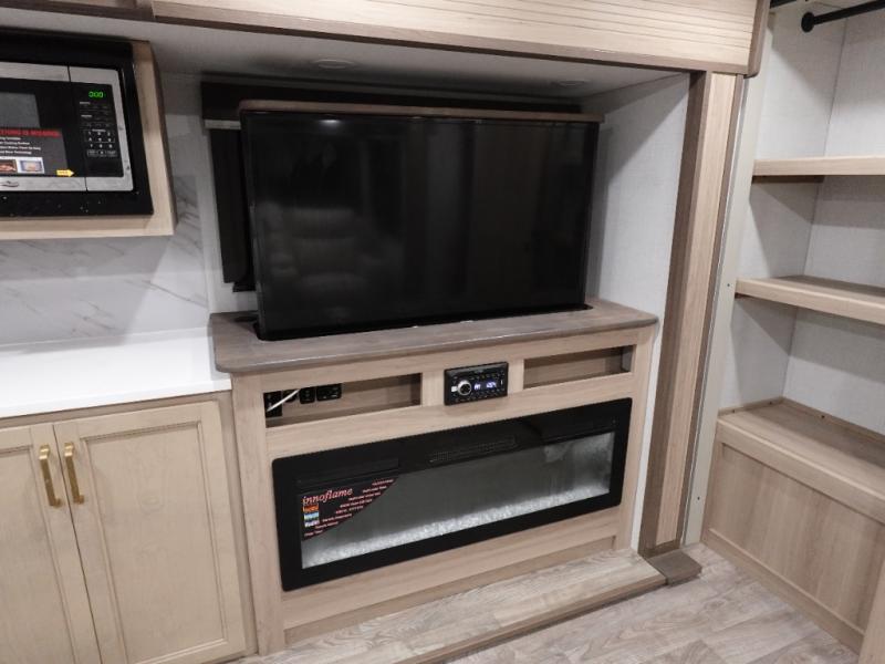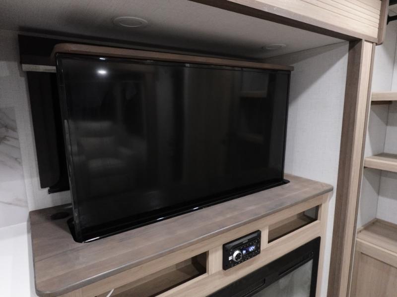 When you enjoy entertaining guests and relaxing both inside and outside at the campgrounds, this trailer has you covered! There is a 20' awning along the exterior, a drop frame pass-through storage to carry larger gear like camping chairs, outdoor tables, fishing poles and such, plus an outside kitchen to make a few meals. The inside is spacious with dual opposing slides in the main living and kitchen area, and the private bunkhouse has a slide out with a sofa sleeper and bunk above. There is a second bunk above an entertainment center that your guests will surely appreciate. You will have a queen bed in the front bedroom, and the full bathroom will keep everyone refreshed. The kitchen has full amenities, plus a kitchen island with a skylight for more natural lighting and booth dinette.