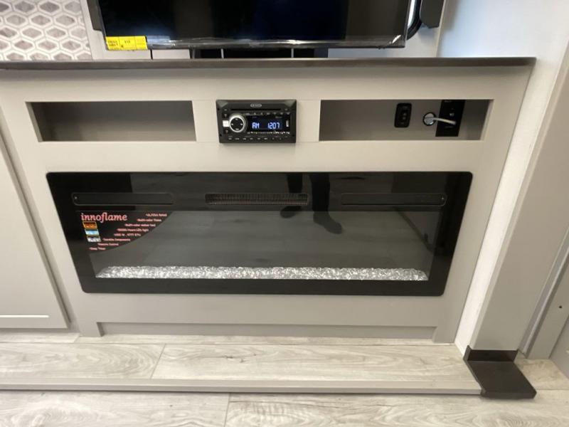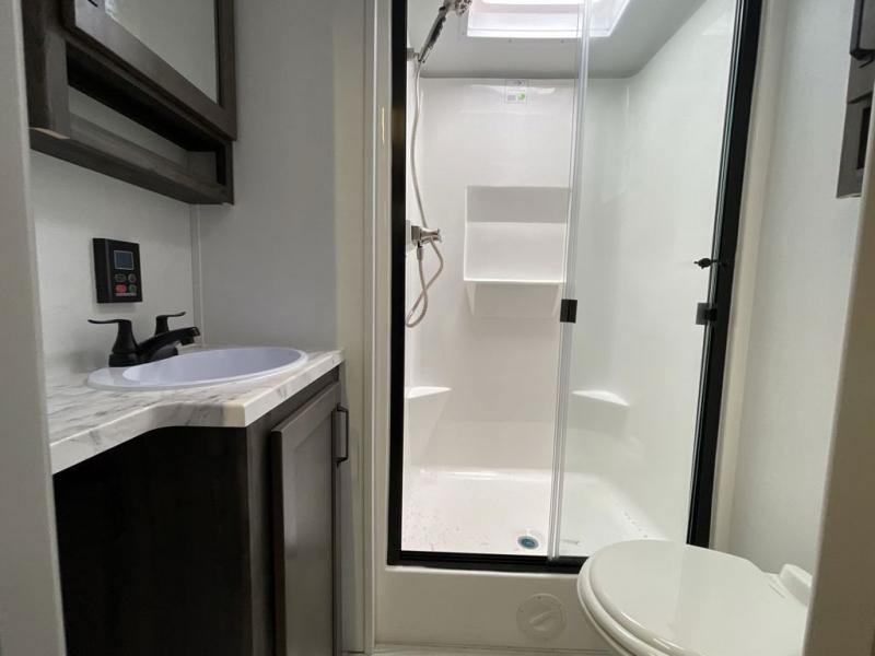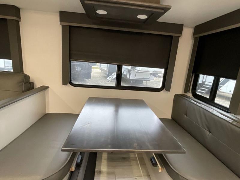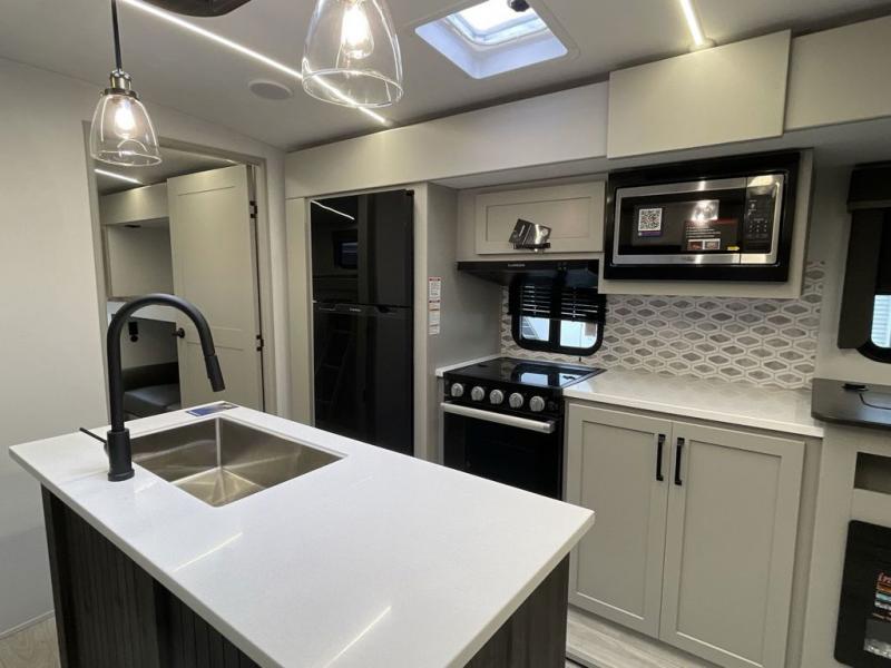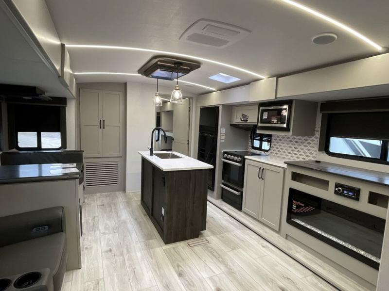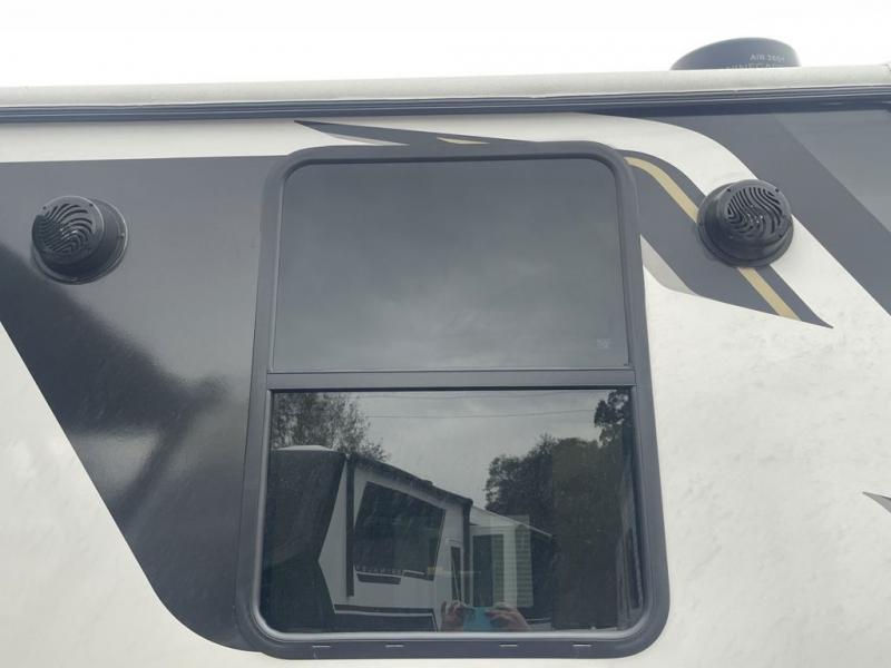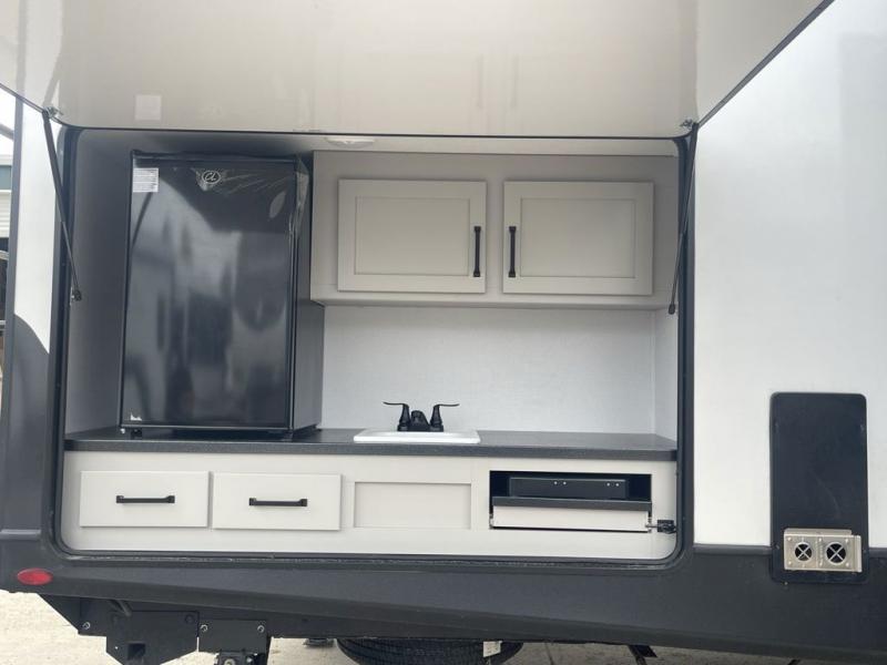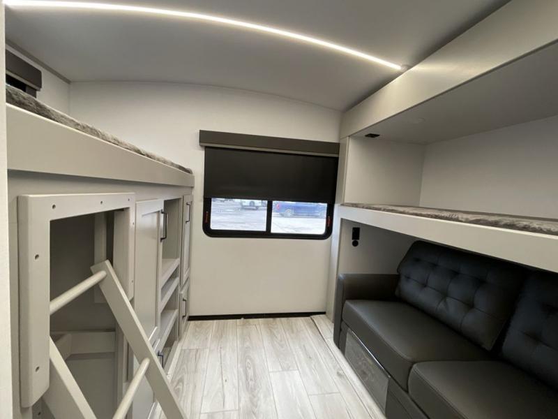 When you enjoy entertaining guests and relaxing both inside and outside at the campgrounds, this trailer has you covered! There is a 20' awning along the exterior, a drop frame pass-through storage to carry larger gear like camping chairs, outdoor tables, fishing poles and such, plus an outside kitchen to make a few meals. The inside is spacious with dual opposing slides in the main living and kitchen area, and the private bunkhouse has a slide out with a sofa sleeper and bunk above. There is a second bunk above an entertainment center that your guests will surely appreciate. You will have a queen bed in the front bedroom, and the full bathroom will keep everyone refreshed. The kitchen has full amenities, plus a kitchen island with a skylight for more natural lighting, a sofa sleeper and booth dinette.