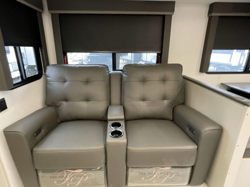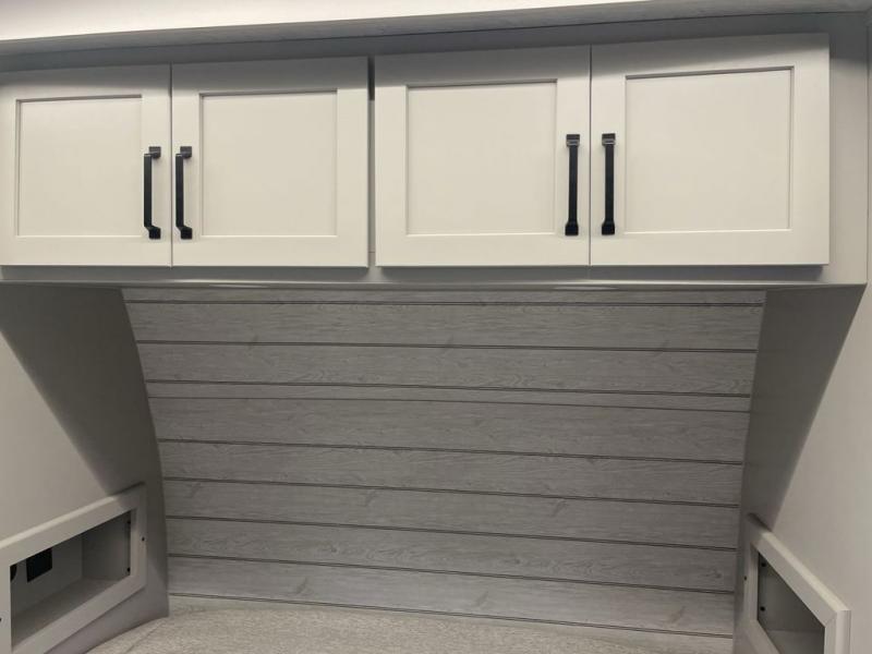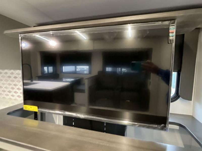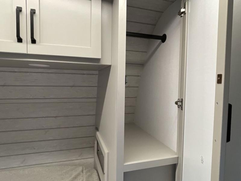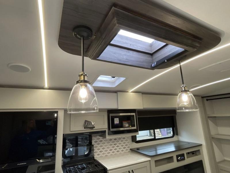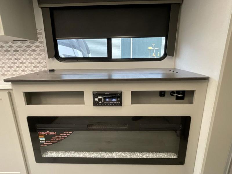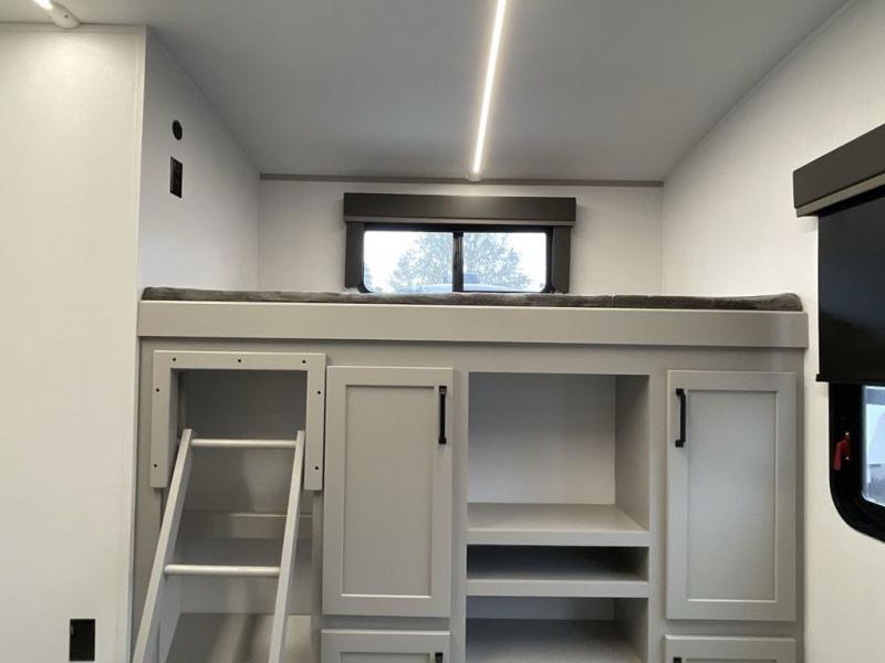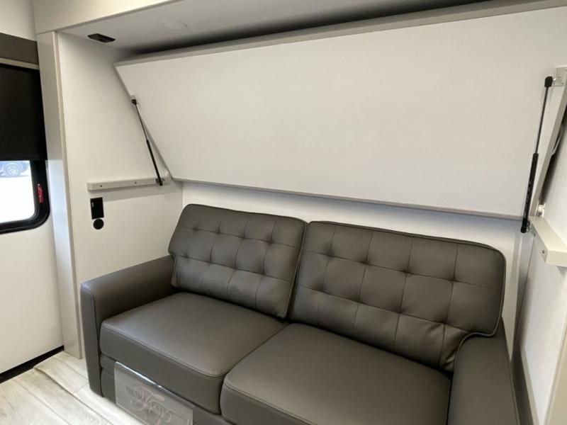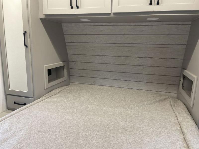 When you enjoy entertaining guests and relaxing both inside and outside at the campgrounds, this trailer has you covered! There is a 20' awning along the exterior, a drop frame pass-through storage to carry larger gear like camping chairs, outdoor tables, fishing poles and such, plus an outside kitchen to make a few meals. The inside is spacious with dual opposing slides in the main living and kitchen area, and the private bunkhouse has a slide out with a sofa sleeper and bunk above. There is a second bunk above an entertainment center that your guests will surely appreciate. You will have a queen bed in the front bedroom, and the full bathroom will keep everyone refreshed. The kitchen has full amenities, plus a kitchen island with a skylight for more natural lighting, a sofa sleeper and booth dinette.