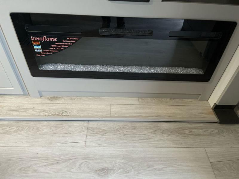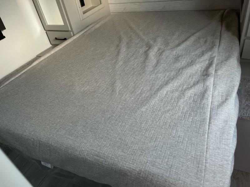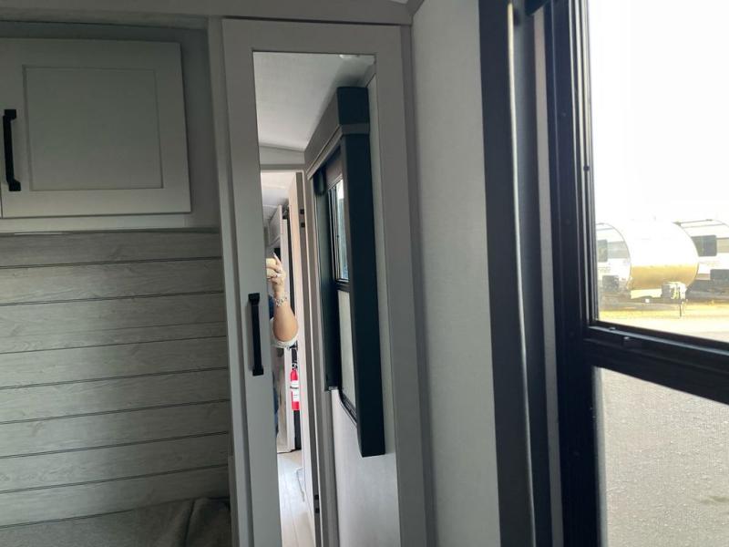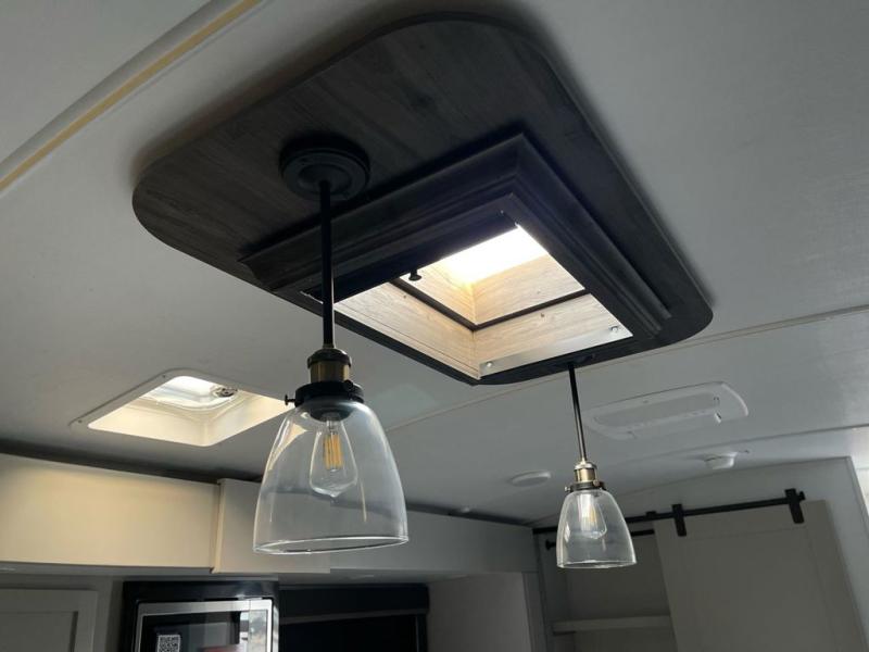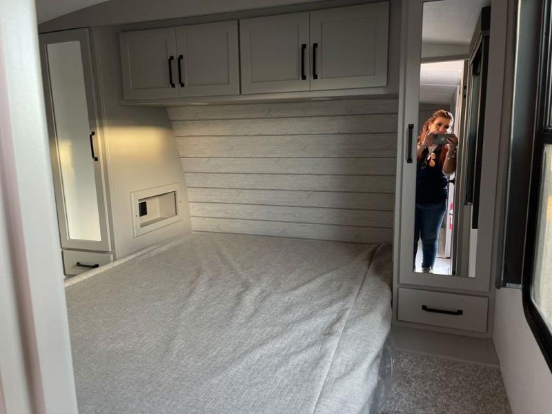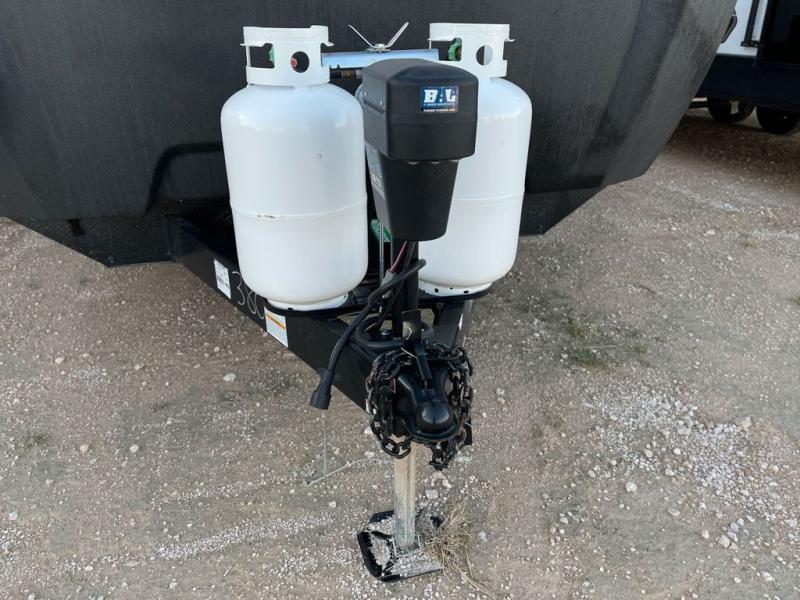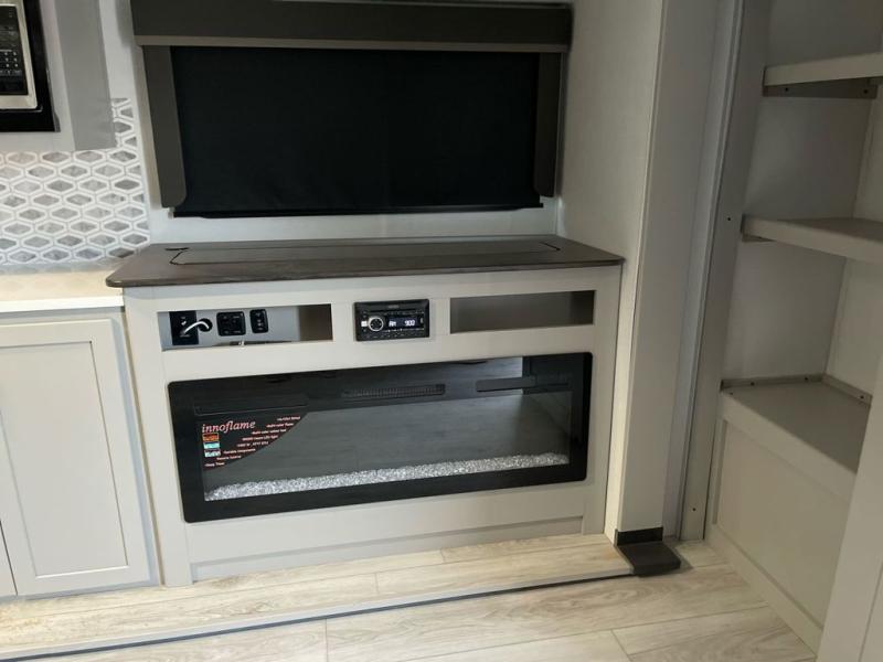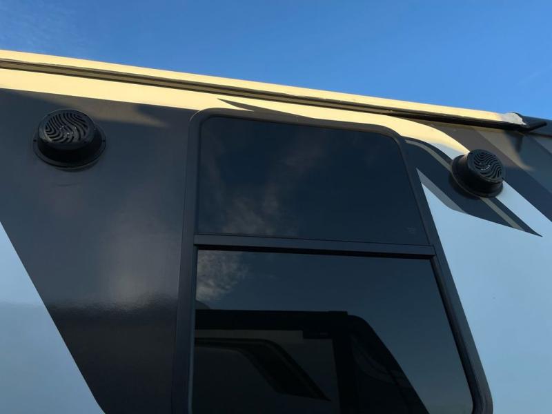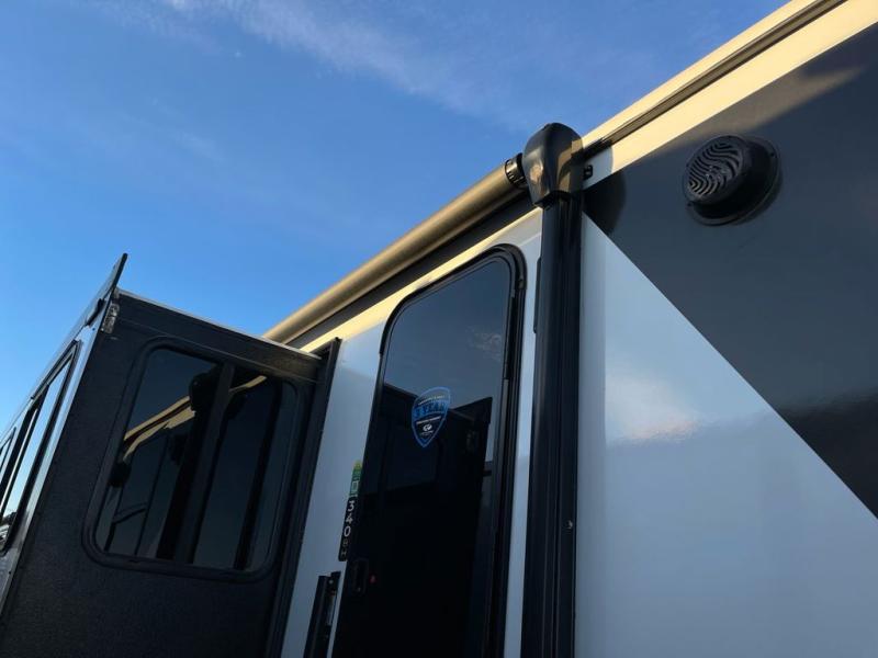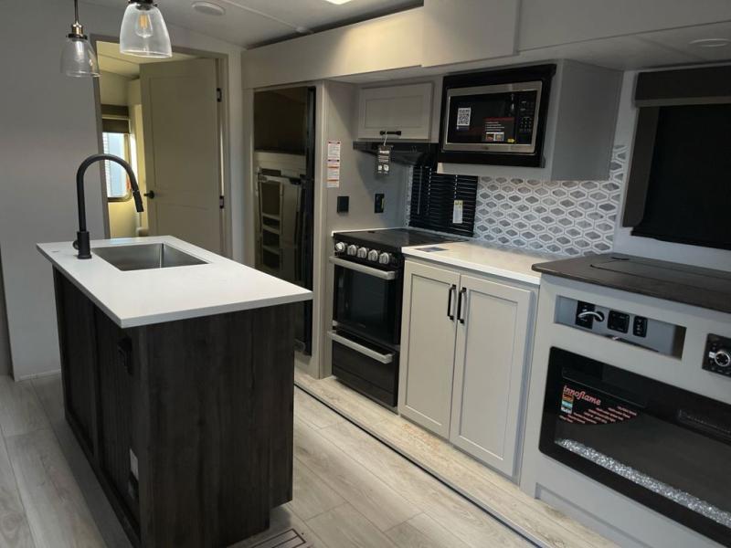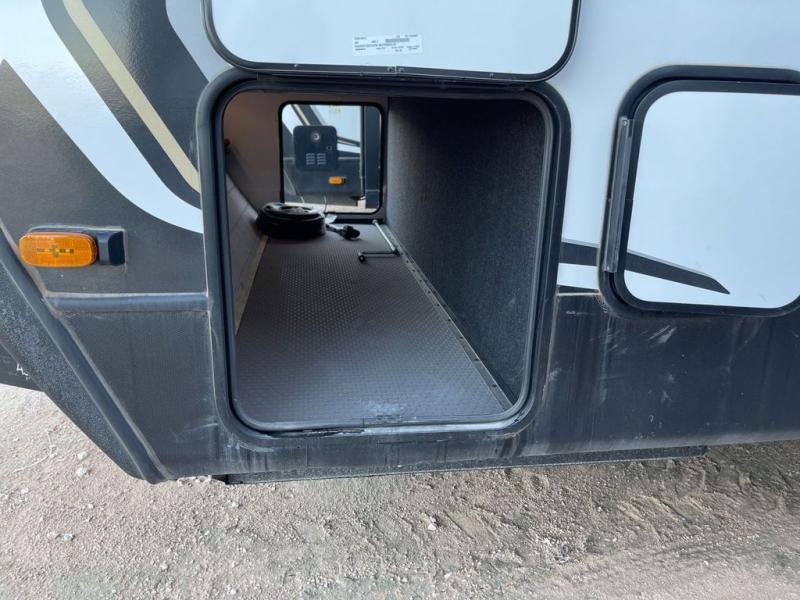 When you enjoy entertaining guests and relaxing both inside and outside at the campgrounds, this trailer has you covered! There is a 20' awning along the exterior, a drop frame pass-through storage to carry larger gear like camping chairs, outdoor tables, fishing poles and such, plus an outside kitchen to make a few meals. The inside is spacious with dual opposing slides in the main living and kitchen area, and the private bunkhouse has a slide out with a sofa sleeper and bunk above. There is a second bunk above an entertainment center that your guests will surely appreciate. You will have a queen bed in the front bedroom, and the full bathroom will keep everyone refreshed. The kitchen has full amenities, plus a kitchen island with a skylight for more natural lighting, a sofa sleeper and booth dinette.