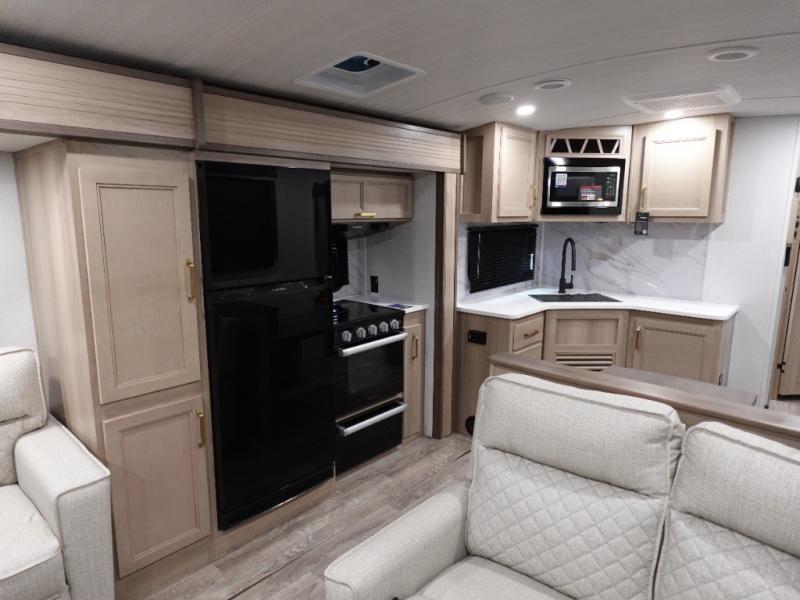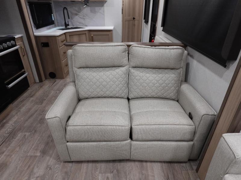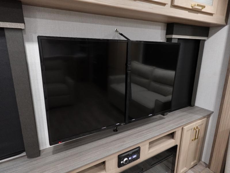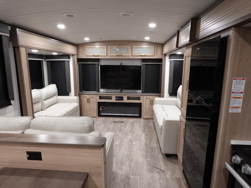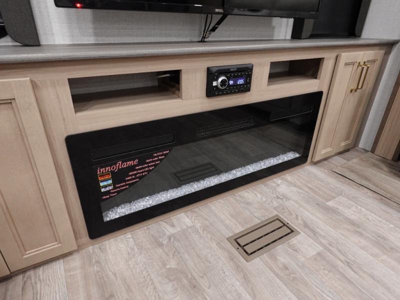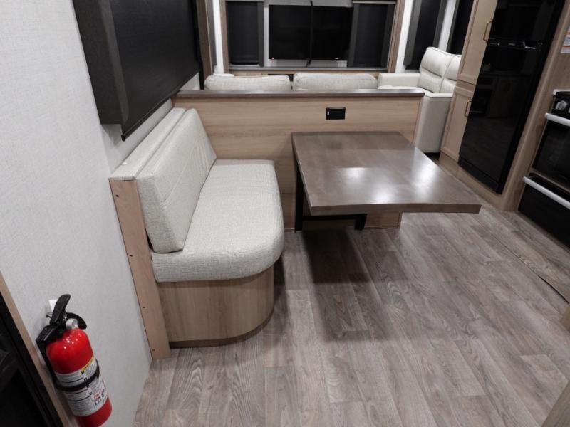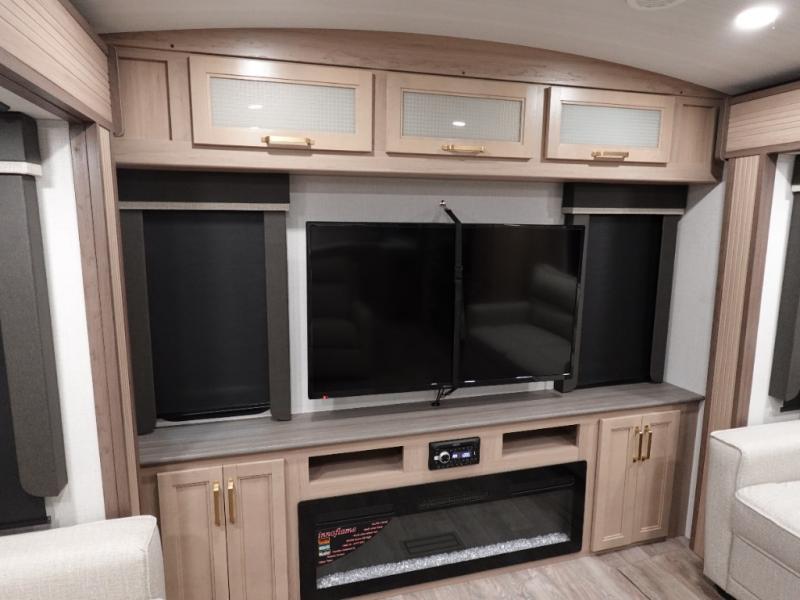 With a rear entertainment center including a 55" HDTV with fireplace below, and dual sofa sleeper slides, you will enjoy a spacious living area to visit with friends while you sit on the theater seats. The middle kitchen offers full amenities including a pantry and 10 cu. ft. refrigerator to store lots of food to feed everyone. The bench dinette seating allows you to dine or work in this area. Everyone will appreciate easy access to the double entry bathroom, especially you when it's nighttime and you are sleeping on the king bed slide out. Your family pet will have their own space, and you will find plenty of storage choices, plus there is washer/dryer prep if you want to the option to make laundry day easier.