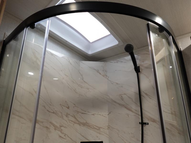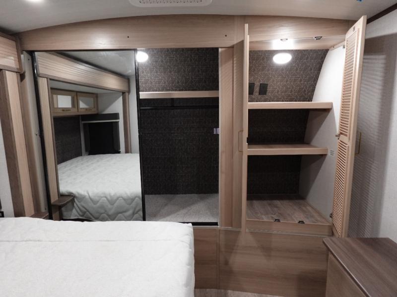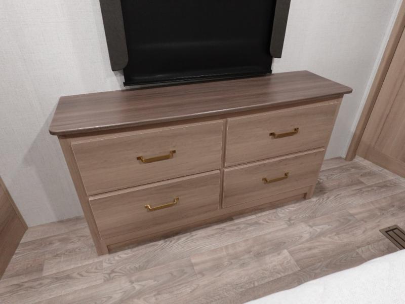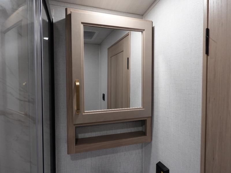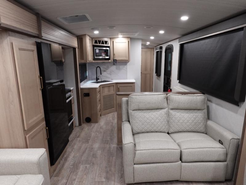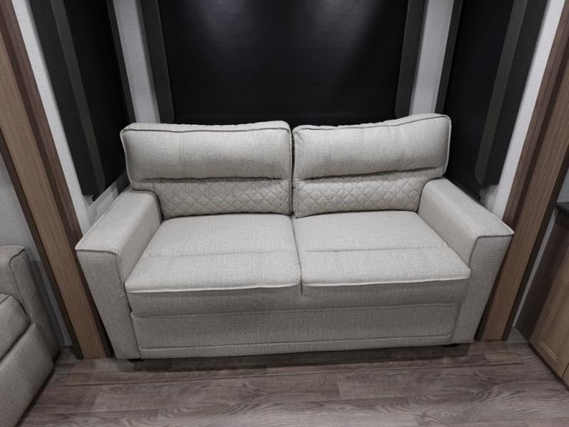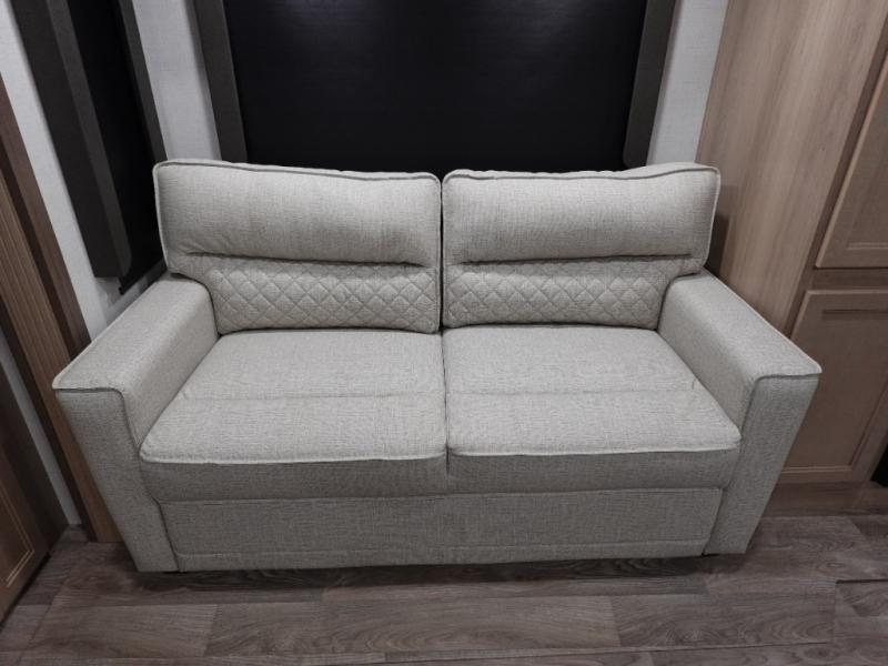 With a rear entertainment center including a 55" HDTV with fireplace below, and dual sofa sleeper slides, you will enjoy a spacious living area to visit with friends while you sit on the theater seats. The middle kitchen offers full amenities including a pantry and 10 cu. ft. refrigerator to store lots of food to feed everyone. The bench dinette seating allows you to dine or work in this area. Everyone will appreciate easy access to the double entry bathroom, especially you when it's nighttime and you are sleeping on the king bed slide out. Your family pet will have their own space, and you will find plenty of storage choices, plus there is washer/dryer prep if you want to the option to make laundry day easier.