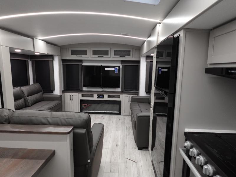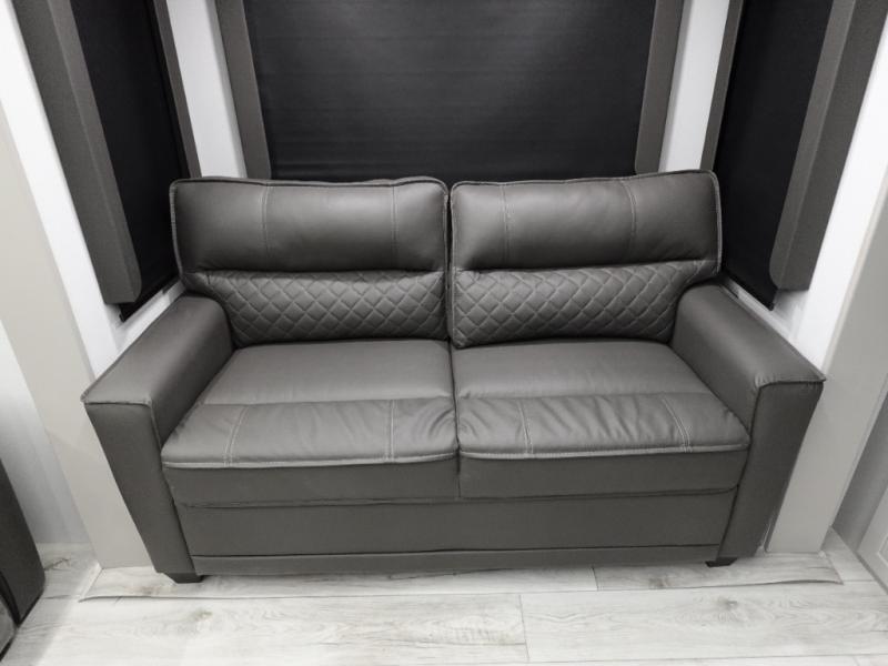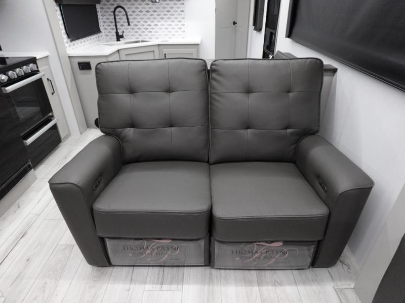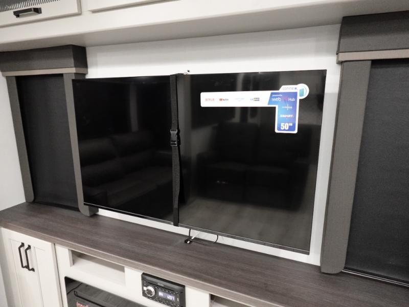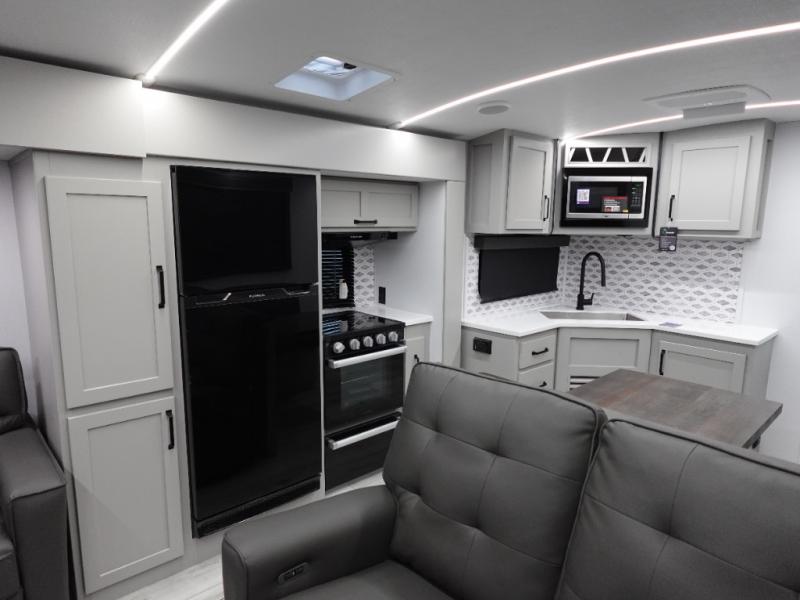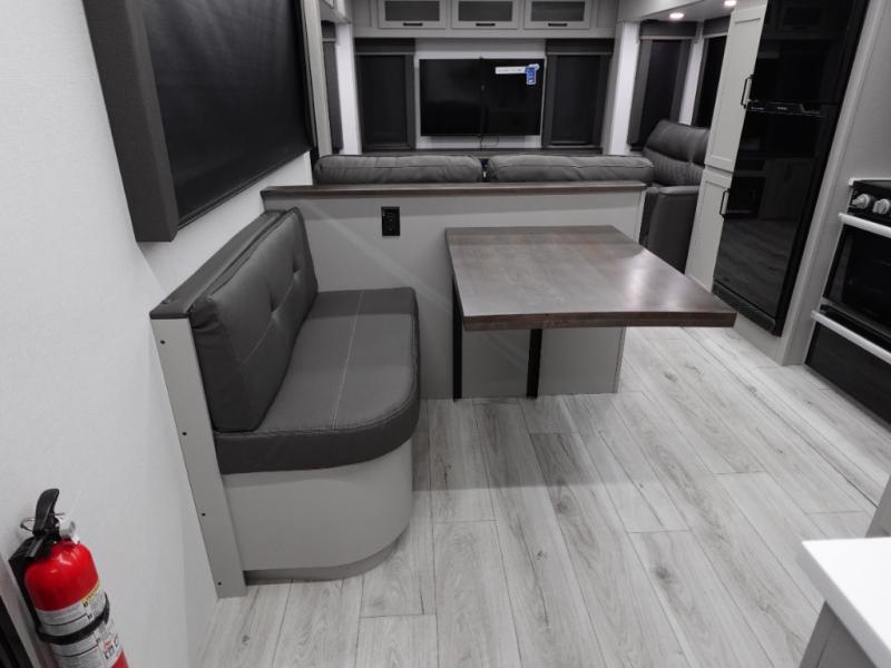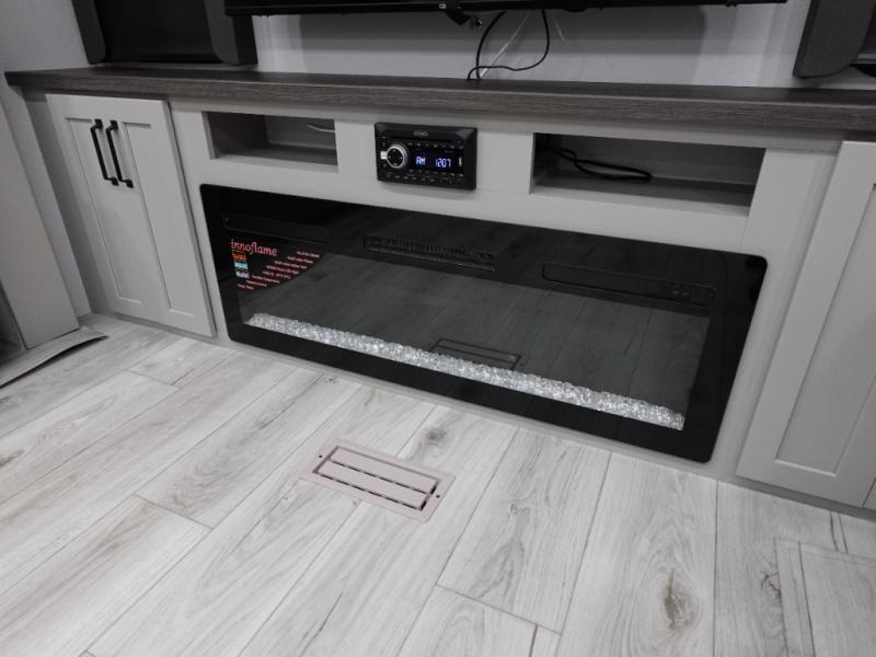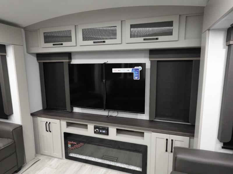 With a rear entertainment center including a 55" HDTV with fireplace below, and dual sofa sleeper slides, you will enjoy a spacious living area to visit with friends while you sit on the theater seats. The middle kitchen offers full amenities including a pantry and 10 cu. ft. refrigerator to store lots of food to feed everyone. The bench dinette seating allows you to dine or work in this area. Everyone will appreciate easy access to the double entry bathroom, especially you when it's nighttime and you are sleeping on the king bed slide out. Your family pet will have their own space, and you will find plenty of storage choices.